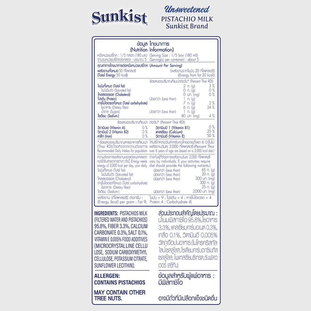 ซันคิสท์ นมพิสทาชิโอ รสไม่หวาน 946 มล. (ยกลัง) Sunkist Unsweetened Pistachio milk 946 ml. x 12