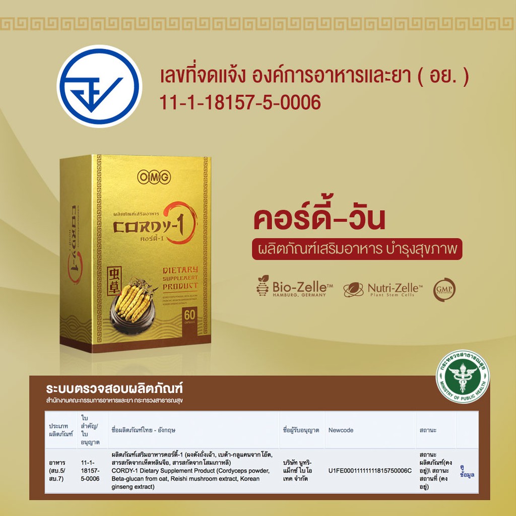 OMG Cordy-1 ถั่งเช่าทิเบตราชาแห่งสมุนไพร ปริมาณสูงถึง 850 มก. ทาน 1 ได้ถึง 4 ถั่งเช่า เห็ดหลินจือ โสม เบต้ากลูแคน