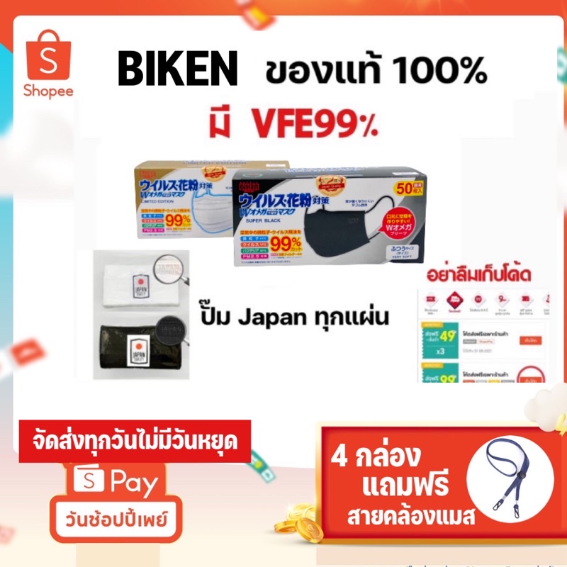 ของแท้ม ีปั๊ม* biken หน้ากากอนามัยญี่ปุ่น VFE99% สีดำ สีขาว 50ชิ้น