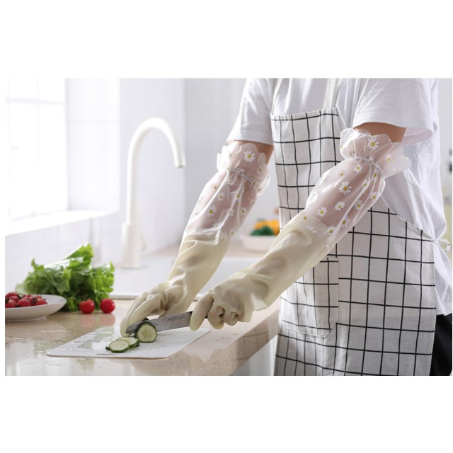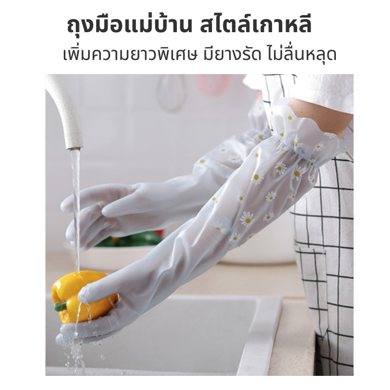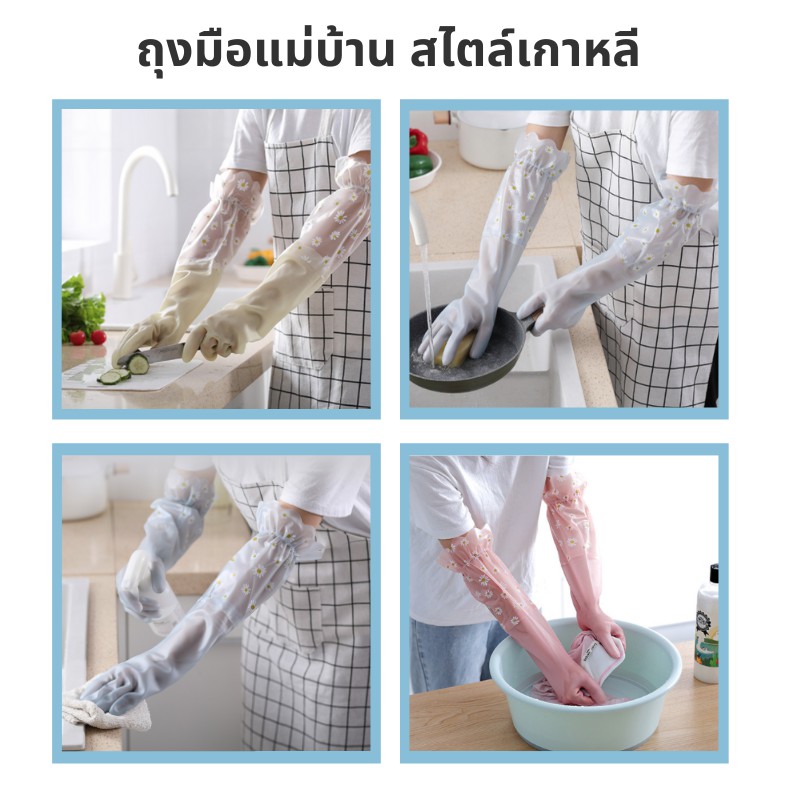 MM รุ่นให ม่! ถุงมือแม่บ้านสไตล์ญี่ปุ่น เกาหลี ลายดอกไม้ ถุงมือยาง ถุงมือยาว มียางรัด ไม่ลื่นหลุด ความยาว 50 ซม.