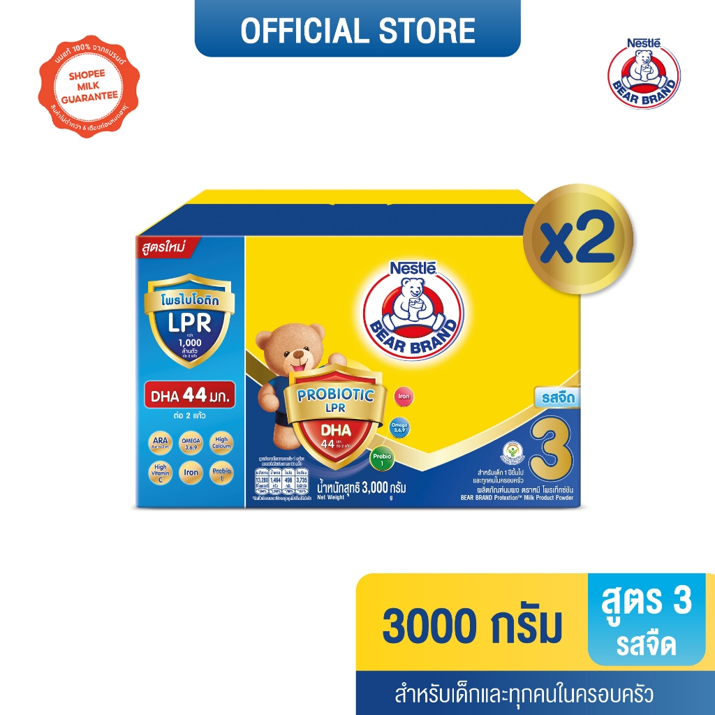 [นมผง] BEAR BRAND นมผง ตราหมี โพรเท็กชั่นสูตร 3 รสจืด 3000 กรัม นมผงสำหรับเด็กอายุ 1 ปีขึ้นไปและทุกคนในครอบครัว(2 กล่อง)