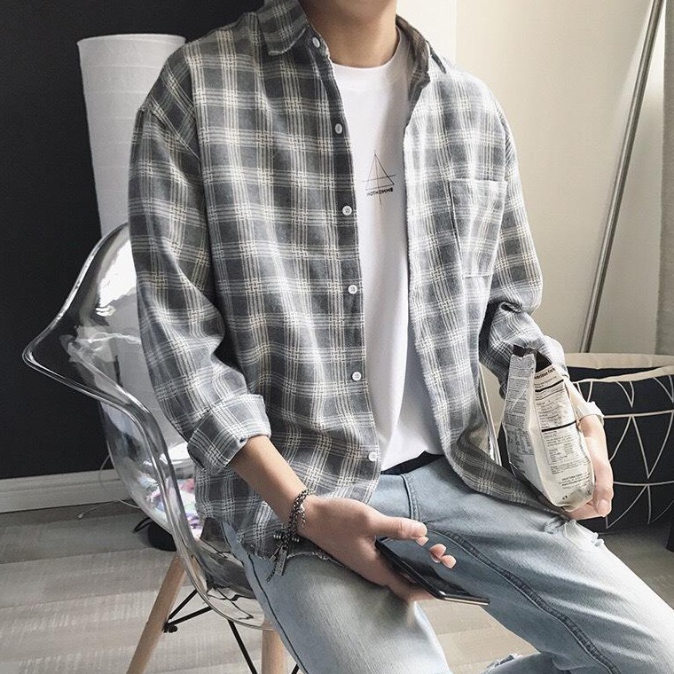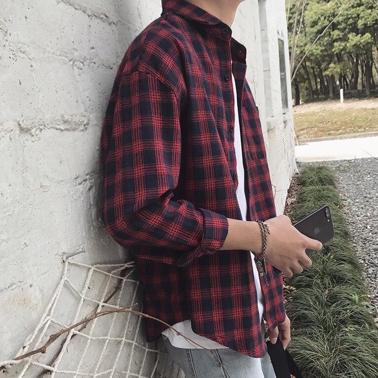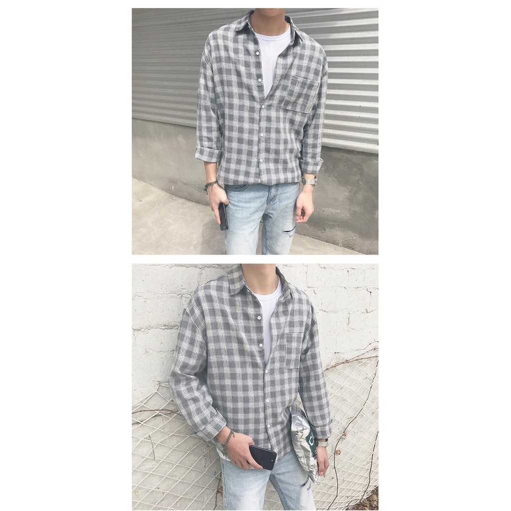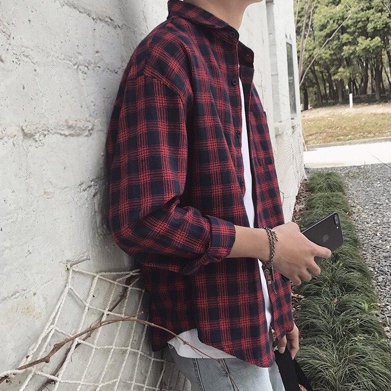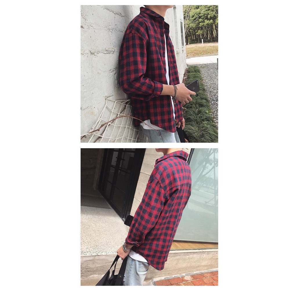 SMT003เสื้อเชิ้ตชายลายสก๊อต +1ไซส์ เวอร์ชั่นเกาหลีของฤดูใบไม้ร่วง เสื้อหลวมใส่สบาย ๆ ไซส์ M-XXL สีGray,Red