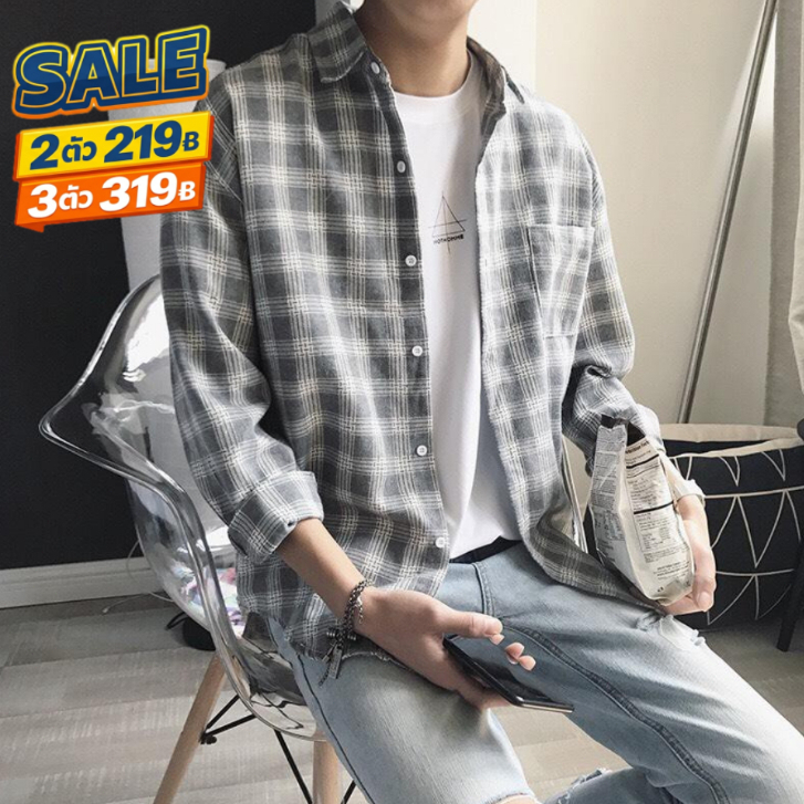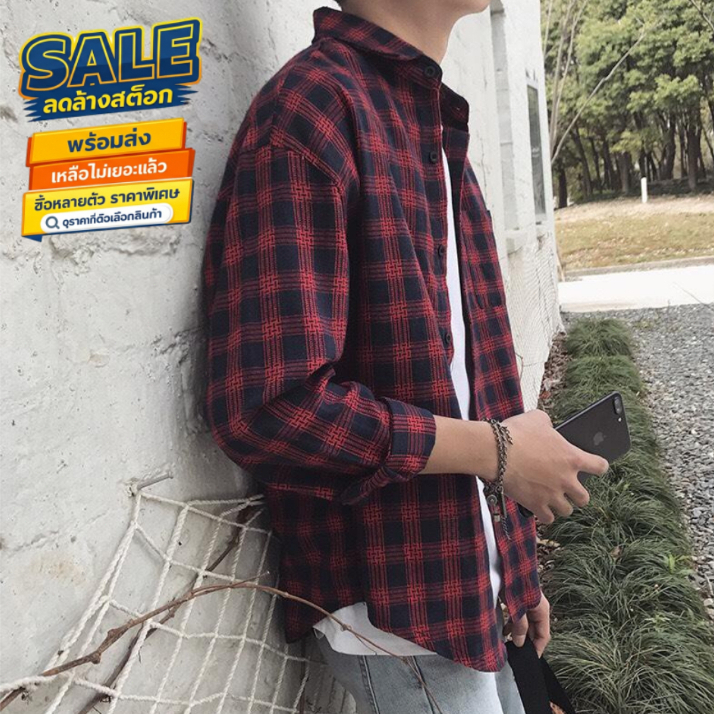 🔥 ล้างสต็อก 🔥 SMT003เสื้อเชิ้ตชายลายสก๊อต +1ไซส์ เวอร์ชั่นเกาหลีของฤดูใบไม้ร่วง เสื้อหลวมใส่สบาย ๆ ไซส์ M-XXL
