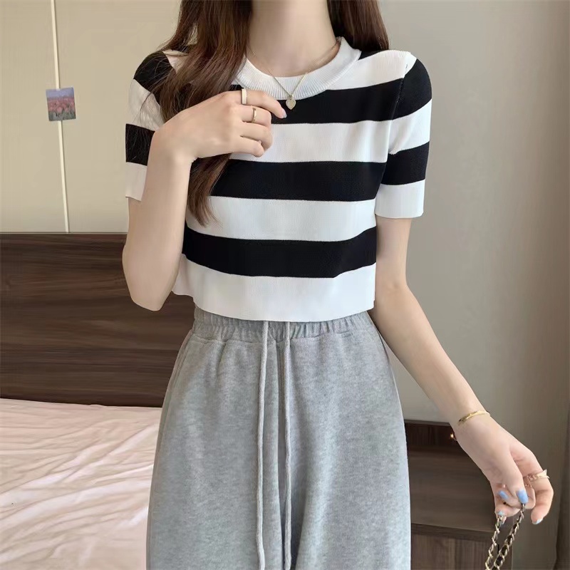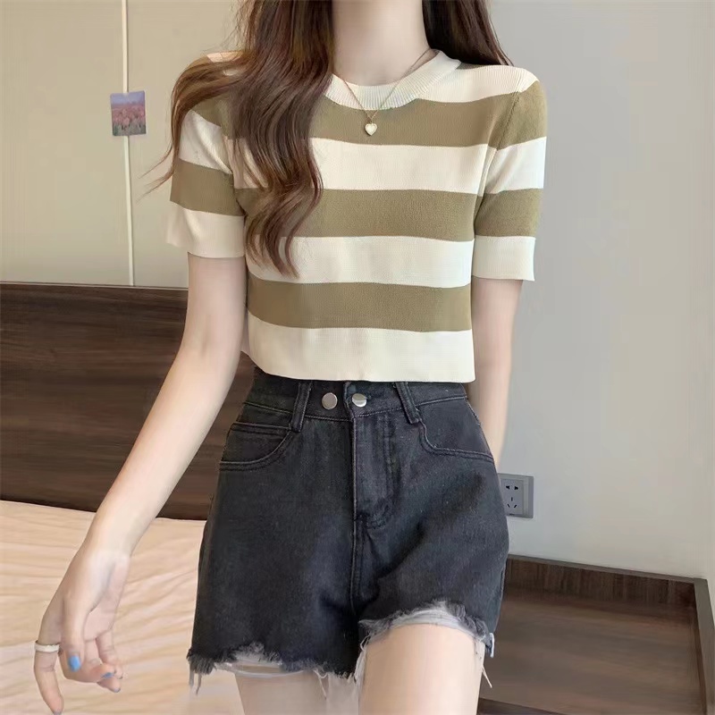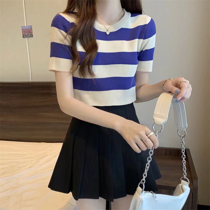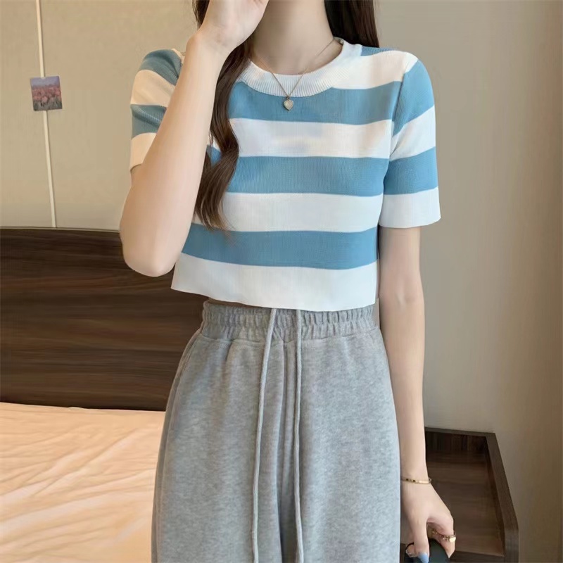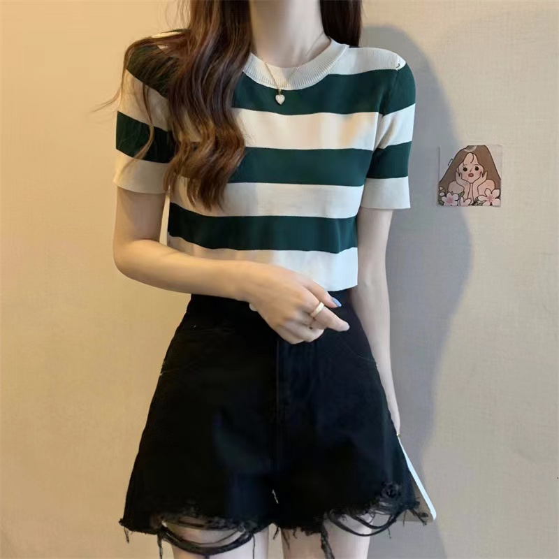 Bonnie(พร้อมส่ง/ใหม่)#A482-1เสื้อยืดแขนสั้นผู้หญิงลายทาง2022 ฤดูร้อนใหม่เสื้อไหมพรมคอกลมสไตล์เกาหลี