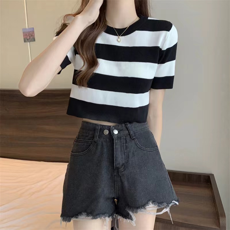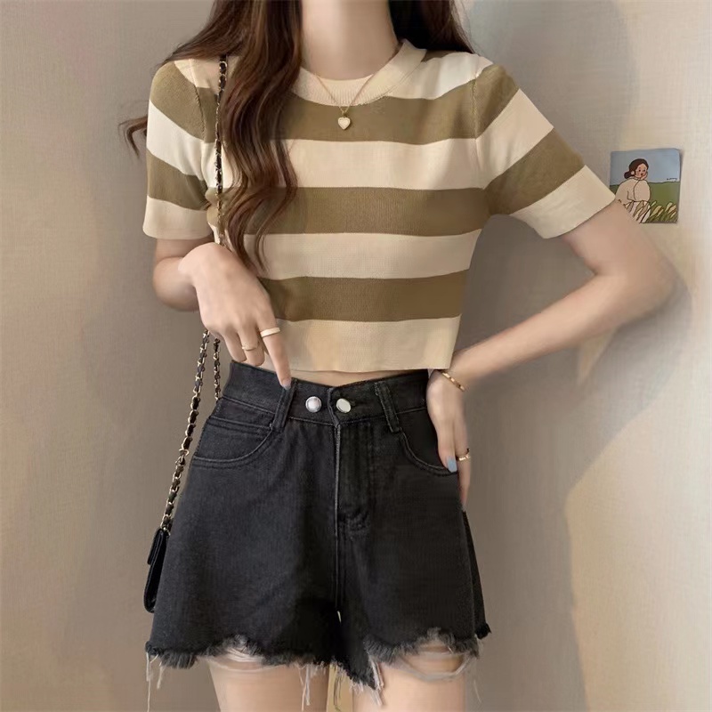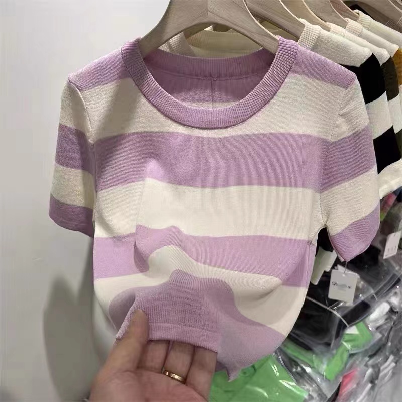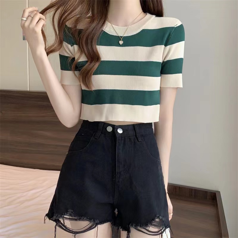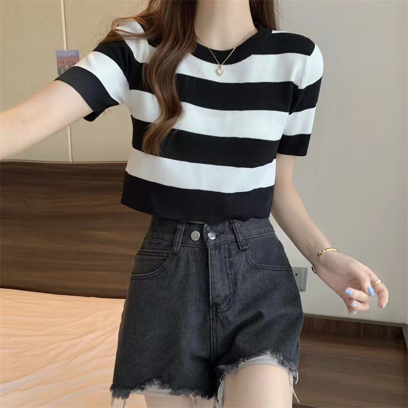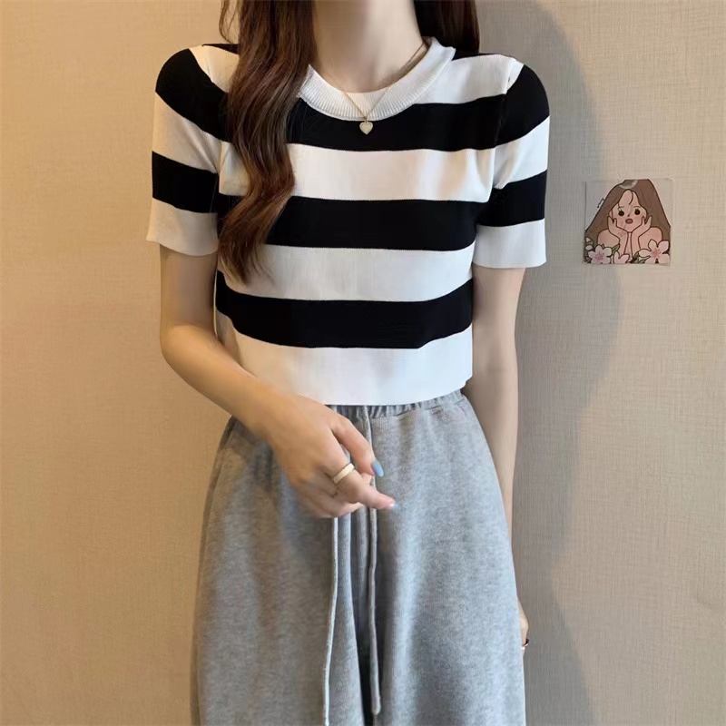 Bonnie(พร้อมส่ง/ใหม่)#A482-1เสื้อยืดแขนสั้นผู้หญิงลายทาง2022 ฤดูร้อนใหม่เสื้อไหมพรมคอกลมสไตล์เกาหลี