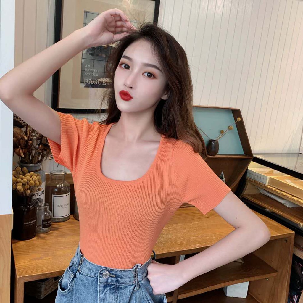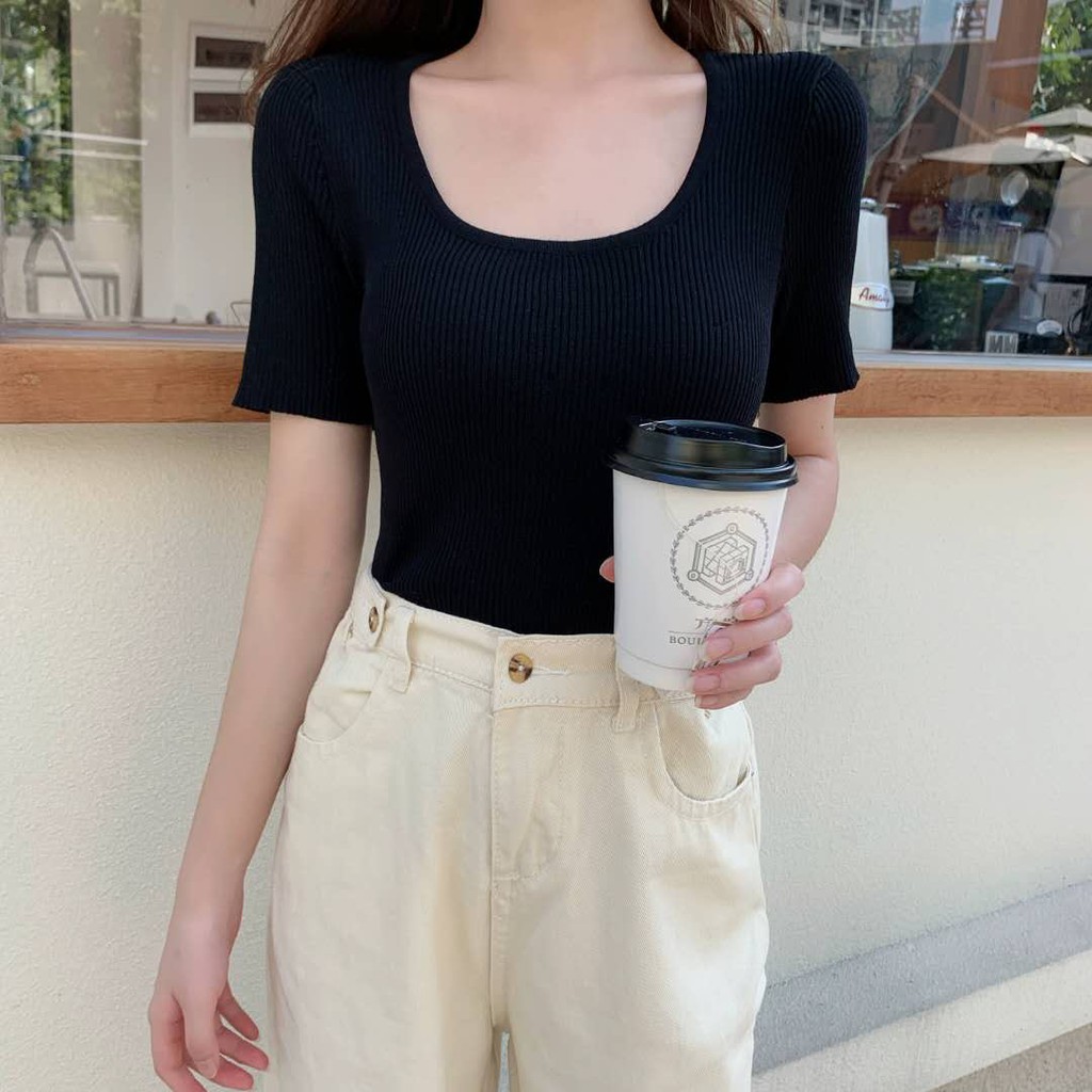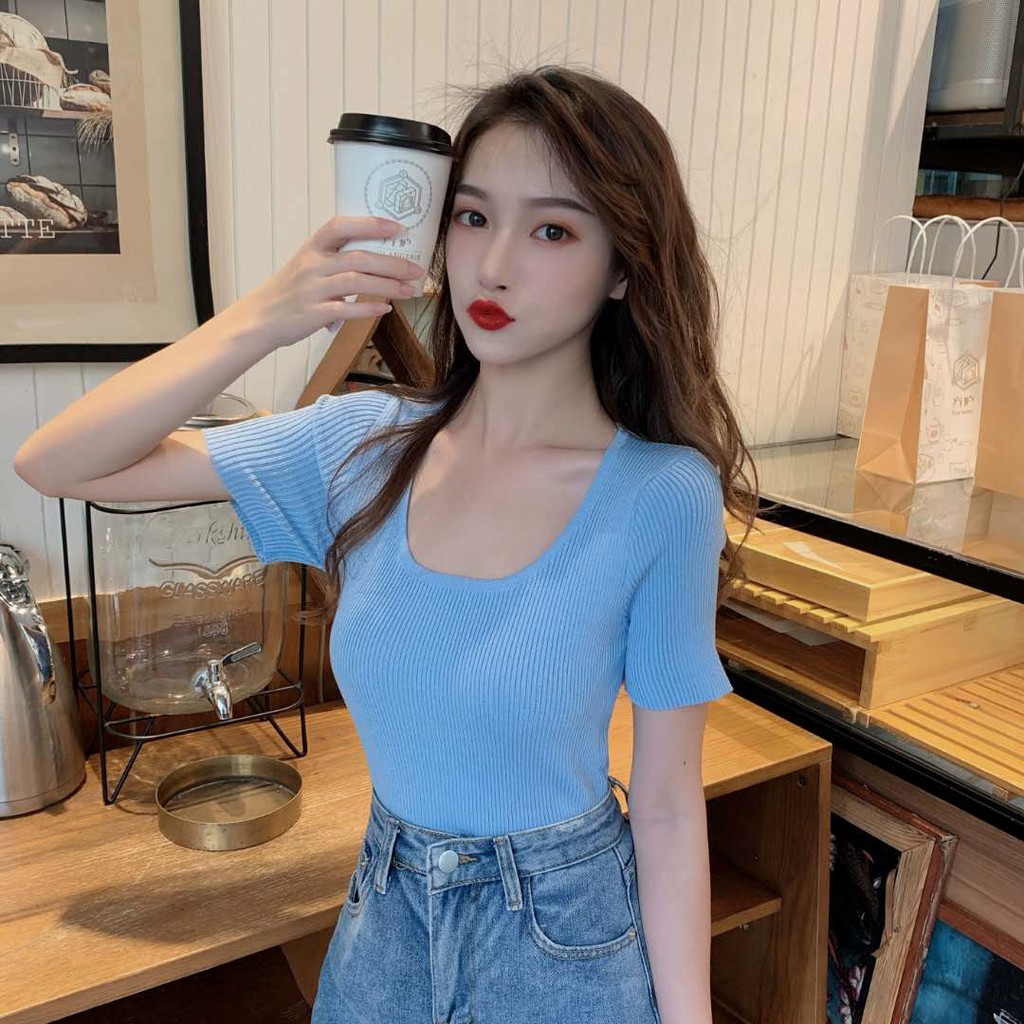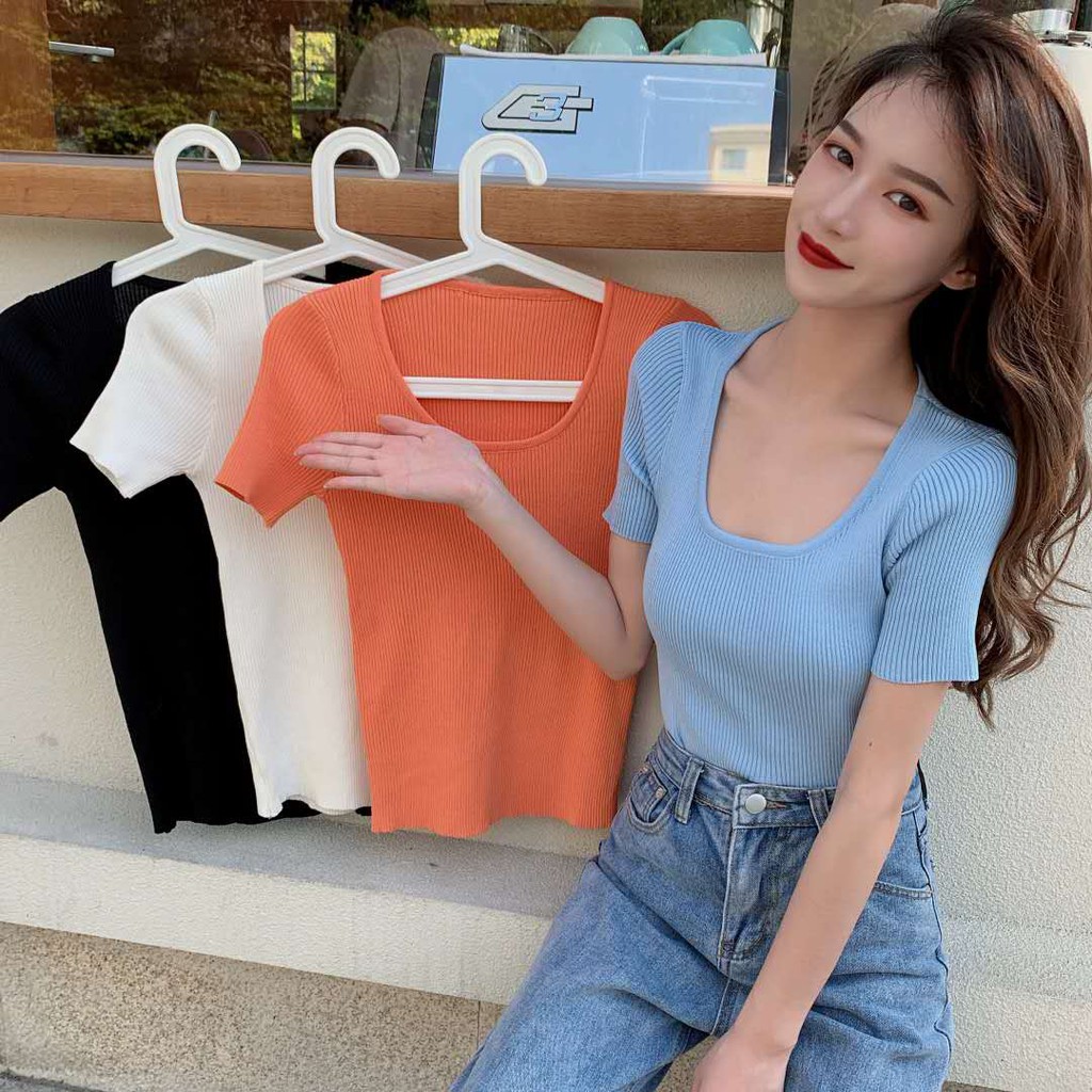 Bonnie(พร้อมส่ง/ใหม่)รุ่น#002-3เสื้อไหมพรมคอเหลี่ยมแขนสั้นทรงรัดรูปสไตล์เกาหลี