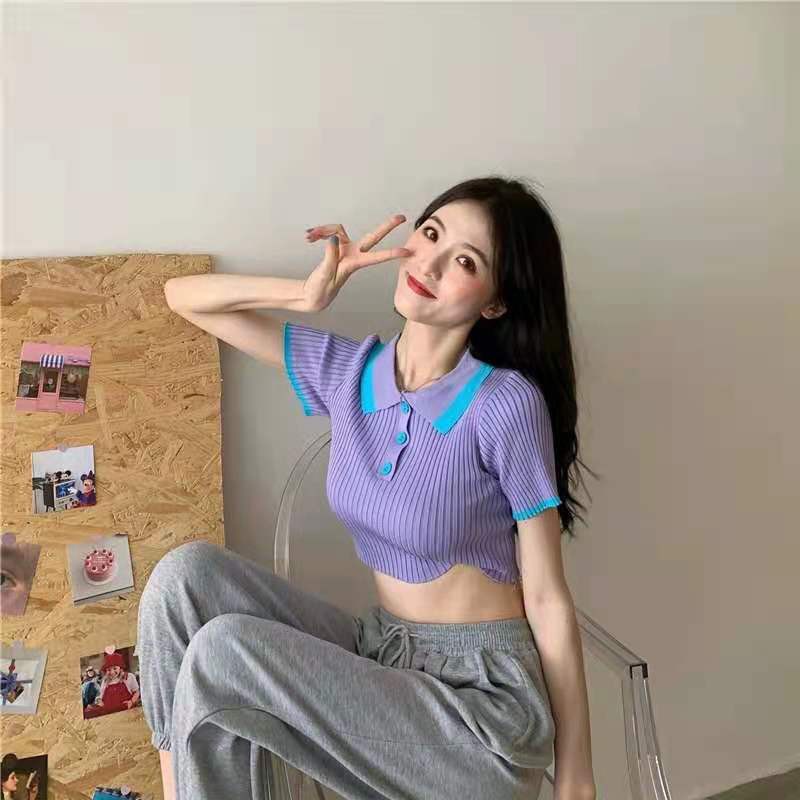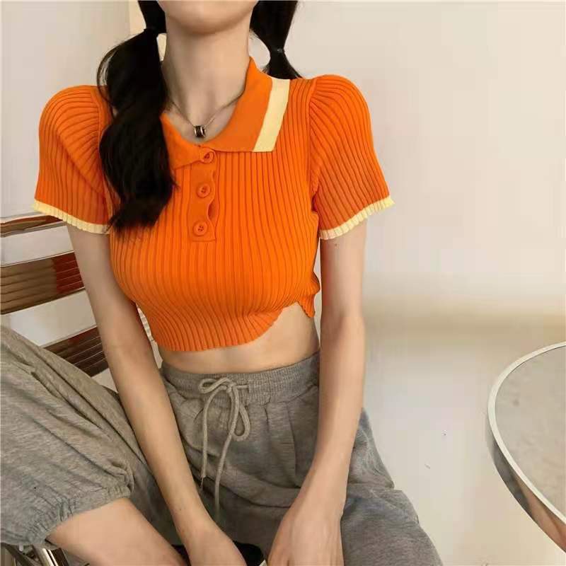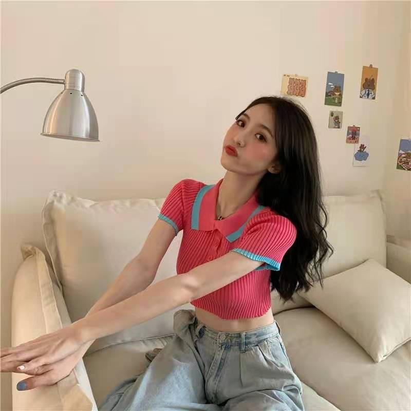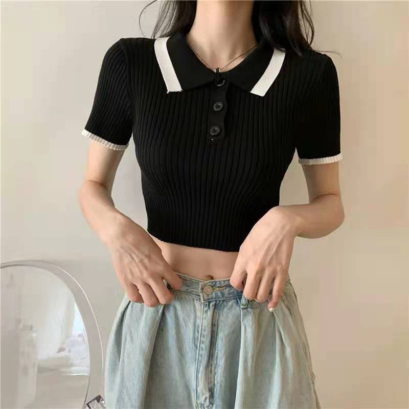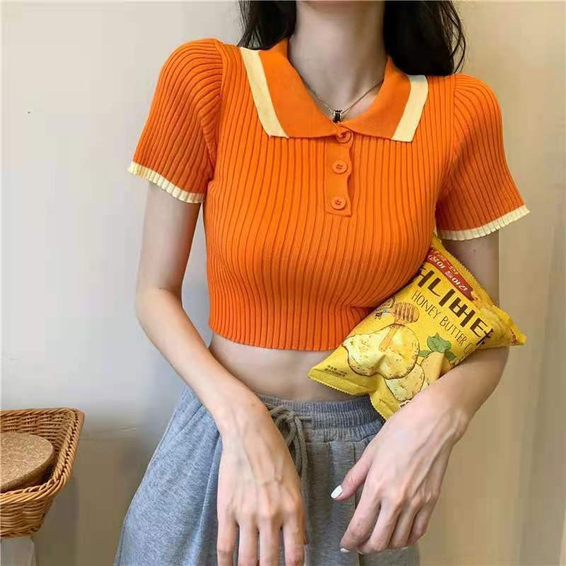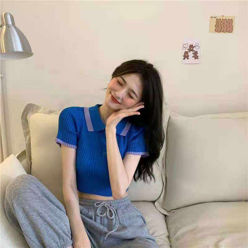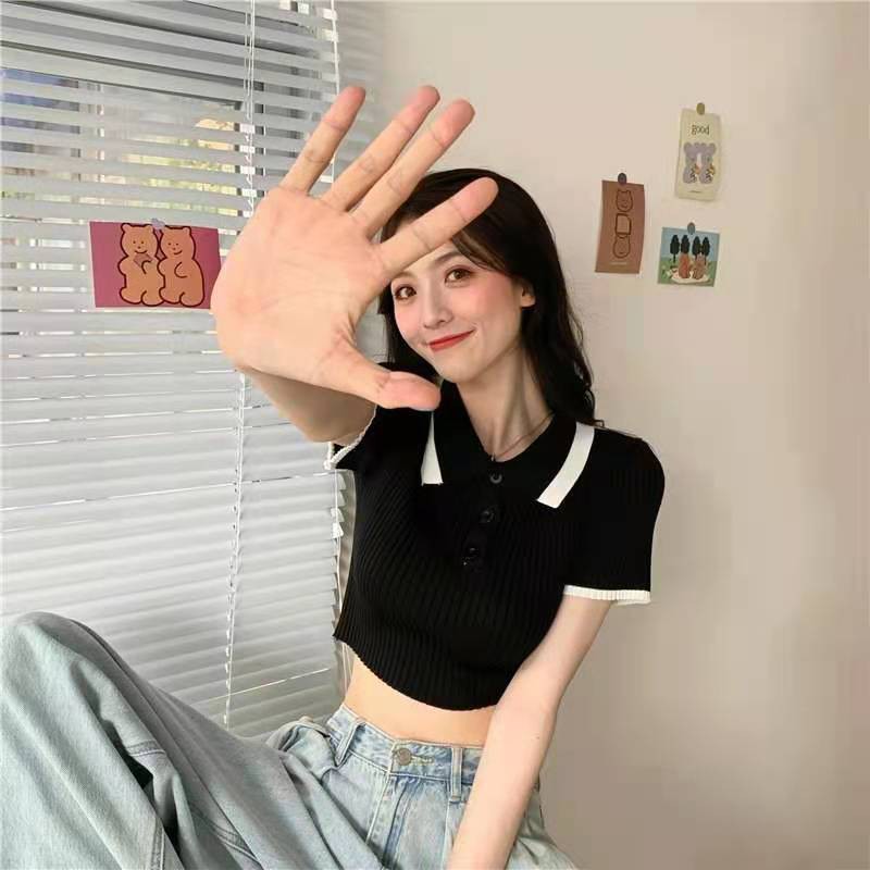 bonniefashion(พร้อมส่ง/ใหม่)5935# เสื้อครอปแขนสั้นคอปกสีพื้นงานไหมพรมสไตล์เกาหลี