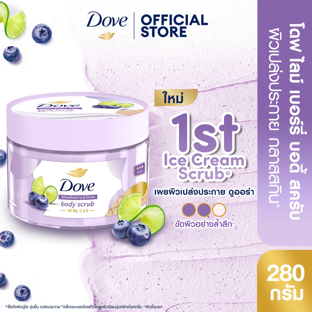 โดฟ บอดี้สครับไอศกรีม 280ก ขัดผิว ชุ่มชื้น 10 เท่า สครับผิว ลดผิวลอก ผสมสกินแคร์ มี 4 สูตร ไนอะซินาไมด์ วิตามินอี AHA