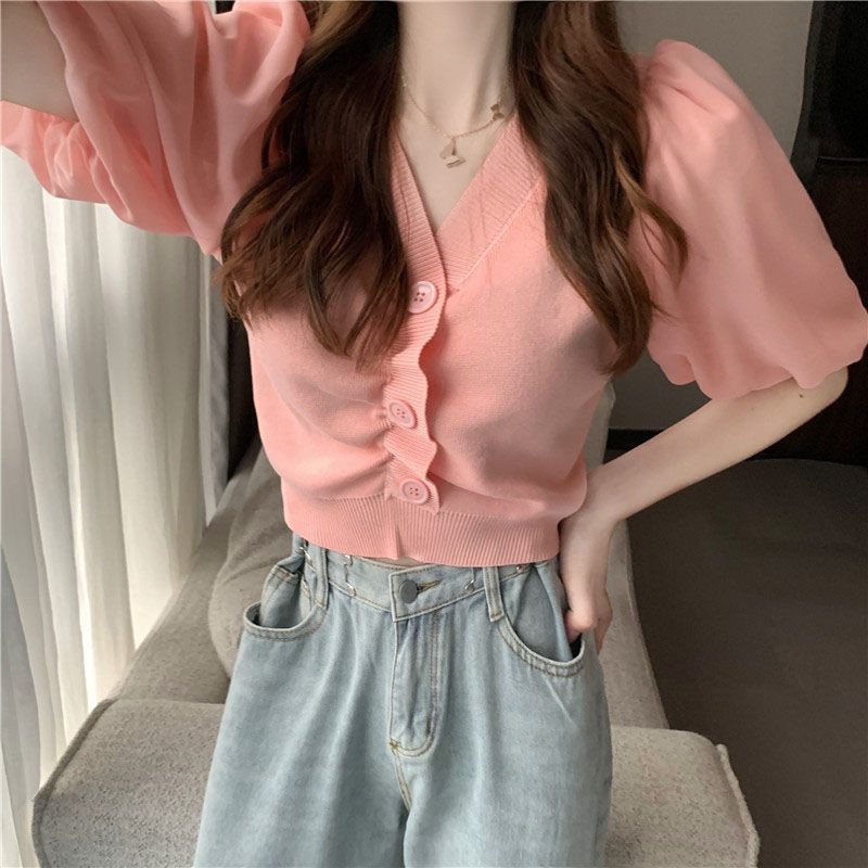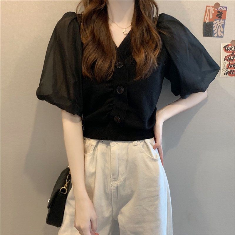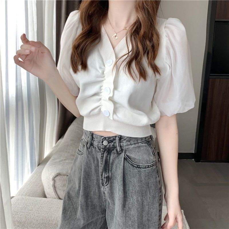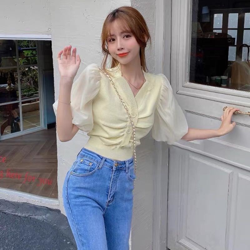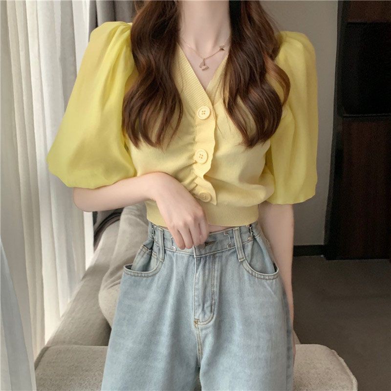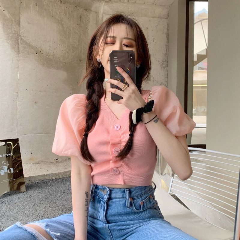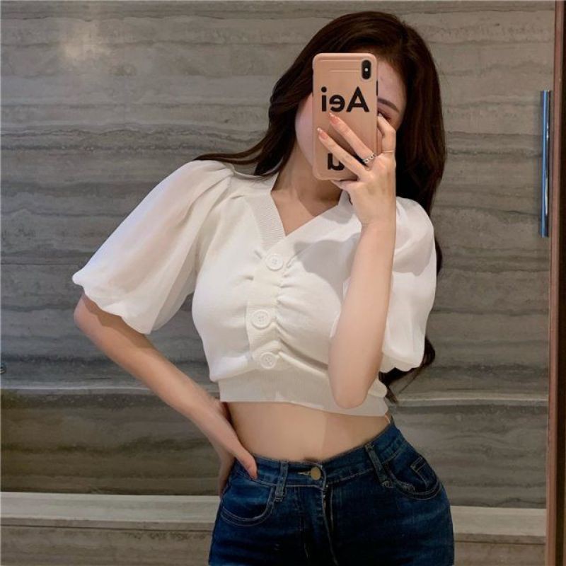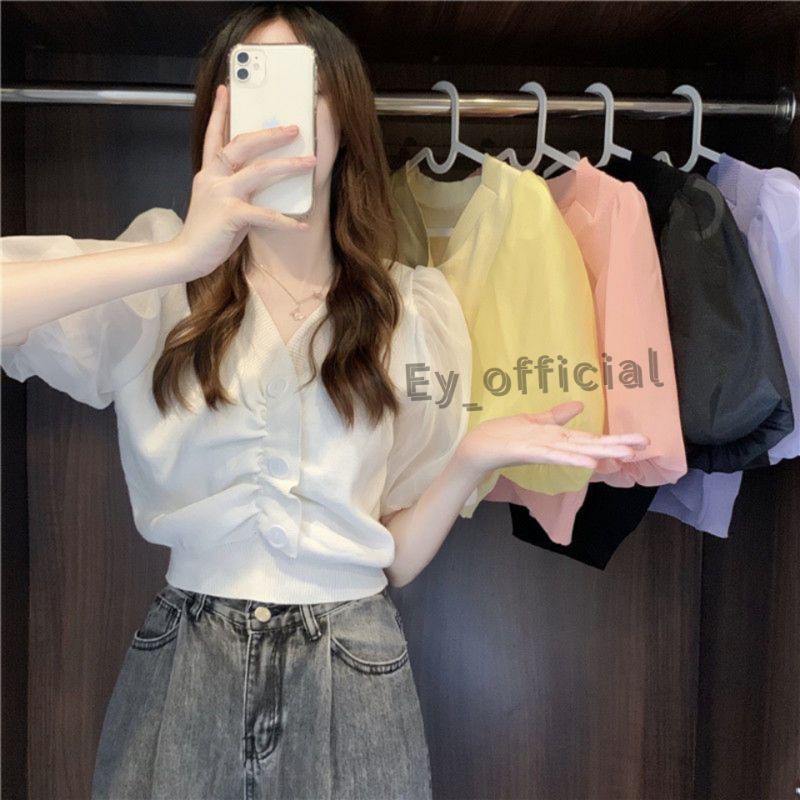Ey_official#1993-1#(พร้อมส่ง)เสื้อครอปแขนสั้นช่วงแขนเป็นผ้าซีฟองด้านหน้าตกแต่งด้วยกระดุม