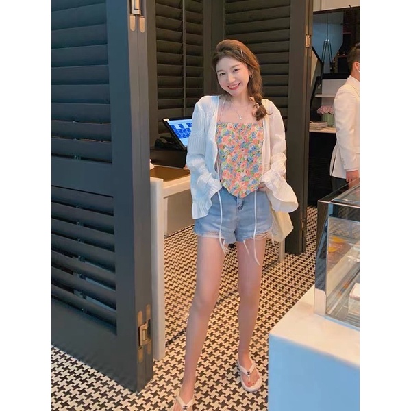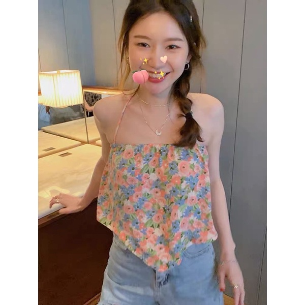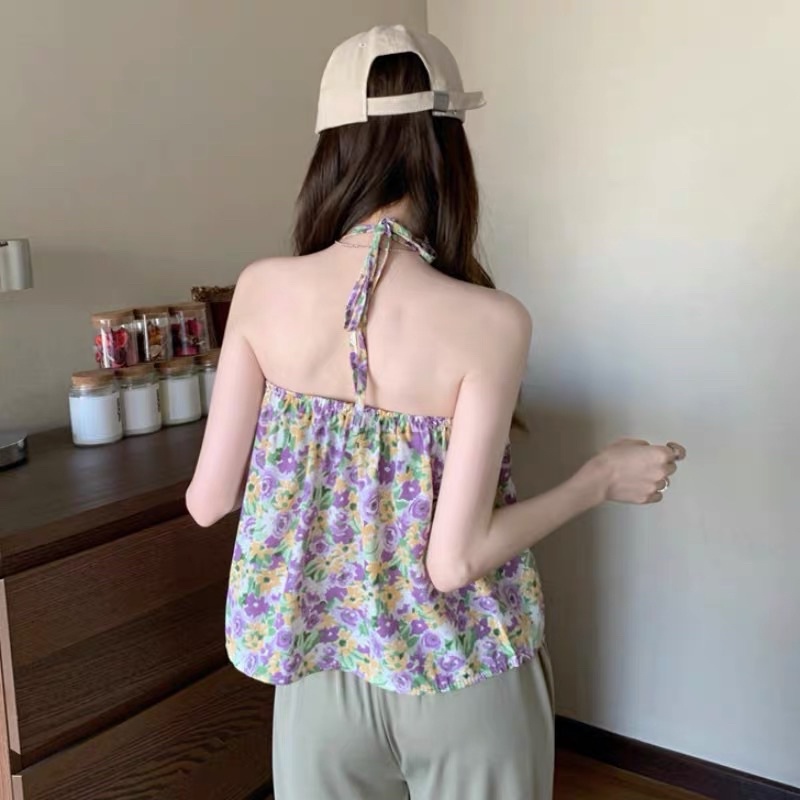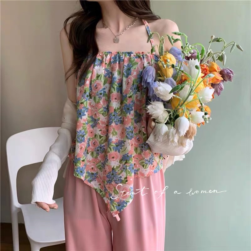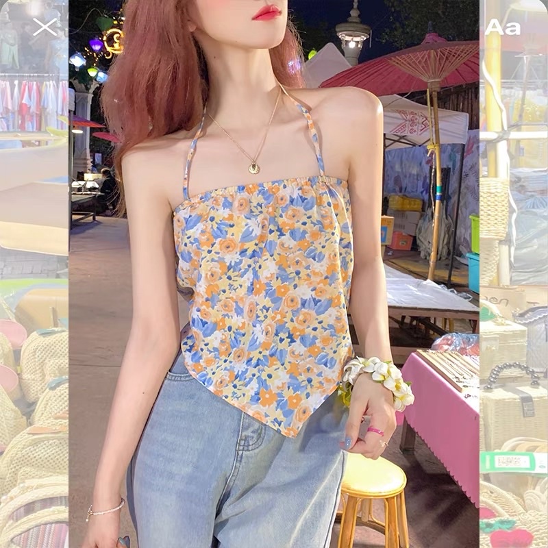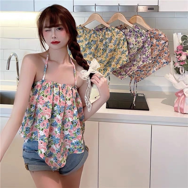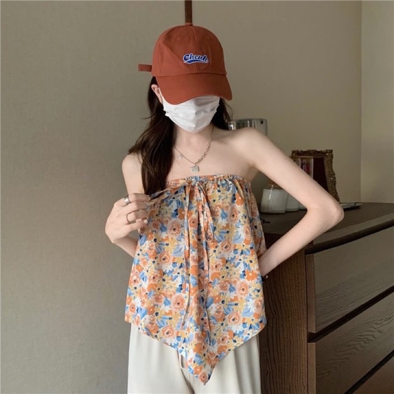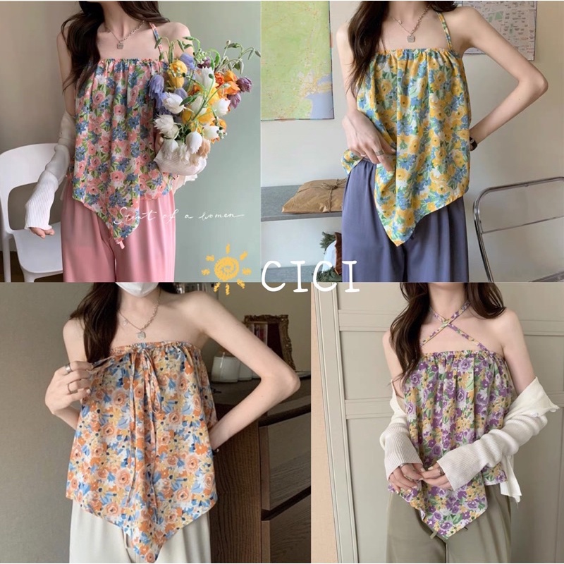 ส่งทันที Cici(NO. 11055)เสื้อเกาะอกผูกคอลายดอก เนื้อผ้าชีฟองใส่สบาย แต่งลายดอก สไตล์สาวเที่ยวคาเฟ่ มุ้งมิ้ง