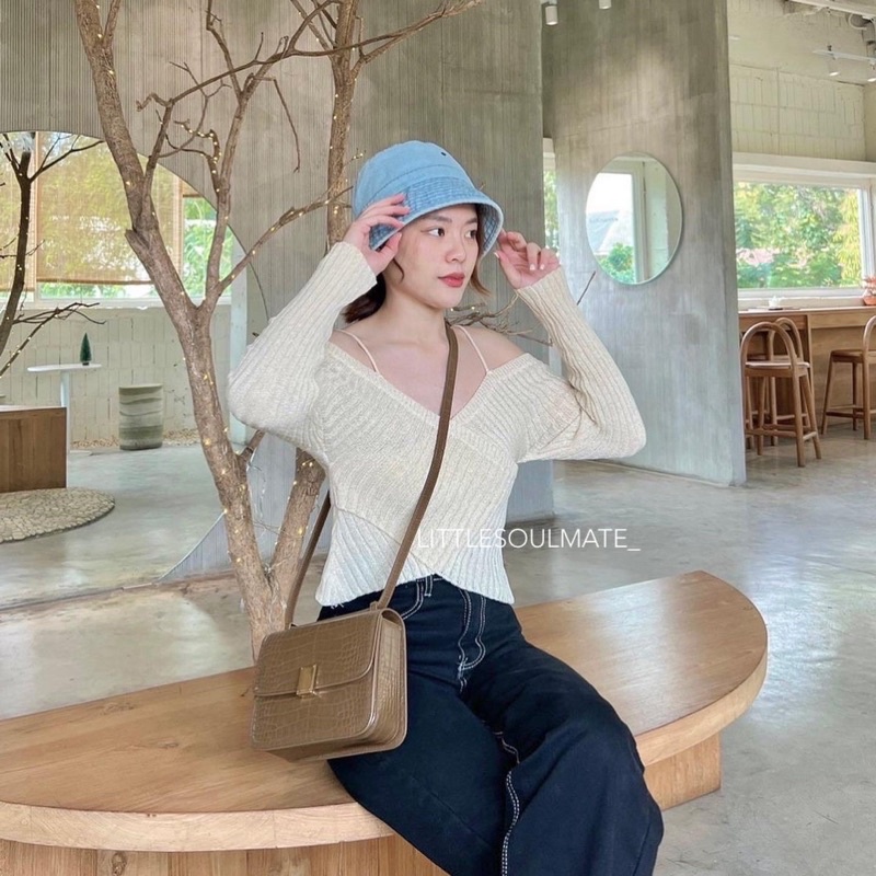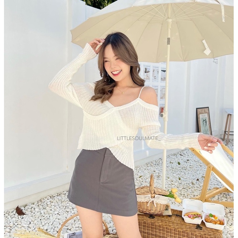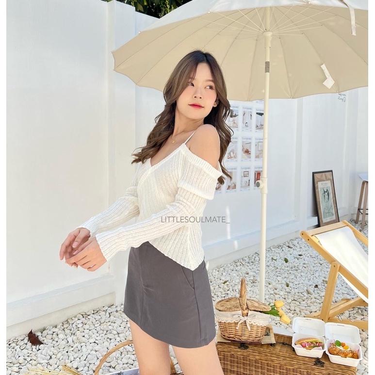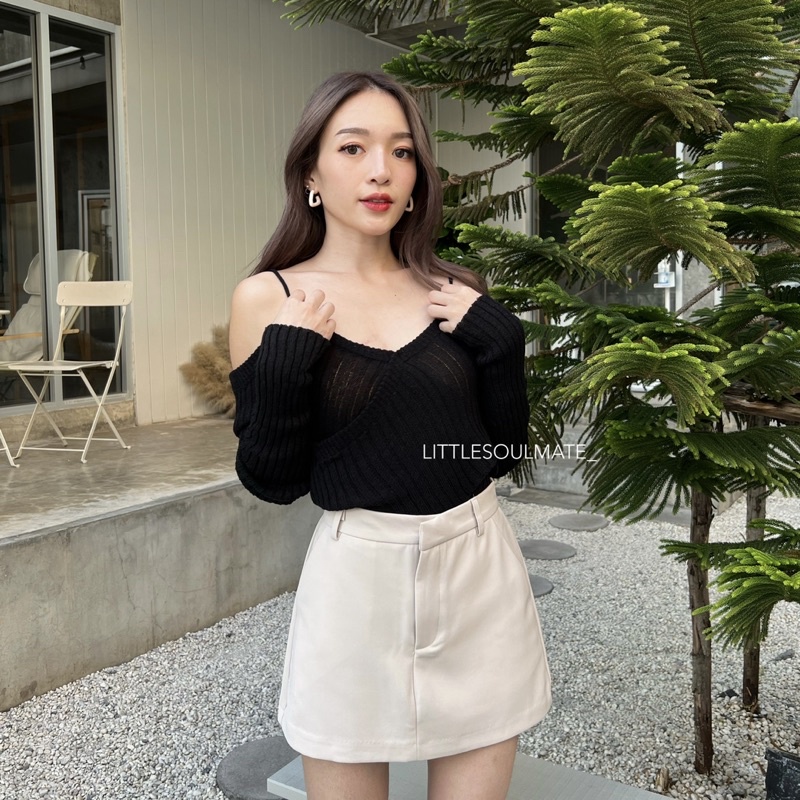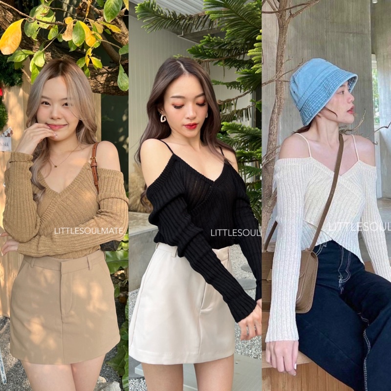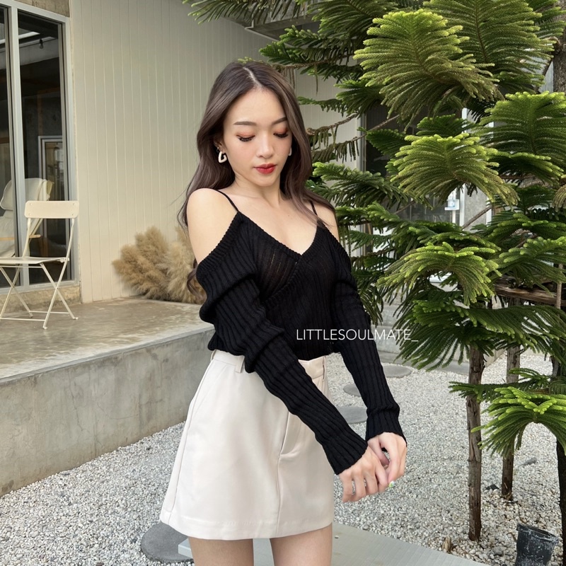 littlesoulmate เสื้อสายเดี่ยวเปิดไหล่ แต่งไขว้หน้า ผ้าไหมพรมใส่สบาย (moji)