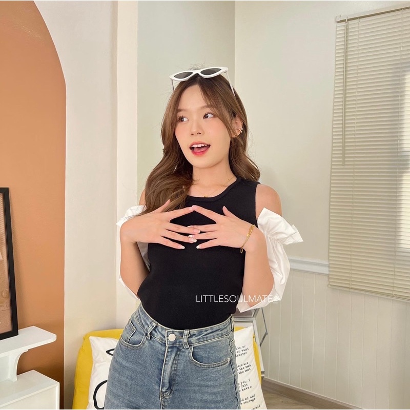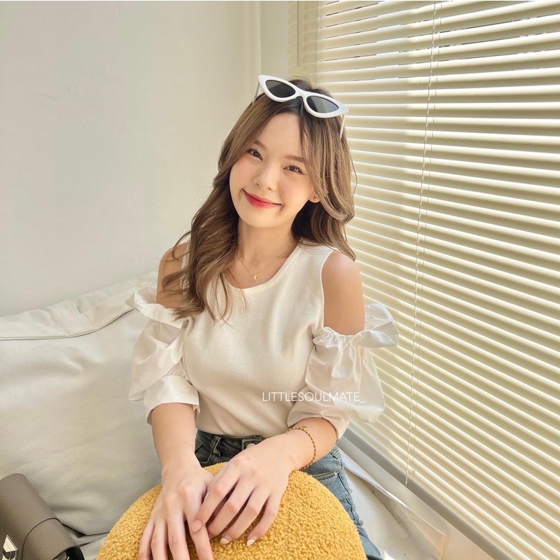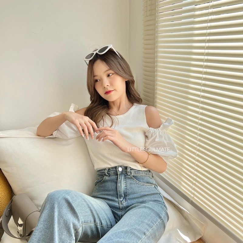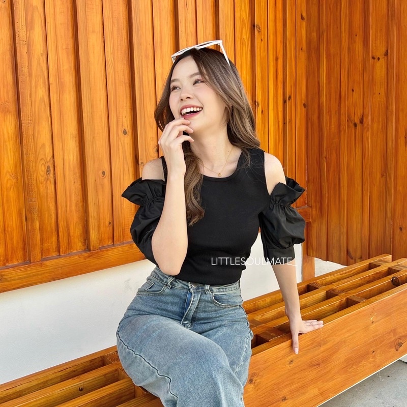 littlesoulmate เสื้อเปิดไหล่แขนพอง สไตล์เกาหลี เสื้อเปิดไหล่แขนตุ๊กตา(polar)