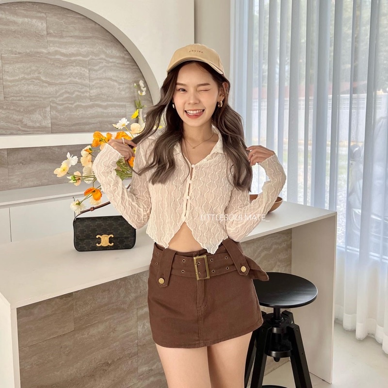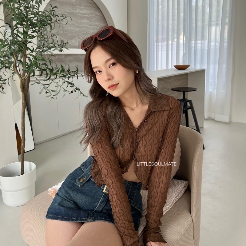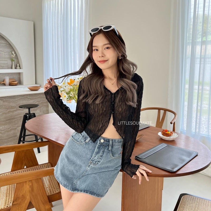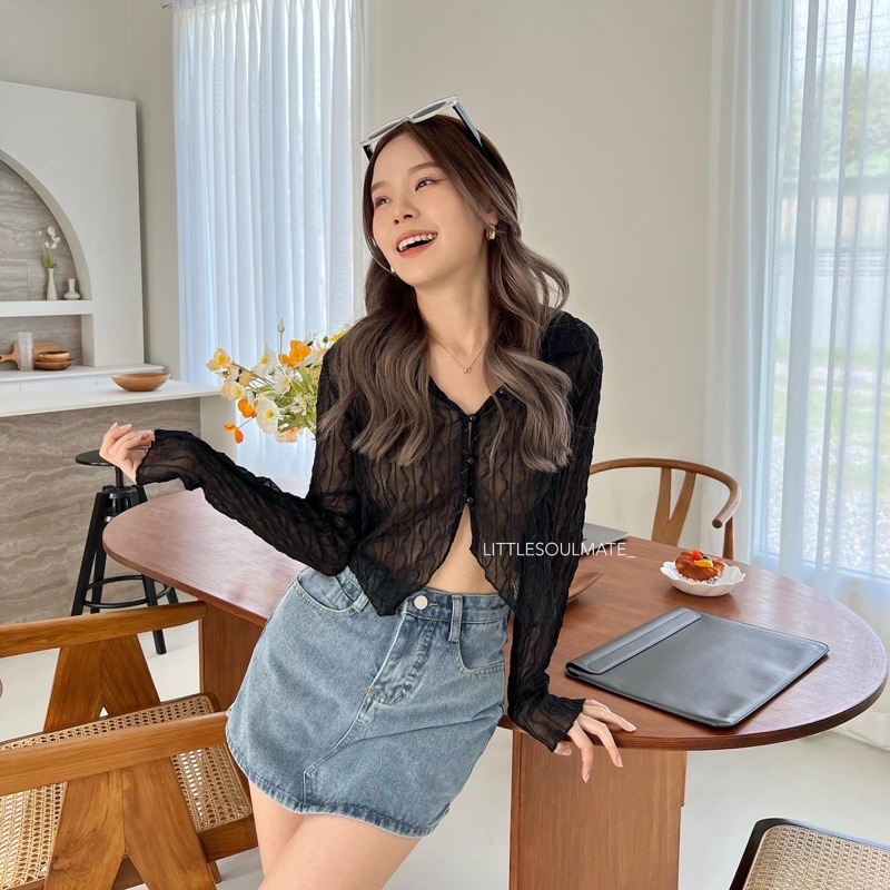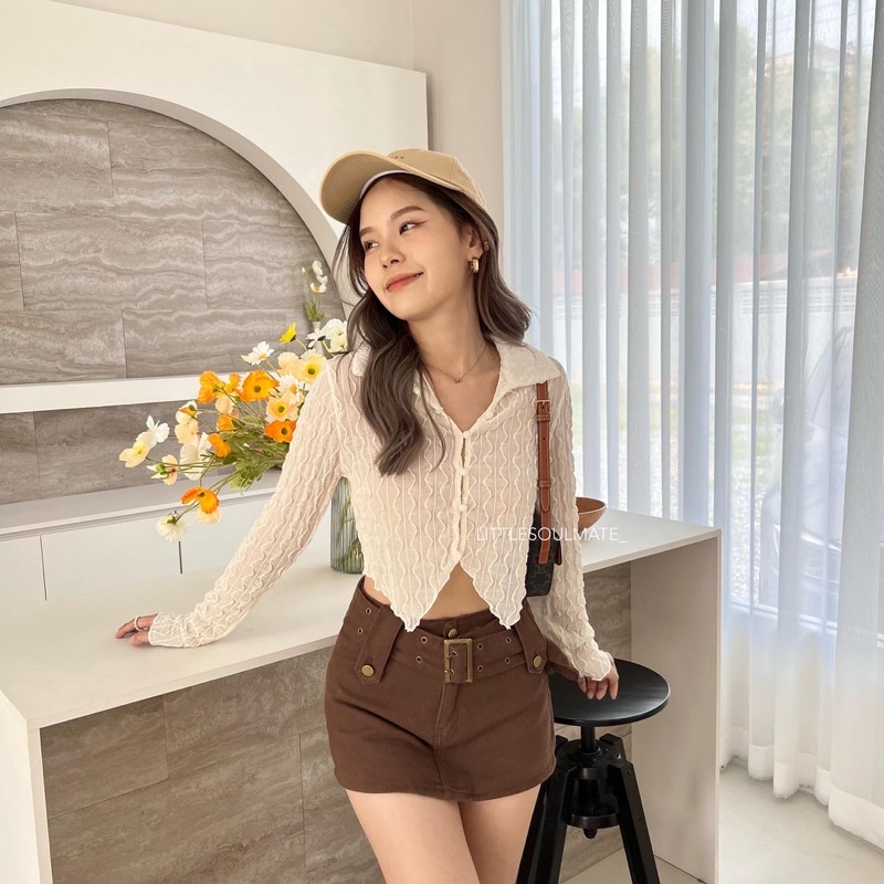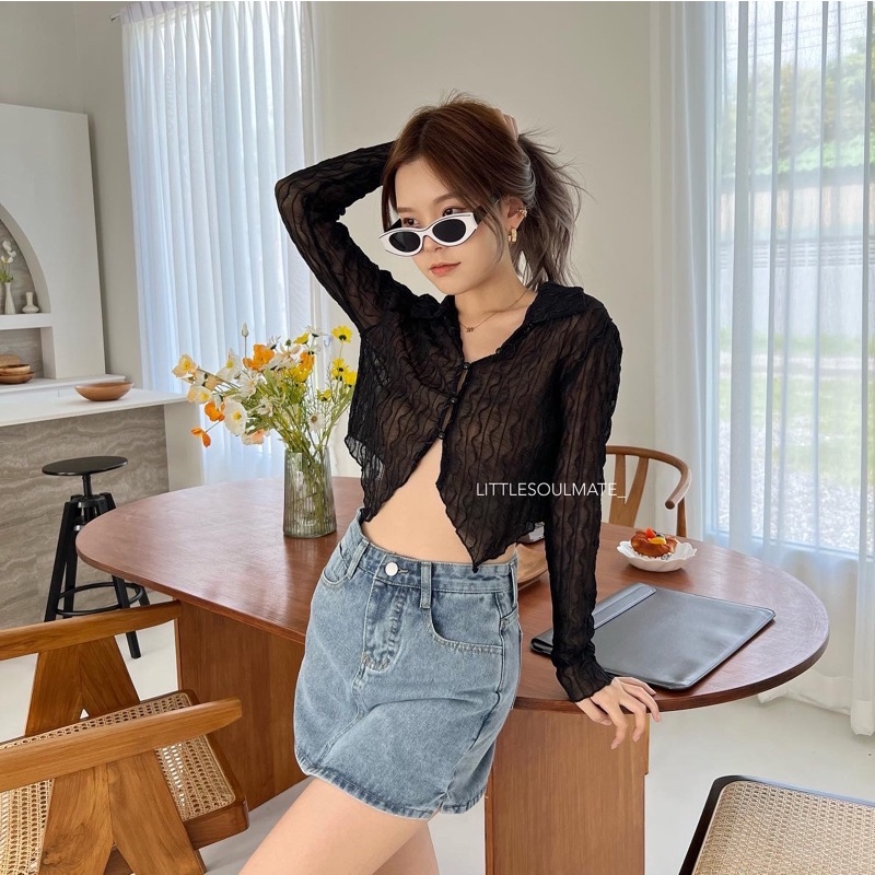 littlesoulmate เสื้อครอปเว้าเอวคอปก หน้ายาวหลังสั้น ผ้าซีทรูนิ่มใส่สบาย y2k(vintage v)