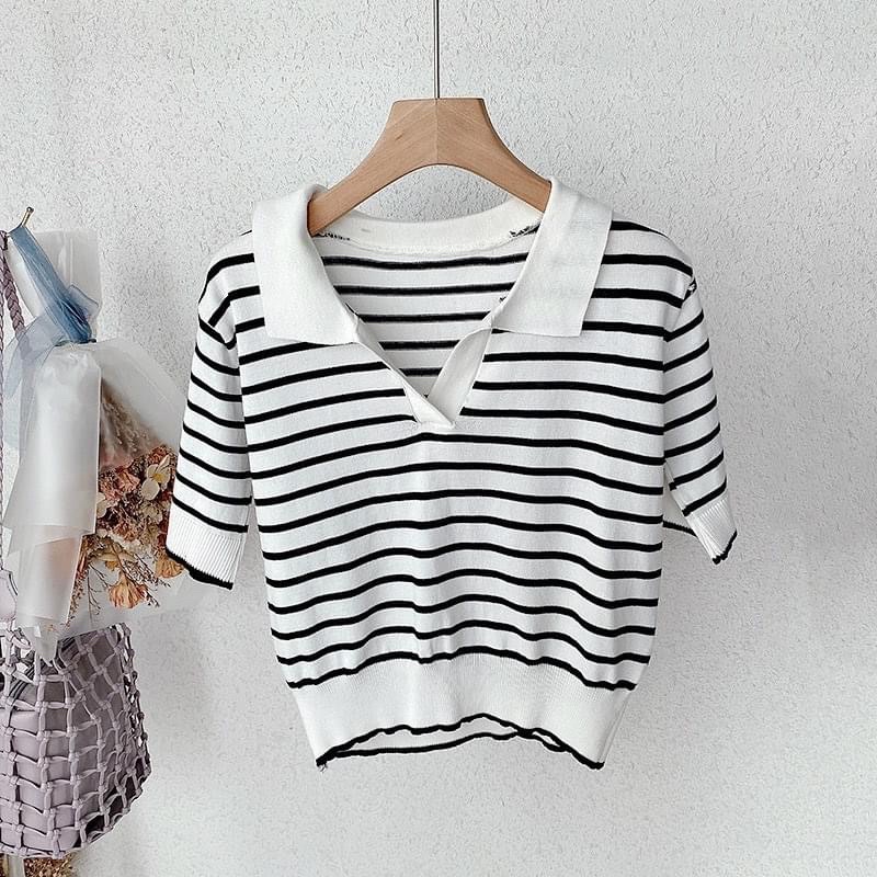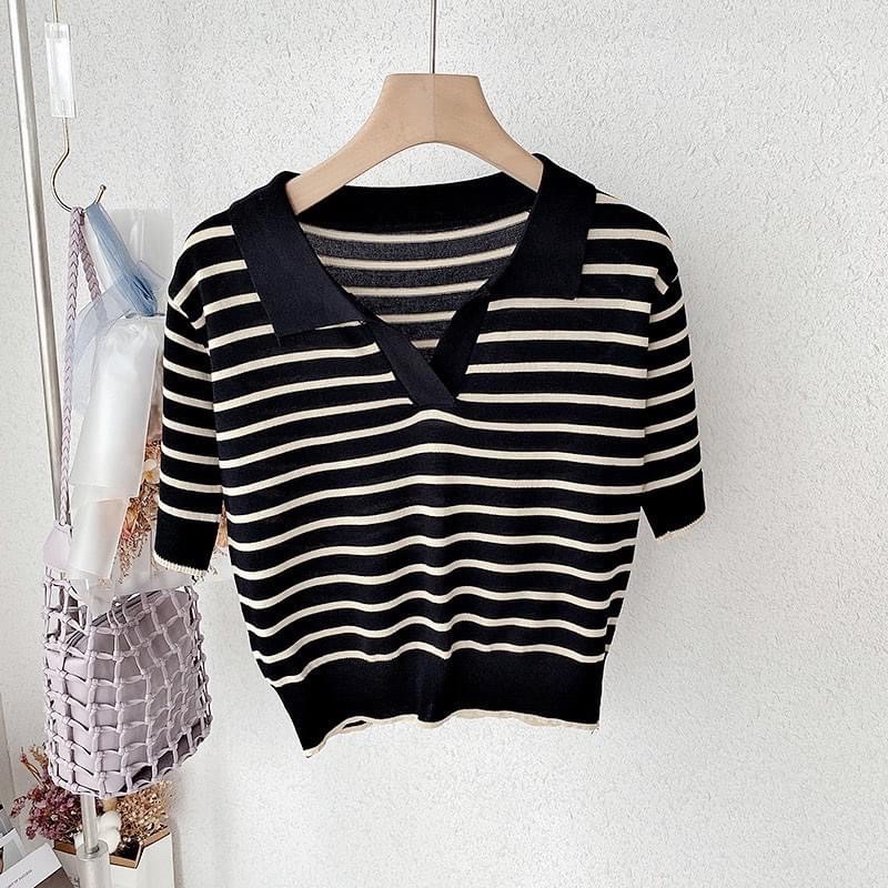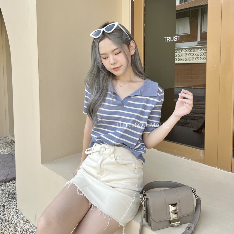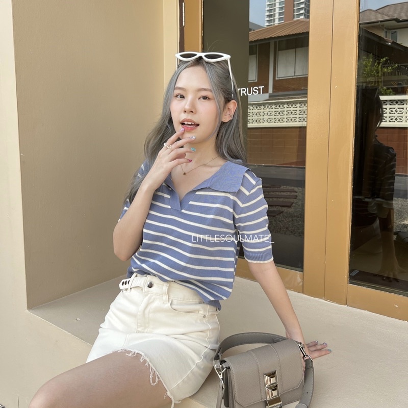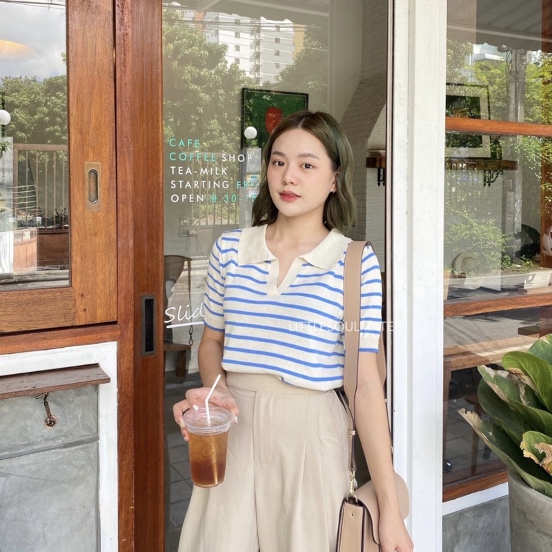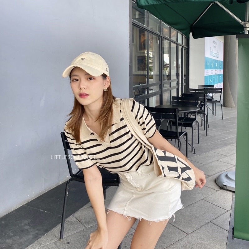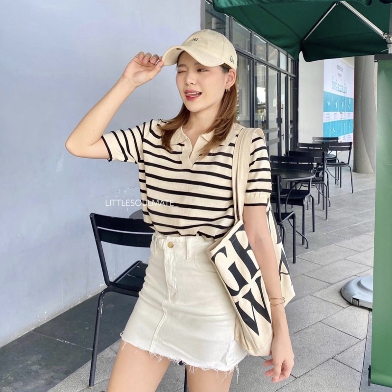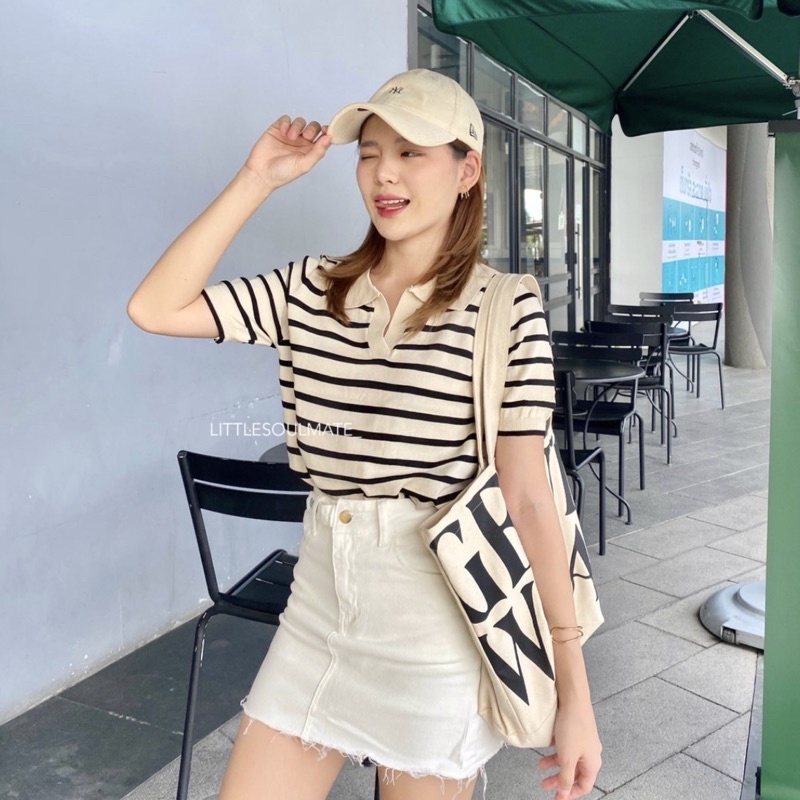 littlesoulmate เสื้อโปโลคอปก oversize ลายขวาง สไตล์เกาหลี (truffle)