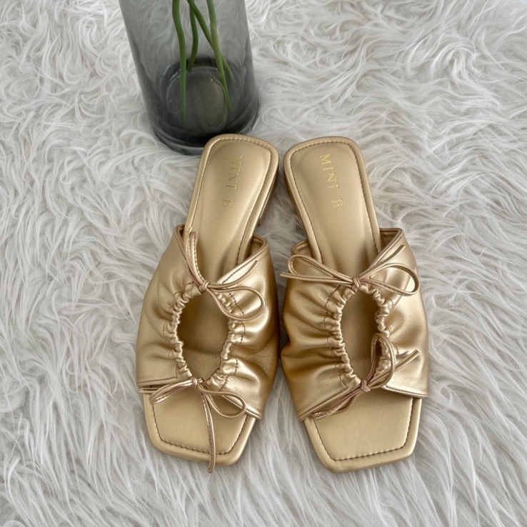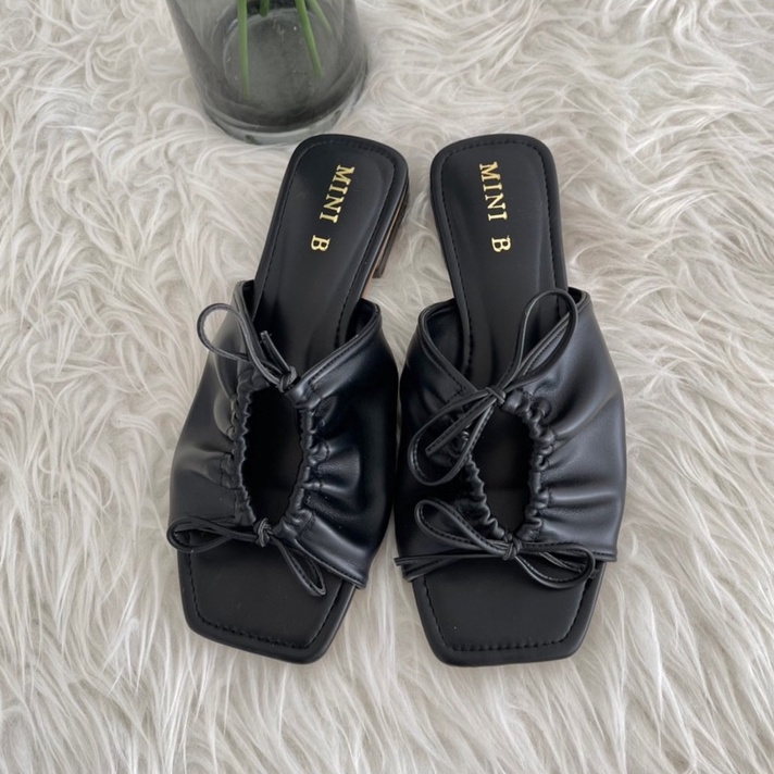 MiniB "VOILE" #mnb098 - รองเท้าส้น 1 นิ้วแบบสวม หน้าผ้าม่านโบว์จับจีบ