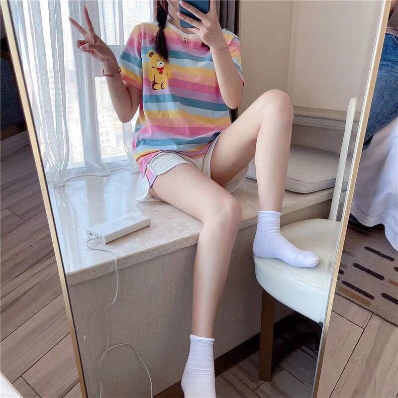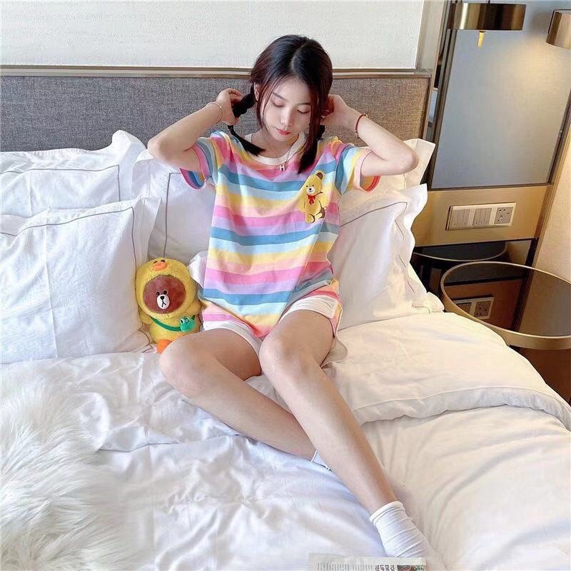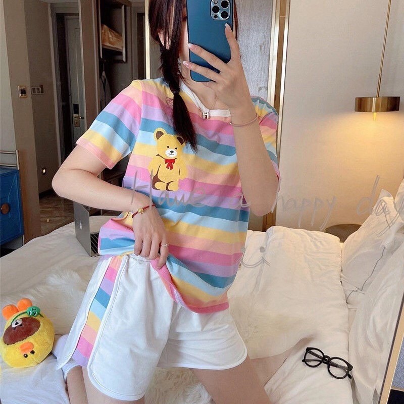 ชุดเซ็ทเสื้อยืดสีรุ้งรูปหมีและกางเกงขาสั้น