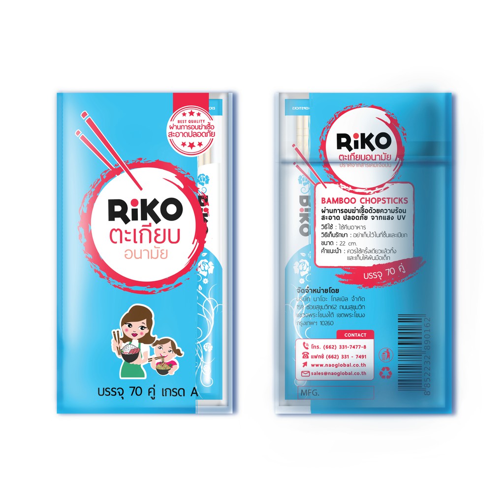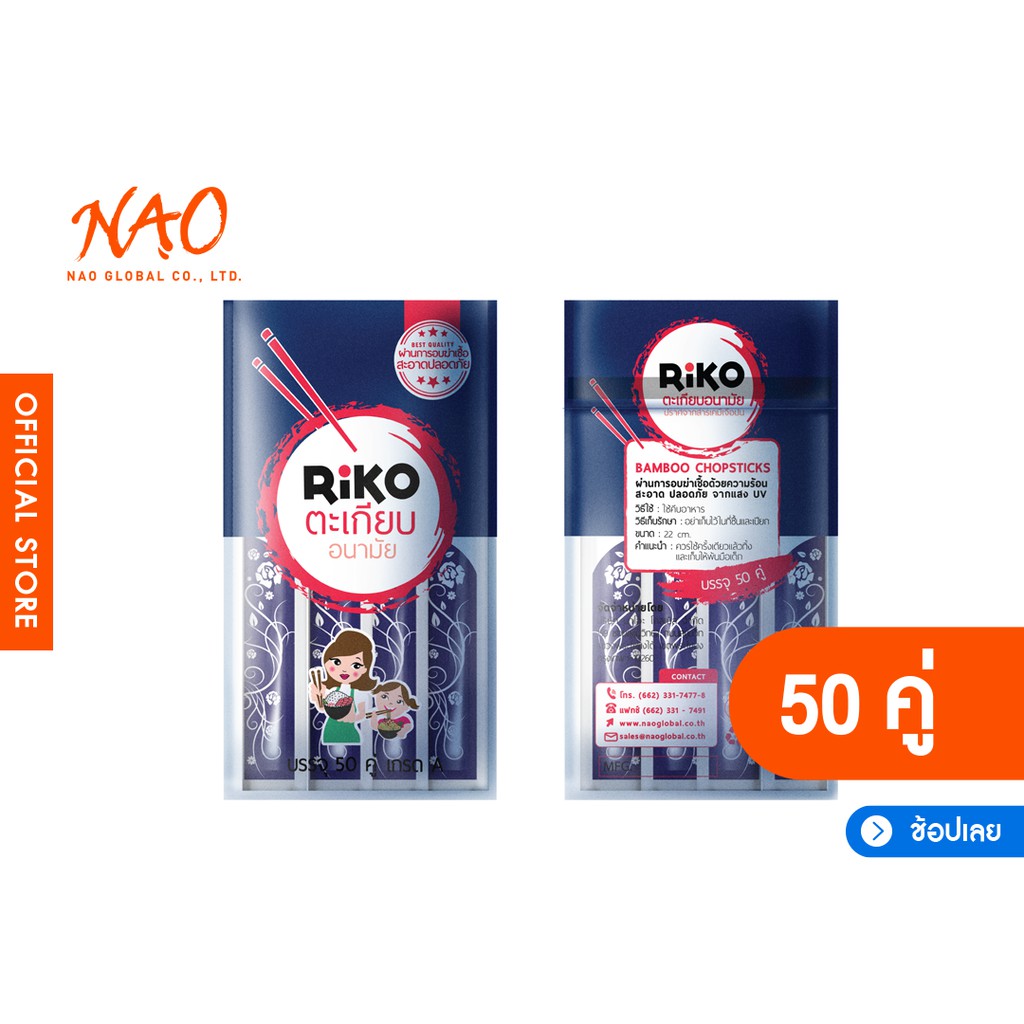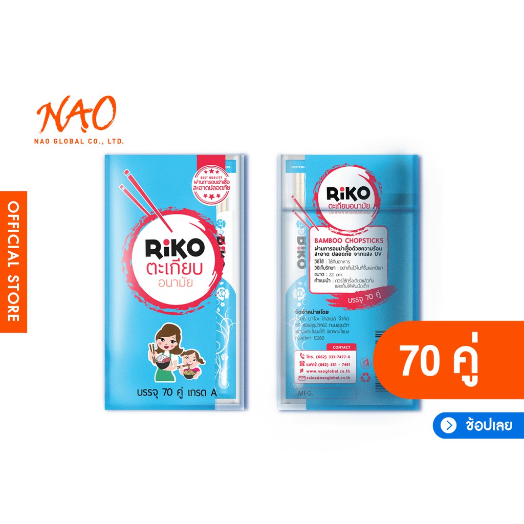 [50/70 คู่] RiKO ริโกะ ตะเกียบอนามัย ตรงดี ไม่มีเสี้ยน | ไม้ไผ่ธรรมชาติเกรด A อบฆ่าเชื้อด้วยแสง UV ความร้อนสูง 100 °C