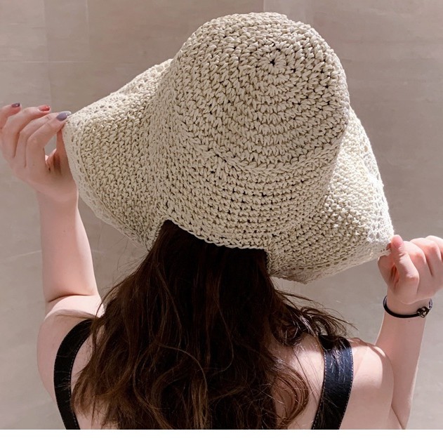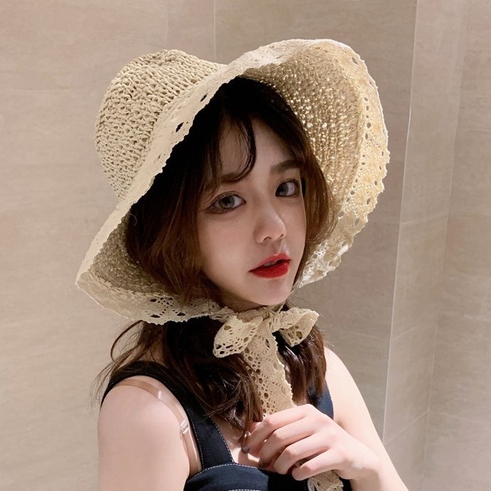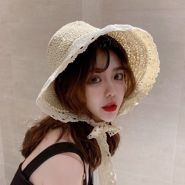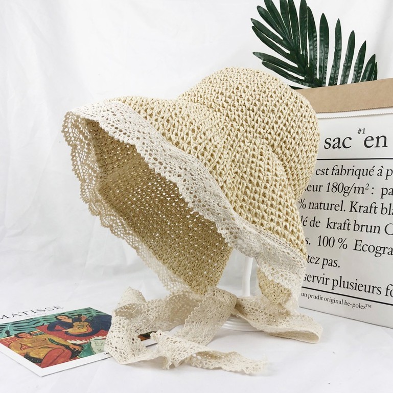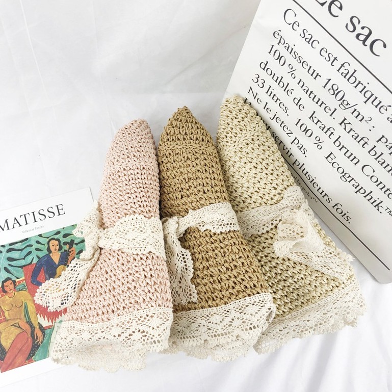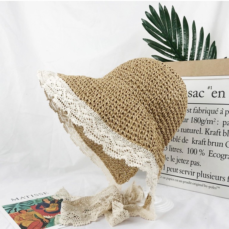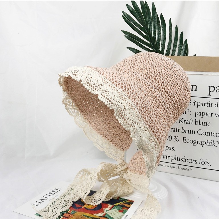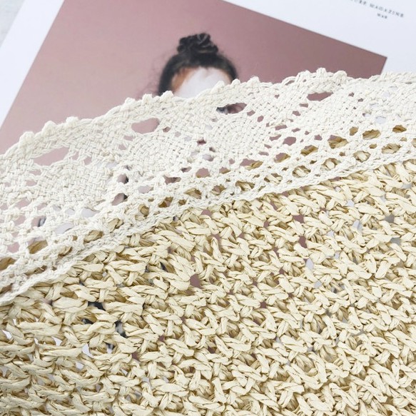 หมวกสาน บัคเก็ต แฮนด์เมด สไตล์วินเทจ ผลิตจากวัสดุธรรมชาติ แบบมีสายริบบิ้นลูกไม้ SH014