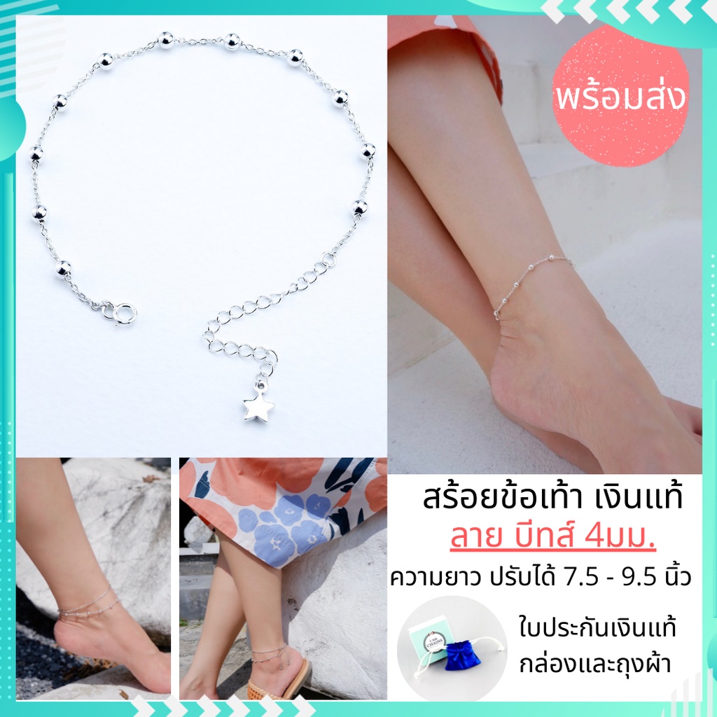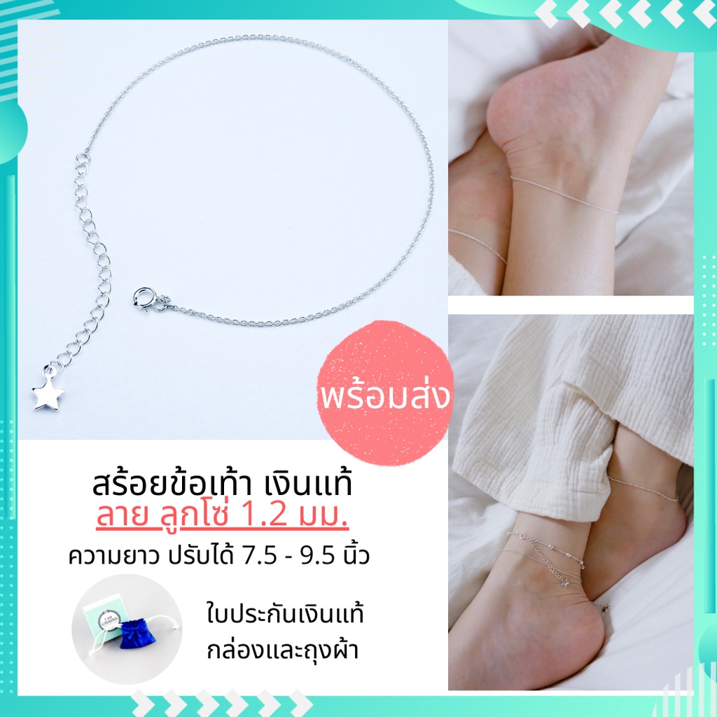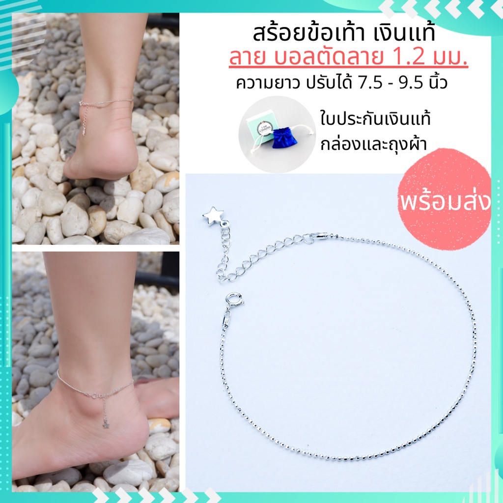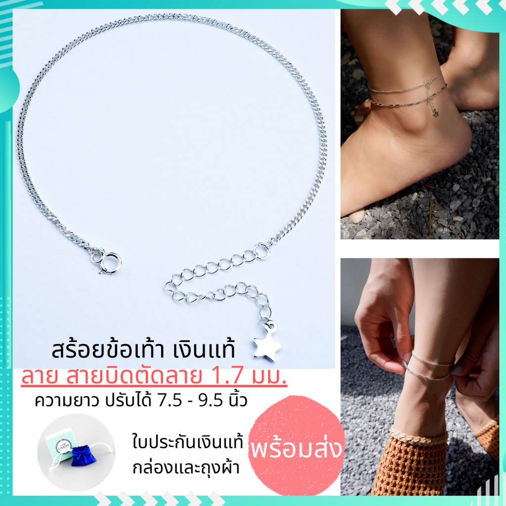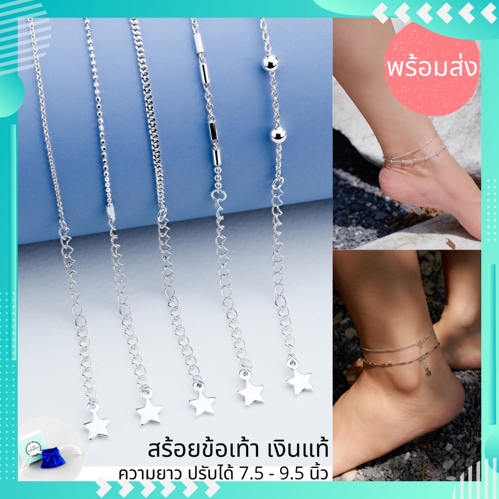 สร้อยข้อเท้า เงินแท้ ความยาวปรับได้ 7.5 - 9.5 นิ้ว มี 5 ลายน่ารักๆให้เลือก มีใบรับประกันเงินแท้ กล่อง และ ถุงผ้ากำมะหยี่