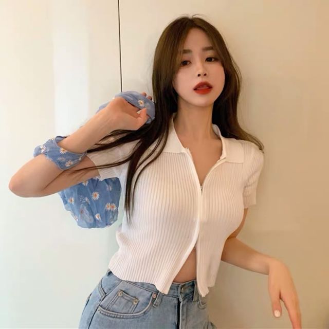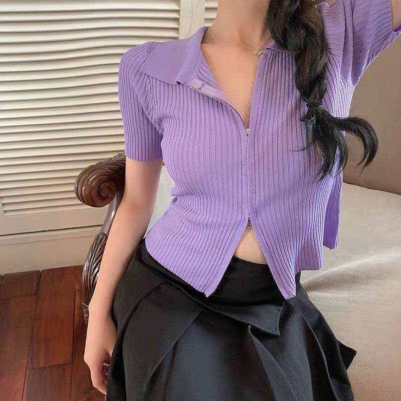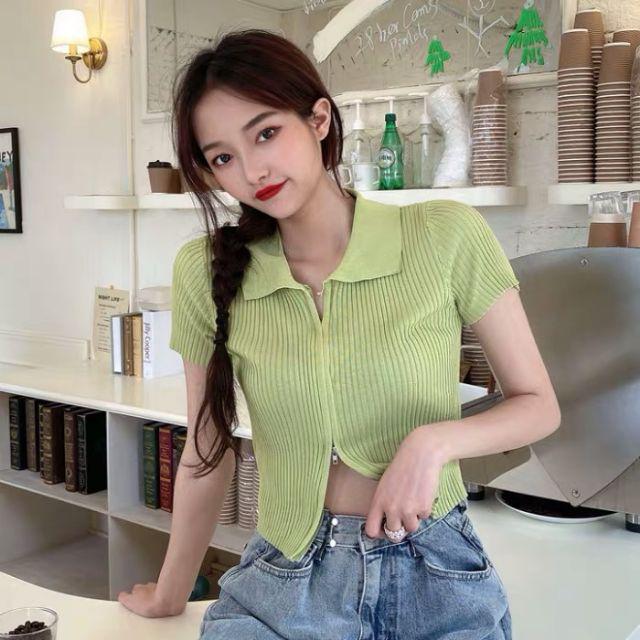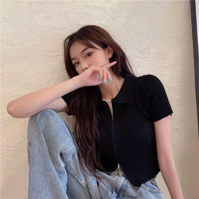 DODO🌟 พร้อมส่ง🌟เสื้อคอปกแขนสั้นไหมพรม เเต่งซิ๊บ รูดได้จริง (5930)