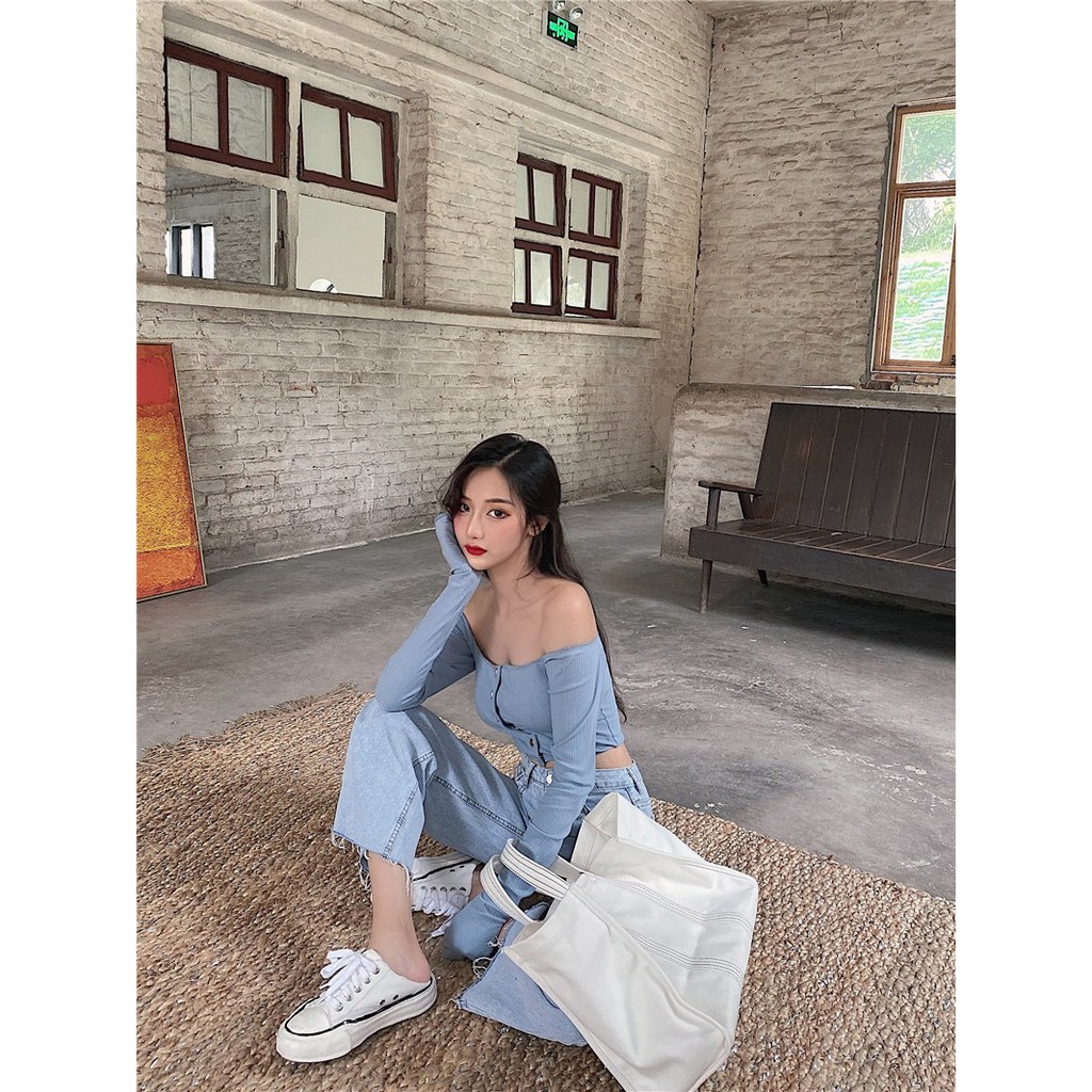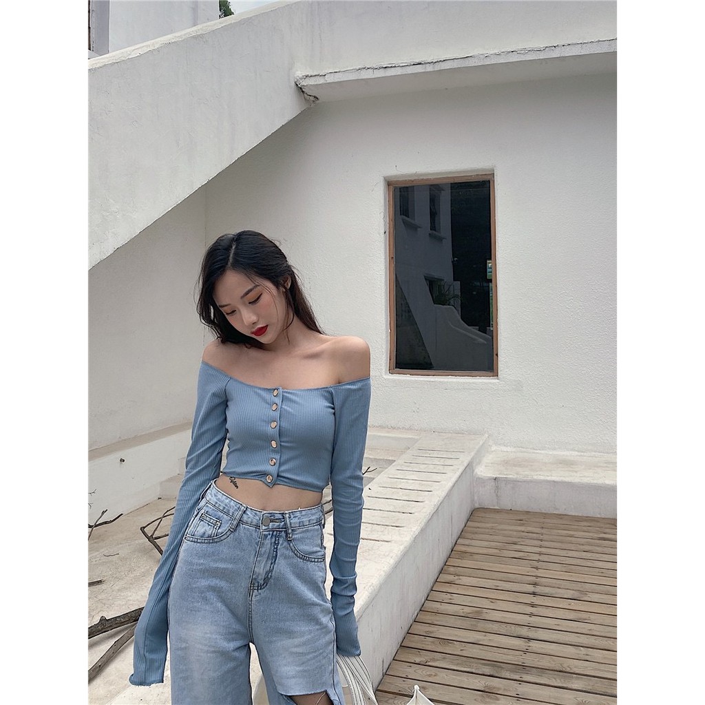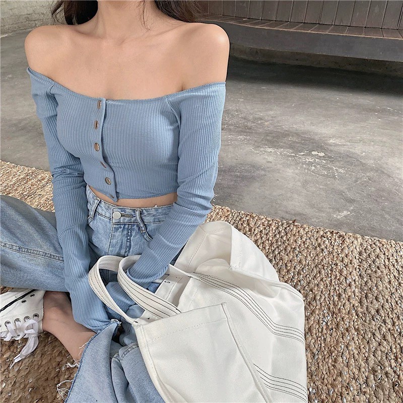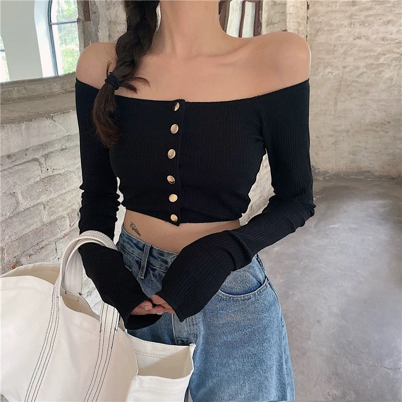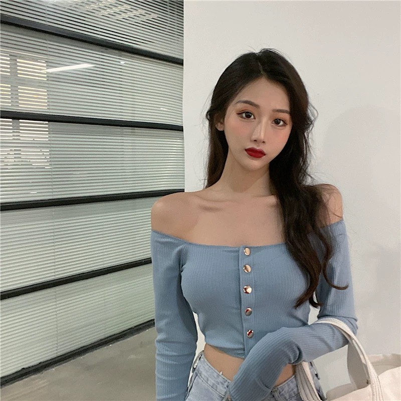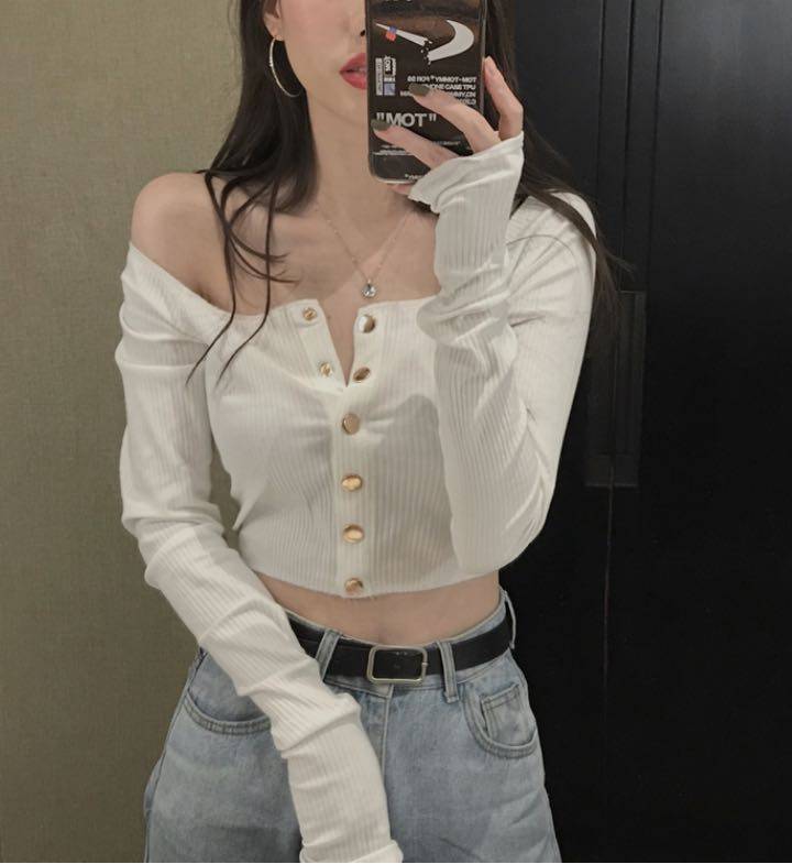 DODO*พร้อมส่ง*เสื้อปาดไหล่แขนยาว ตกแต่งด้วยกระดุมสีพิ้งโกล(5691)