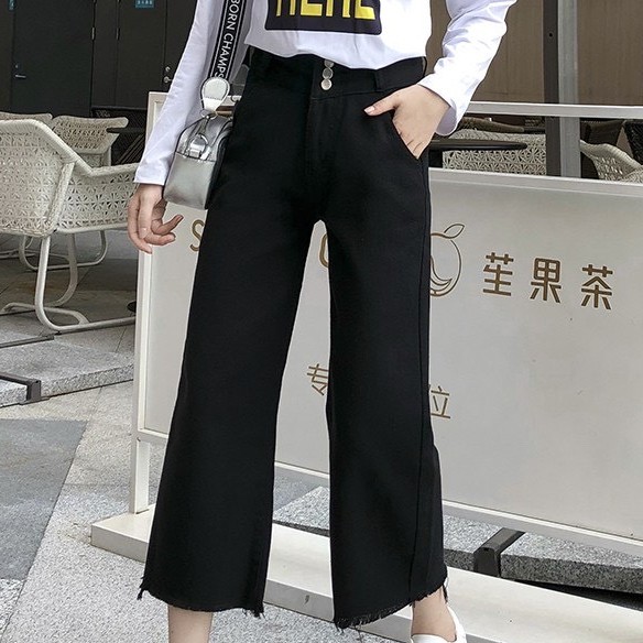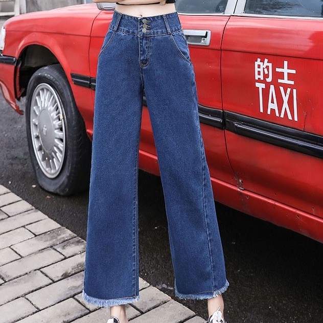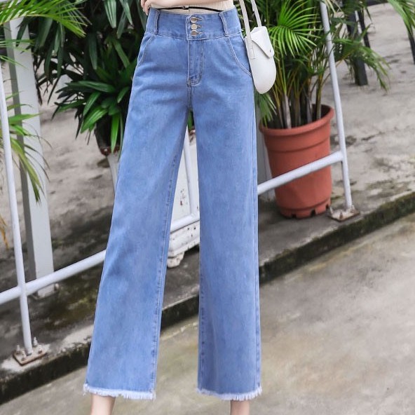 ✨Fairy style✨กางเกงยีนส์ขายาว เอวสูง ขาบาน แต่งขาด ทรงสวย ทรงสวย ตกแต่งสามกระดุม#8005