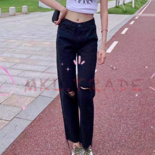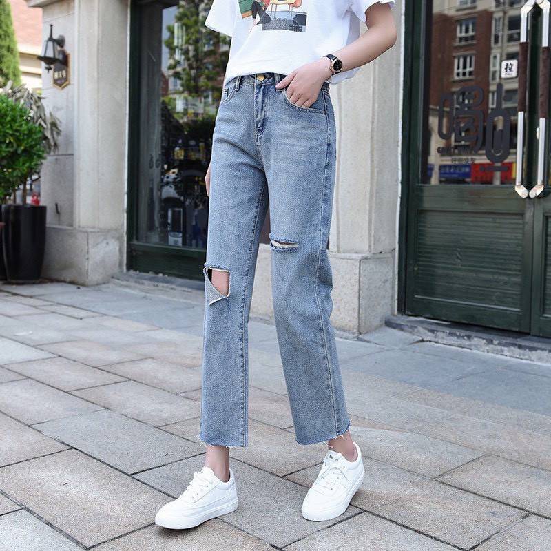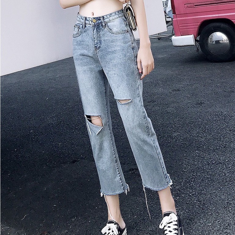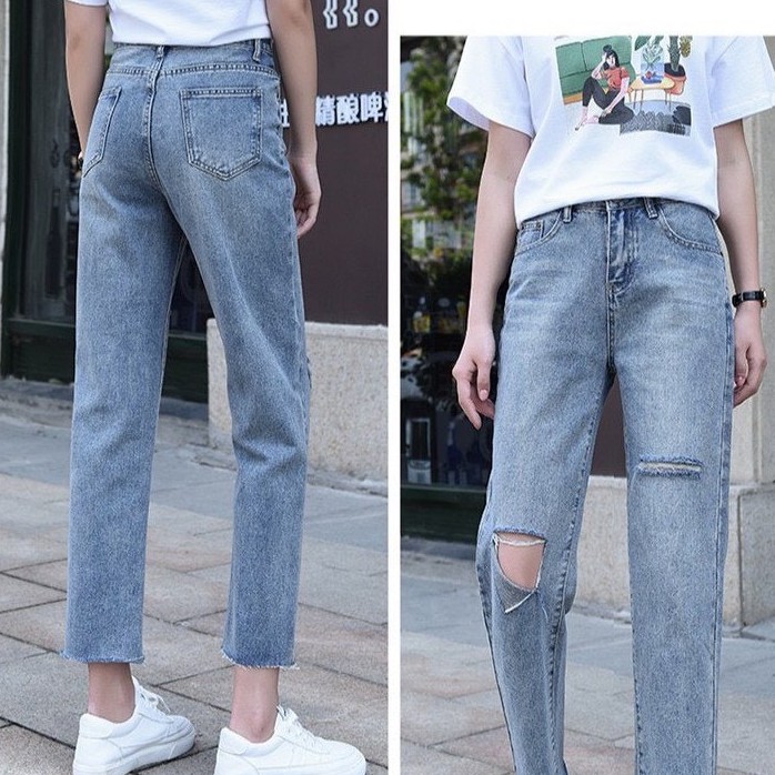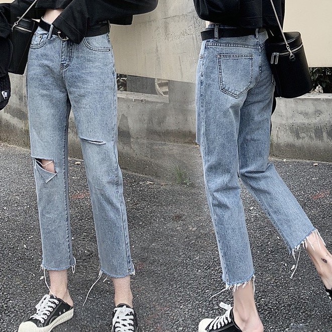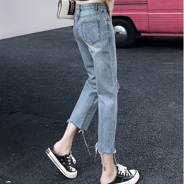 ✨Fairy style✨กางเกงยีนส์ ขายาว เอวสูง ทรงบอย แต่งขาด ปลายขาลุ่ย สไตล์เกาหลี#8059