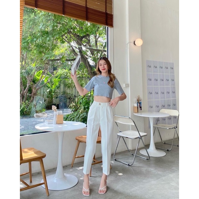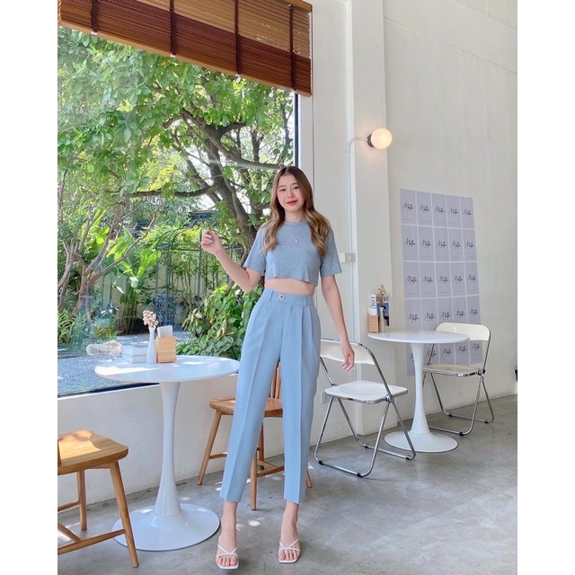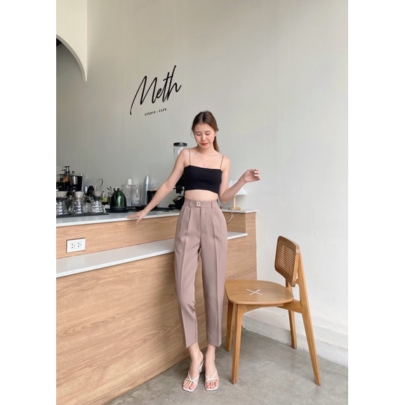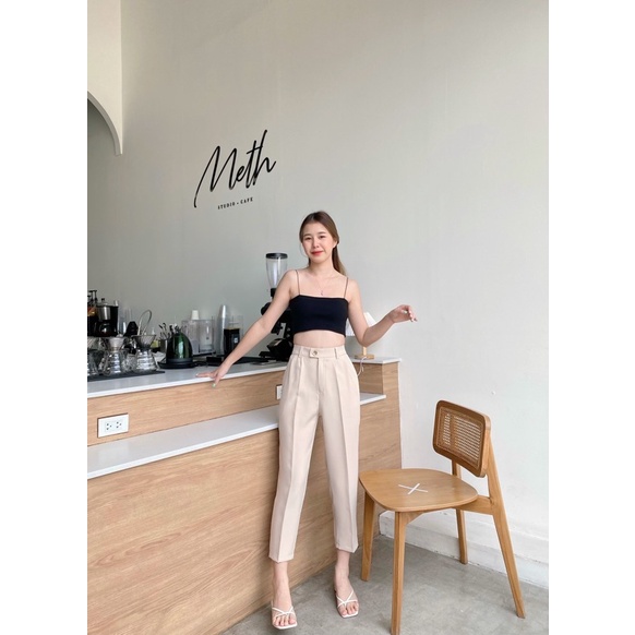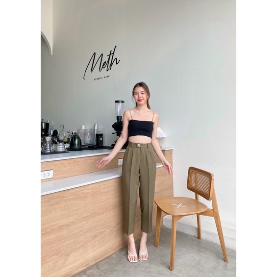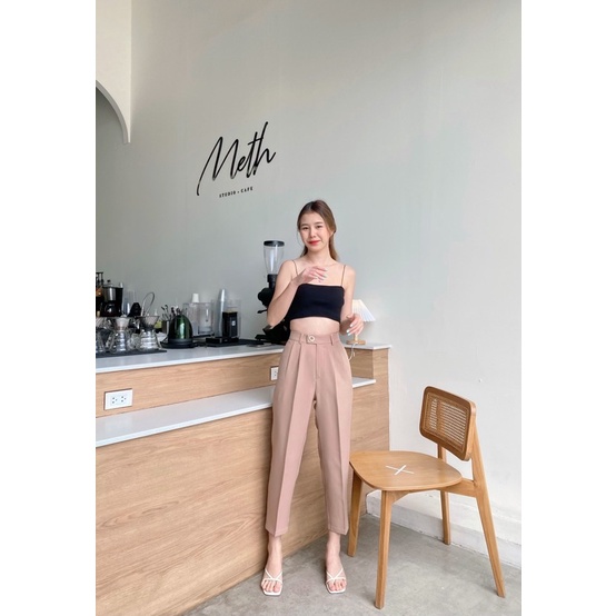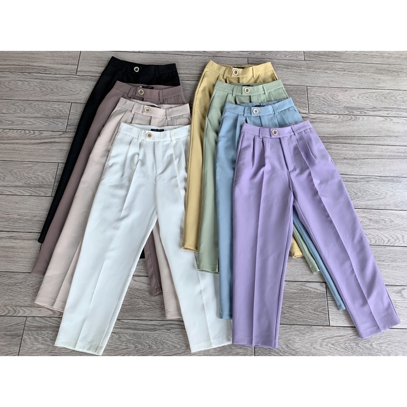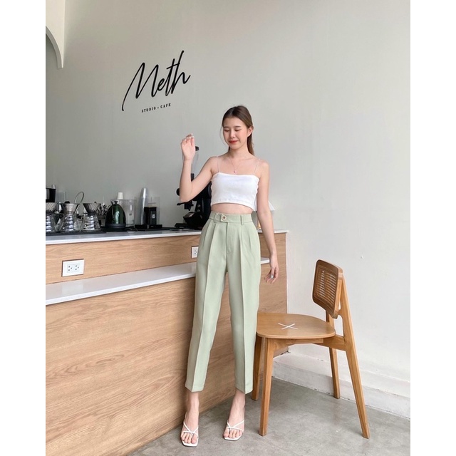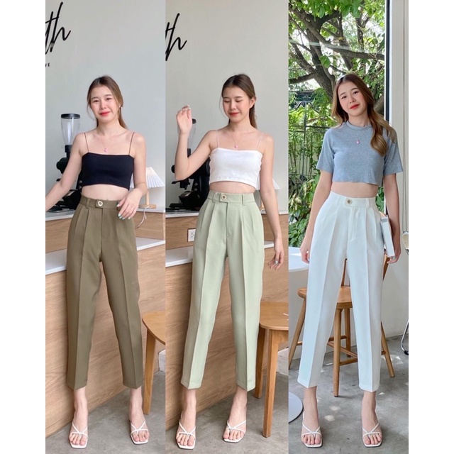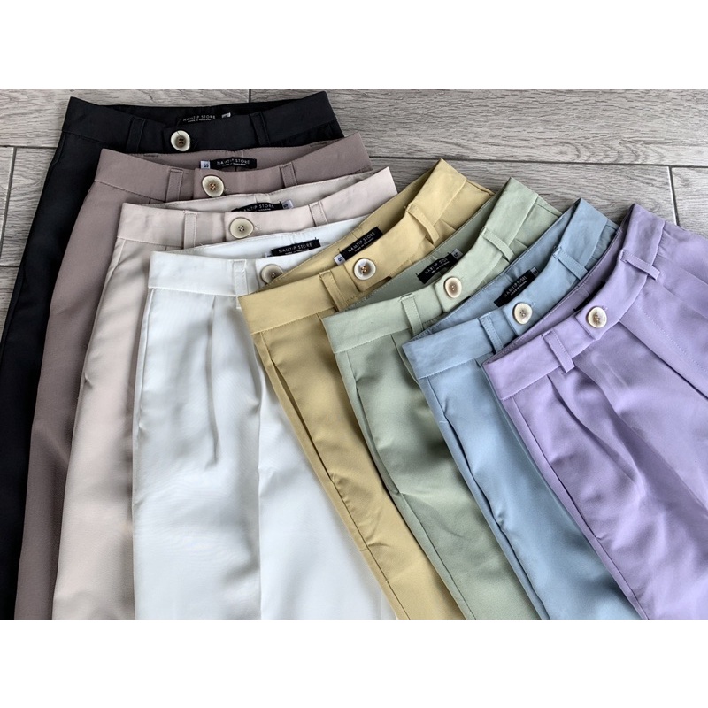 💛💚กางเกงทรงบอยสีพาลเมลผ้าไมโครแต่งกระดุมหน้า