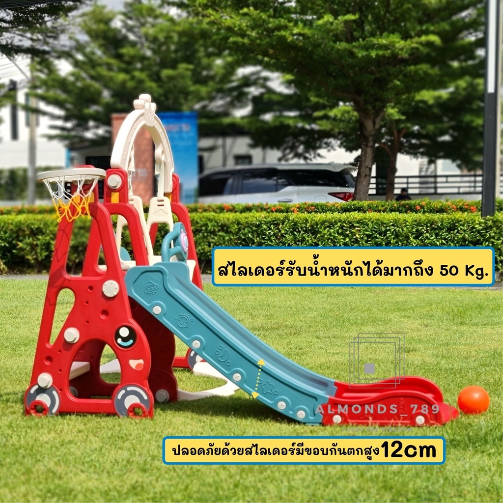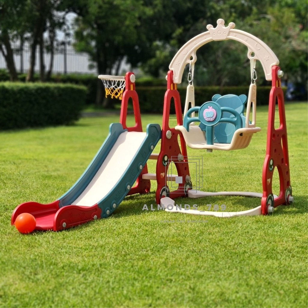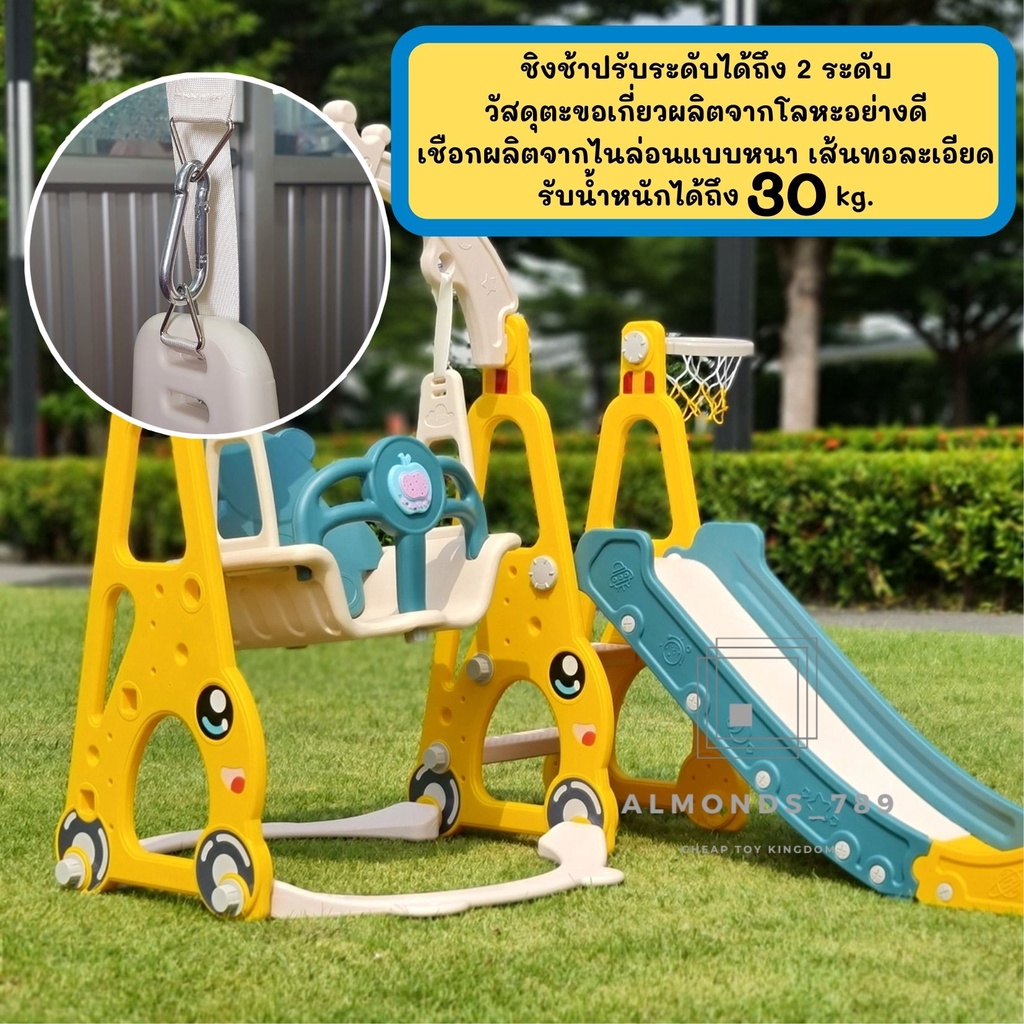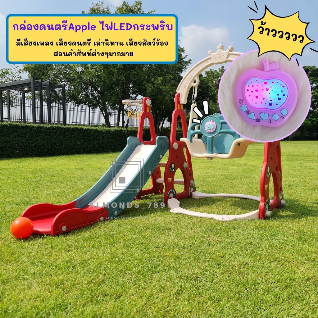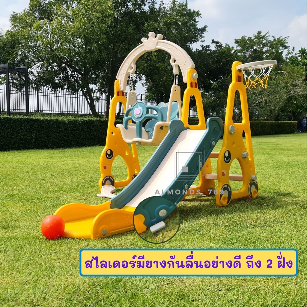 ชิงช้าสไลเดอร์ 3in1พร้อมแป้นบาสลูกบาส มีกล่องดนตรี ชิงช้าปรับได้2ระดับ สไลเดอร์มีกันตก ฐานตัวจุ๊ฟยึดแน่น[HH-02]