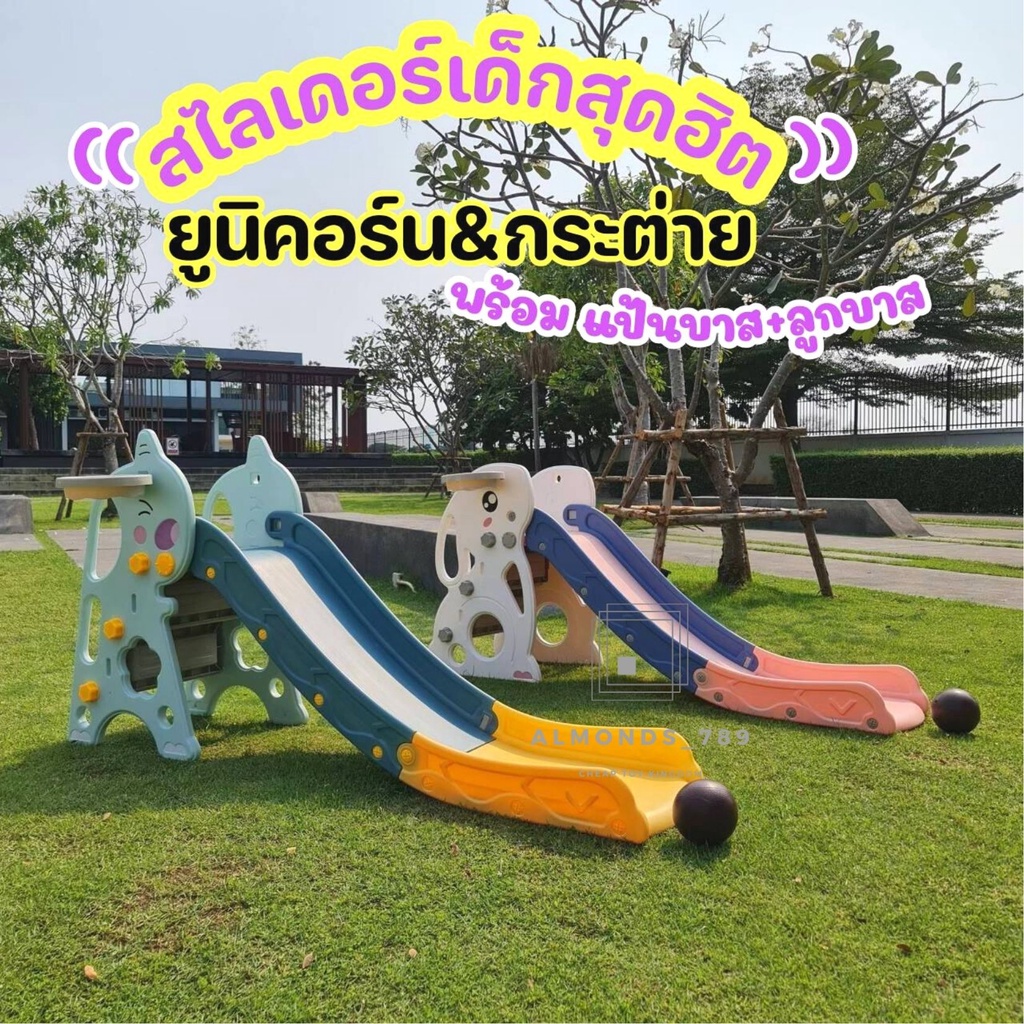สไลเดอร ์ ของเล่นเด็ก 2in1ลายน่ารัก มีแป้นบาสลูกบาส ใส่สระเป่าลมสูง2ชั้นได้