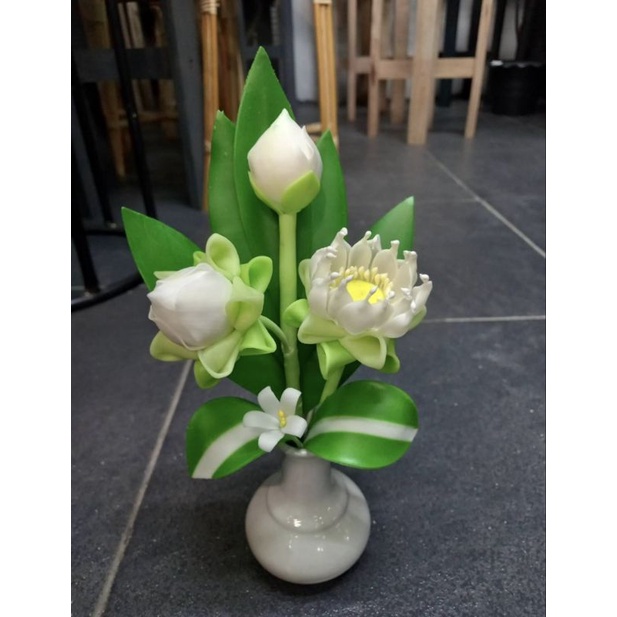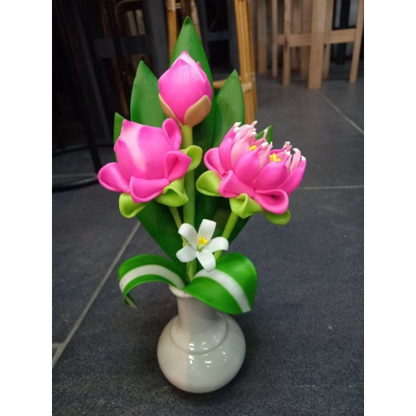 แจกันดอกบัว ดอกบัวดินปั้น ดอกบัวประดิษฐ์ (ตกแต่งด้วยดอกแก้ว) ตูม 2 บาน 1 สูง 7 นิ้ว