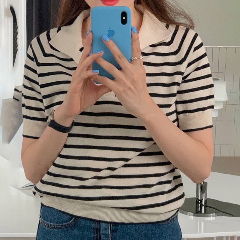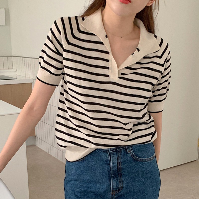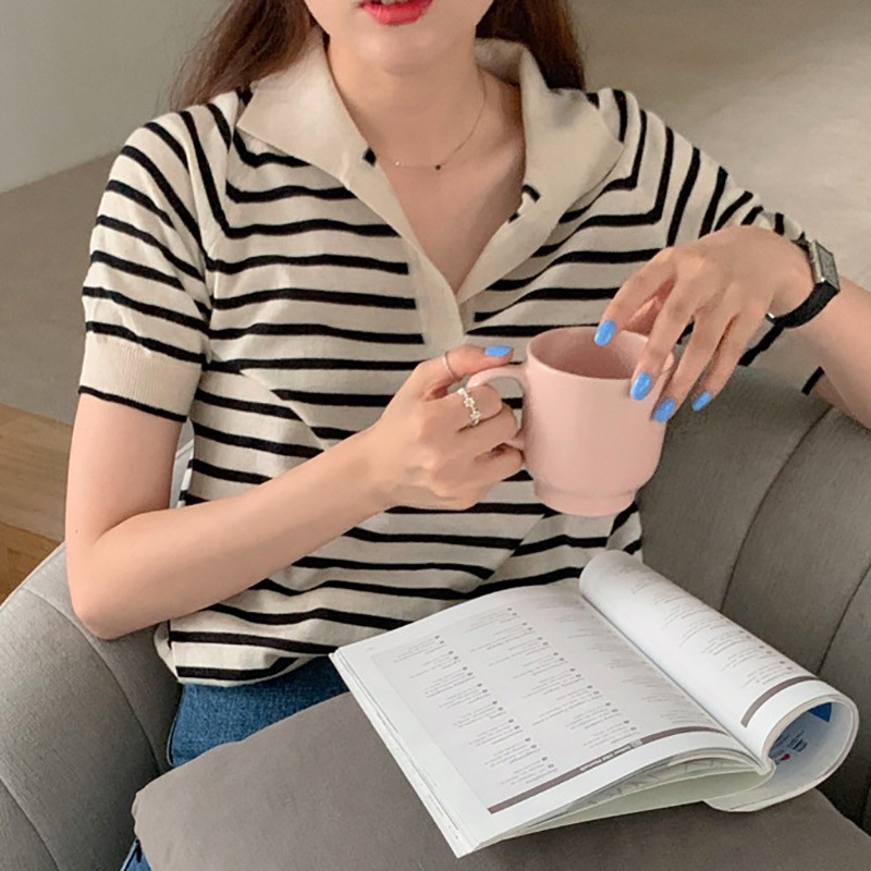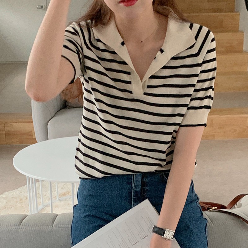 Gakki เสื้อไหมพรมแขนสั้น เสื้อยืดโปโล คอวี ผ้านิ่มใส่สบาย ฟรีไซส์ พร้อมส่ง 1066#