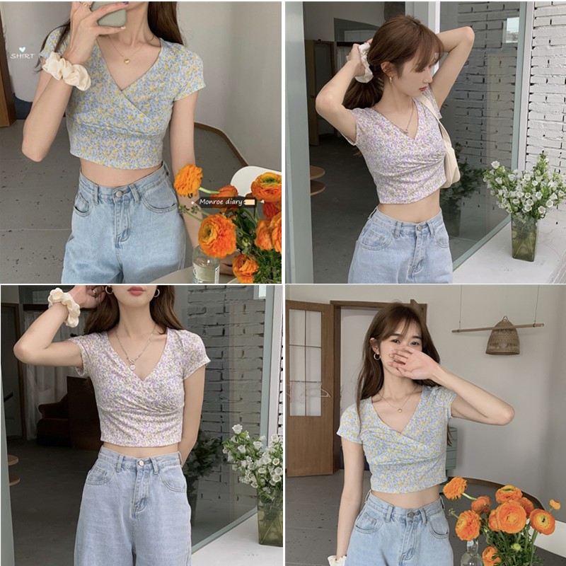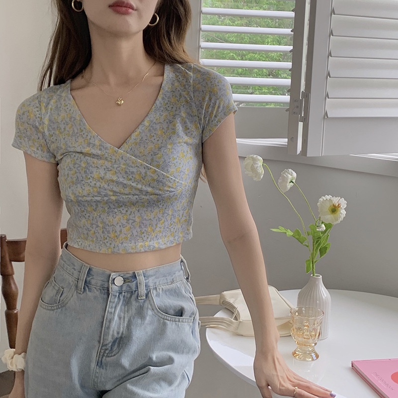 【WJZ】 เสื้อยืดแขนสั้นคอวีพิมพ์ลายดอกไม้แฟชั่นสตรีสไตล์เกาหลี【21】