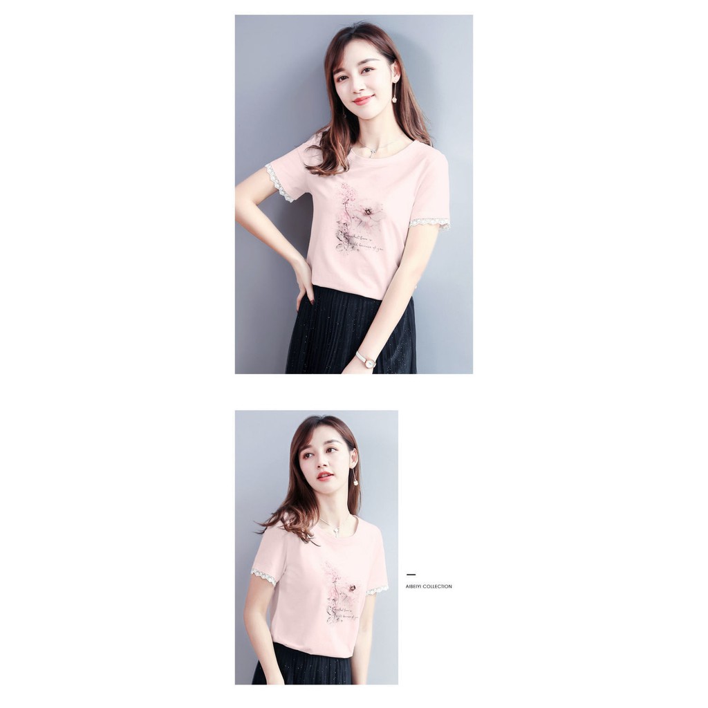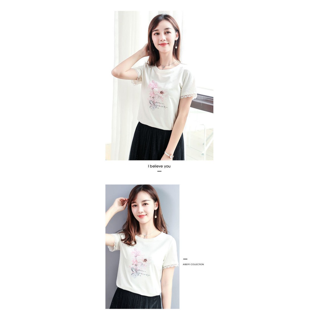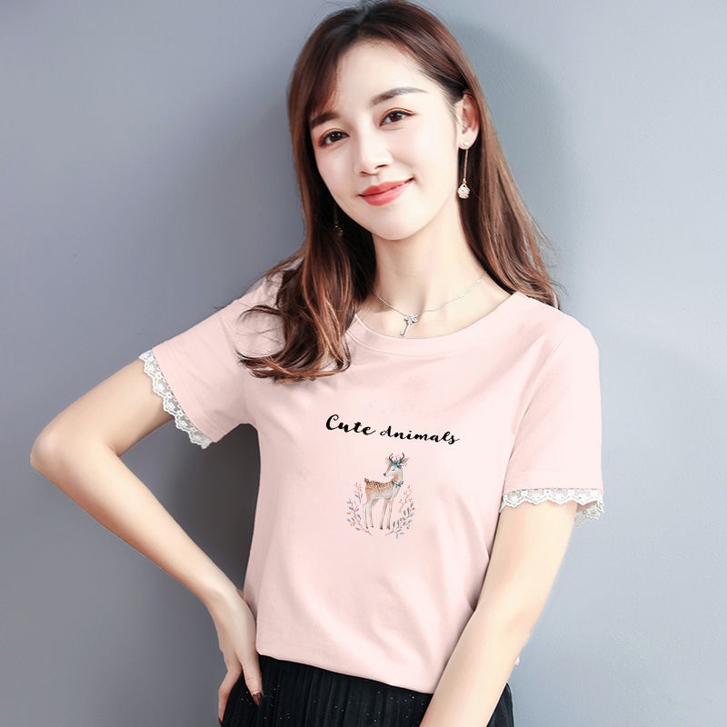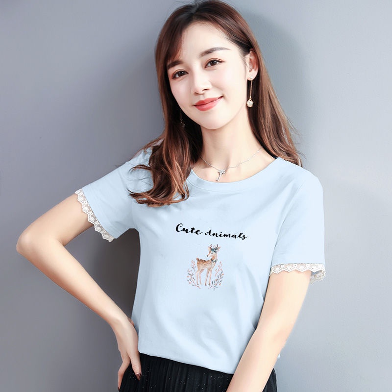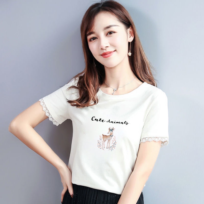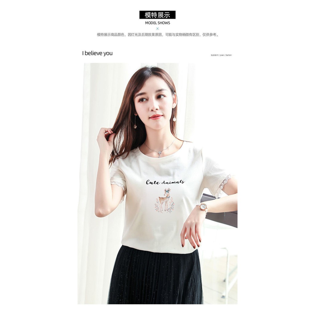 พร้อมส่ง เสื้อยืดผู้หญิงแฟชั่น คอกลมสไตล์เกาหลีสีพื้นลายกวางมาใหม่ล่าสุด อักษรภาษาอังกฤษ์ แต่งแขนข้าง