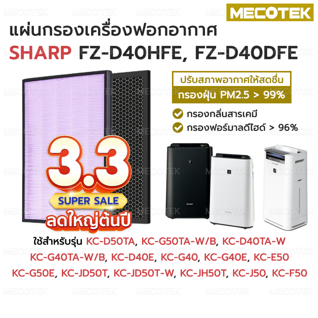 ไส้กรองอากาศ แผ่นกรองอากาศ SHARP FZ-D40HFE, FZ-D40DFE HEPA + Carbon อะไหล่เทียบแท้ คุณภาพดี ตรงรุ่น