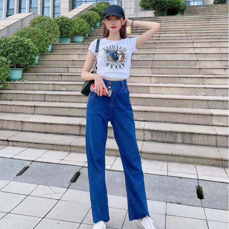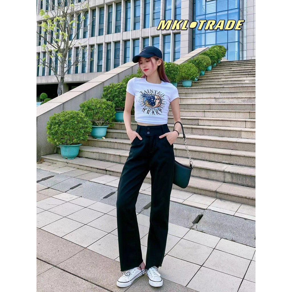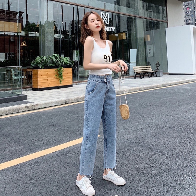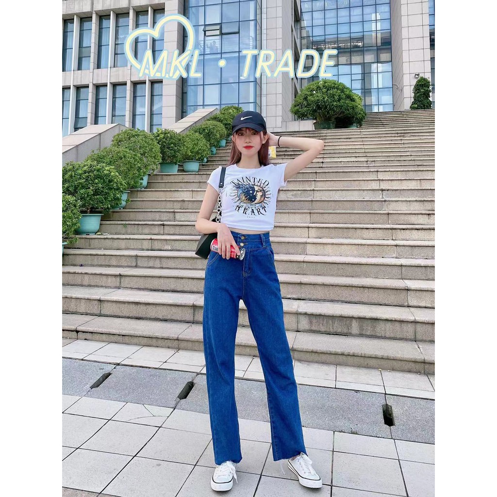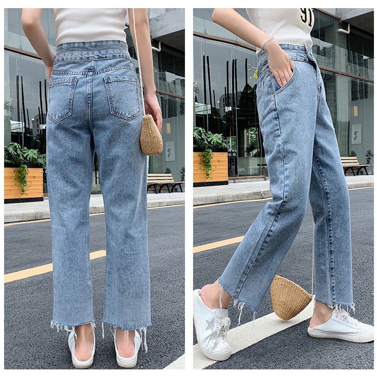 🌷👖MKL👖🌷 กางเกงยีนส์ขายาว ทรงกระบอก เอวสูง ปลายขารุ่ย กางเกงยีนส์ขายาวผู้หญิง 🔥⚡ #8058