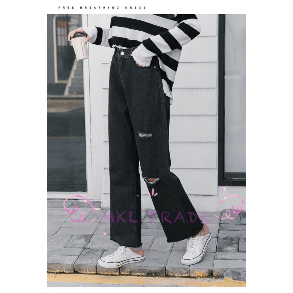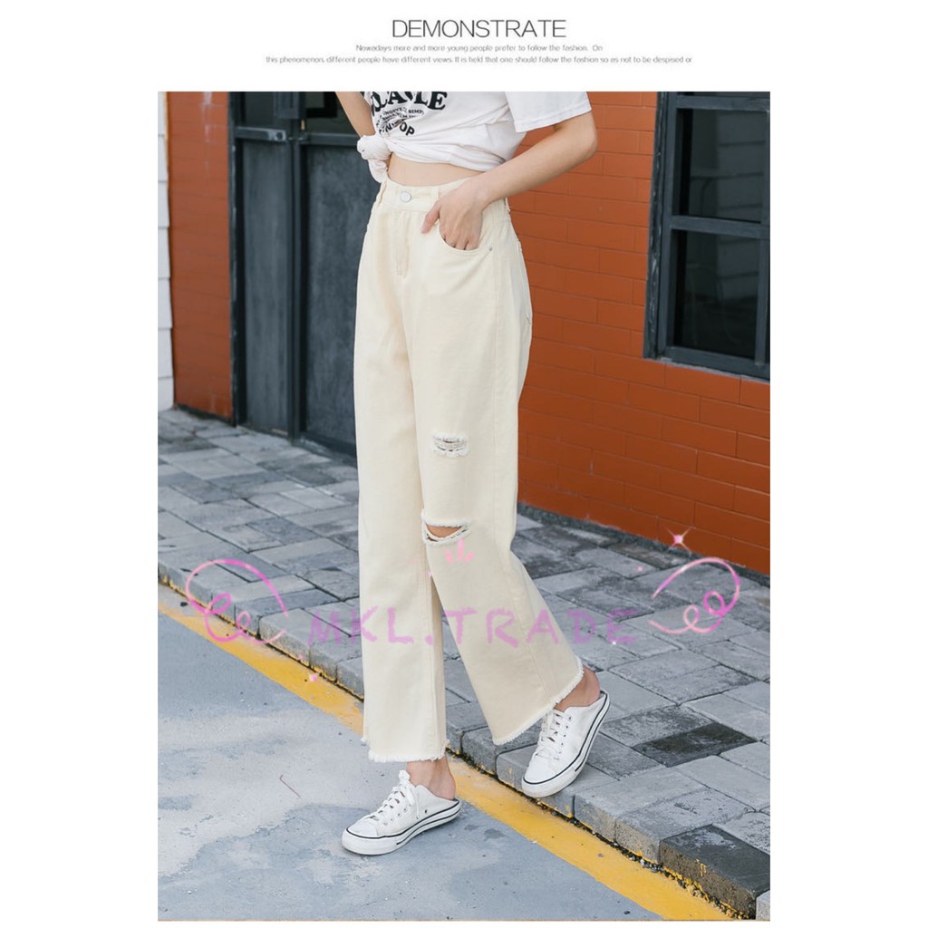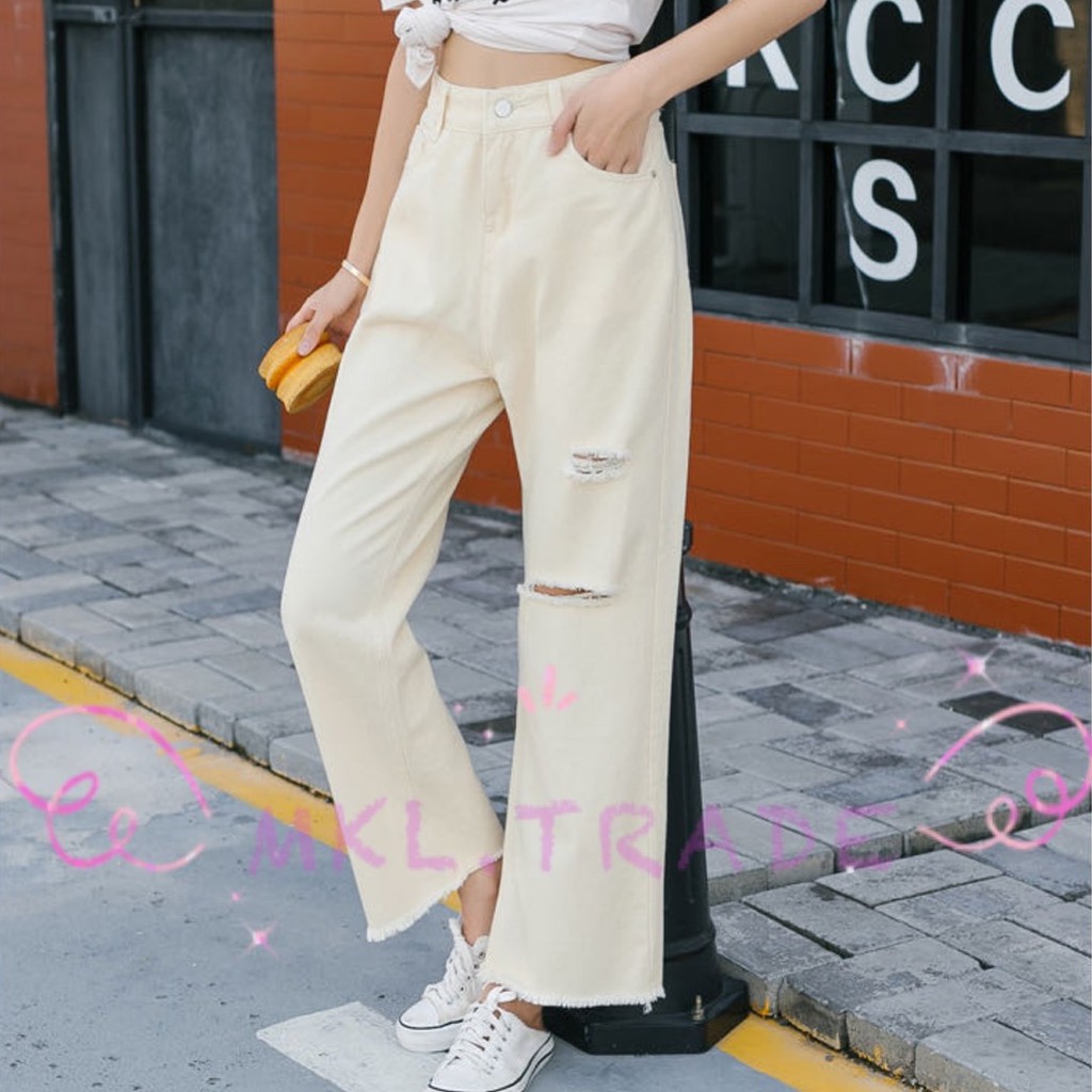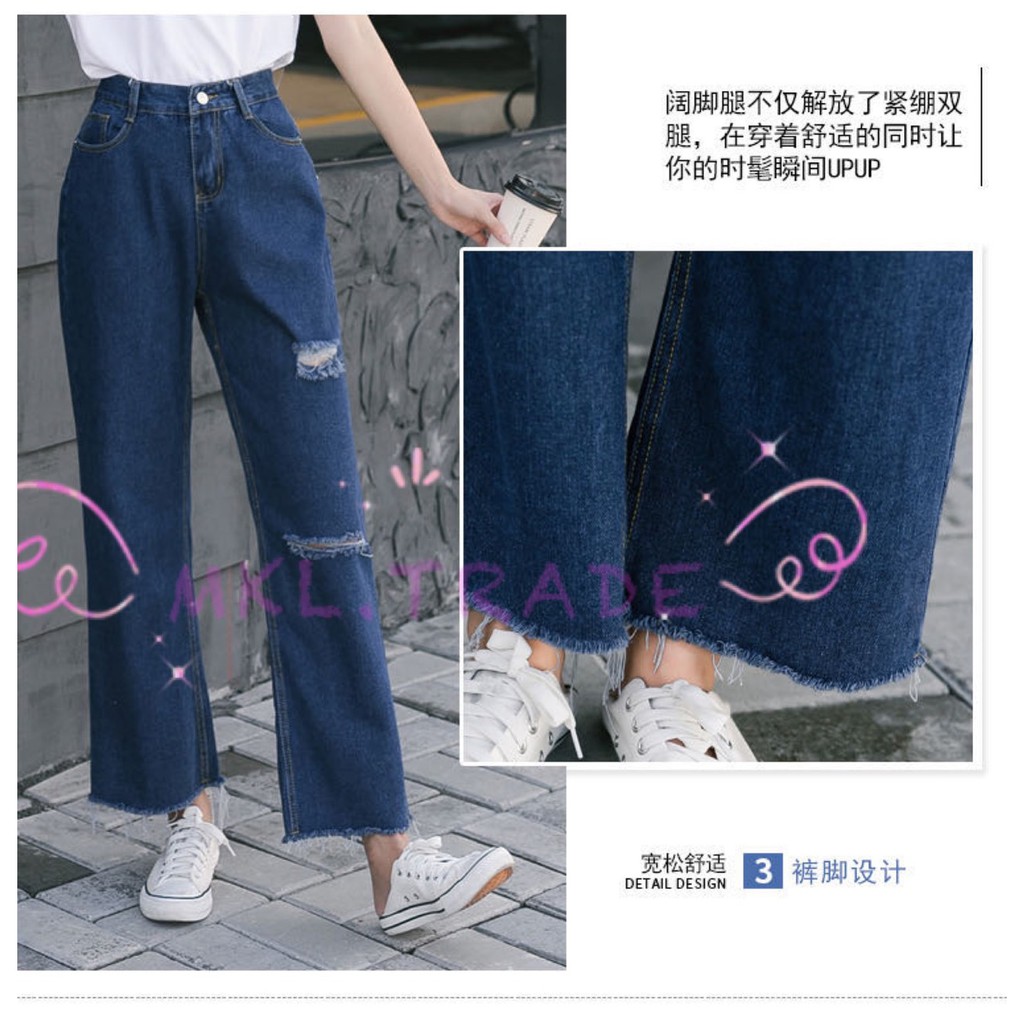 🛒👖MKL👖🛒 กางเกงยีนส์ผู้หญิง กางเกงยีนส์ขายาว เอวสูง ปลายรุ่ย แต่งขาดขาด้านซ้าย 🚚⚡#8028