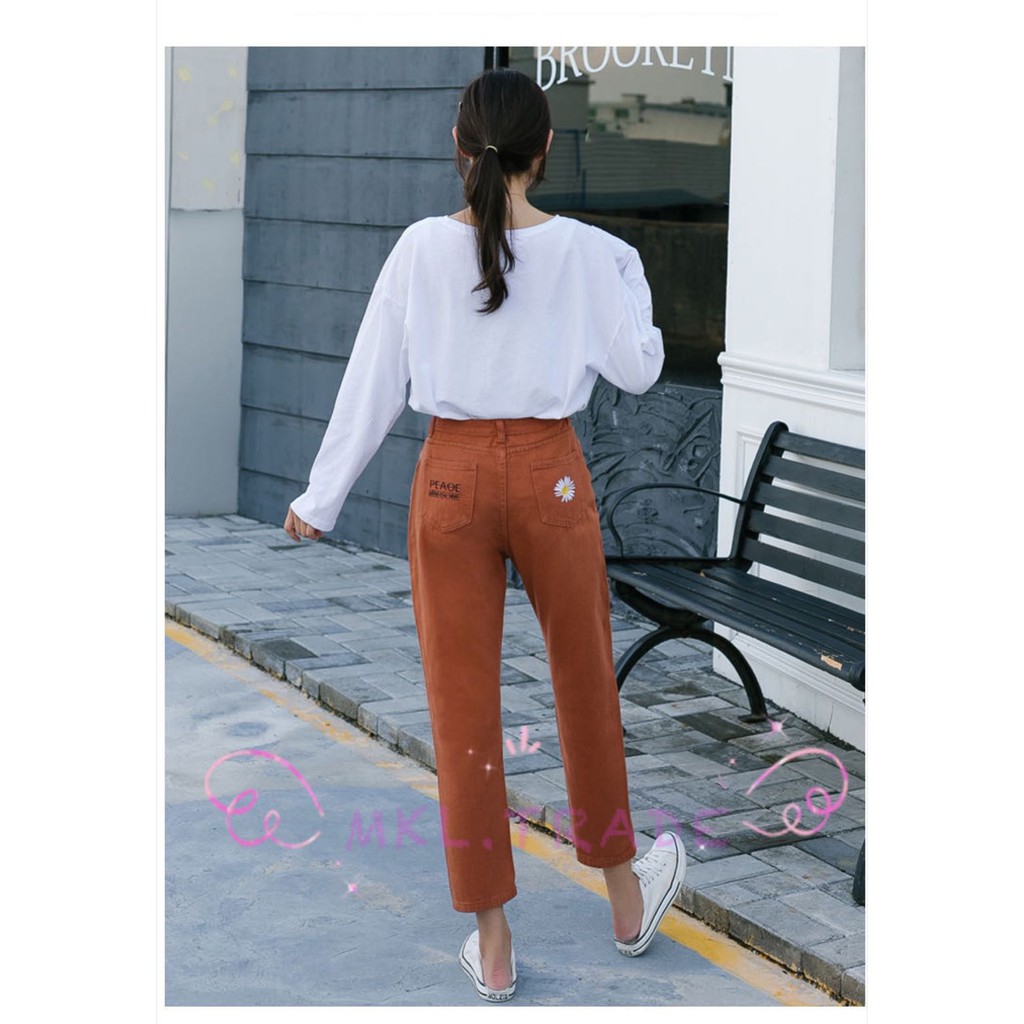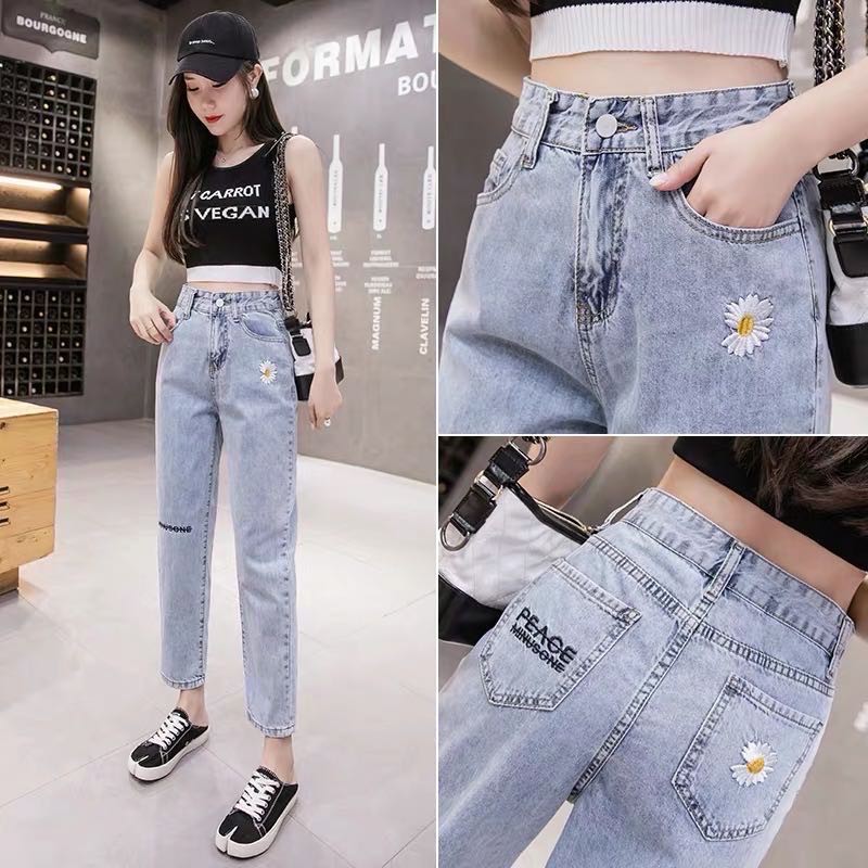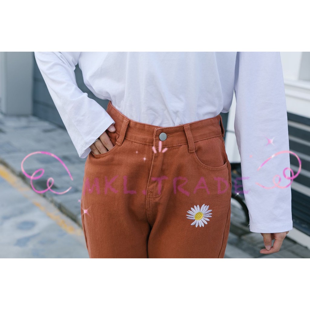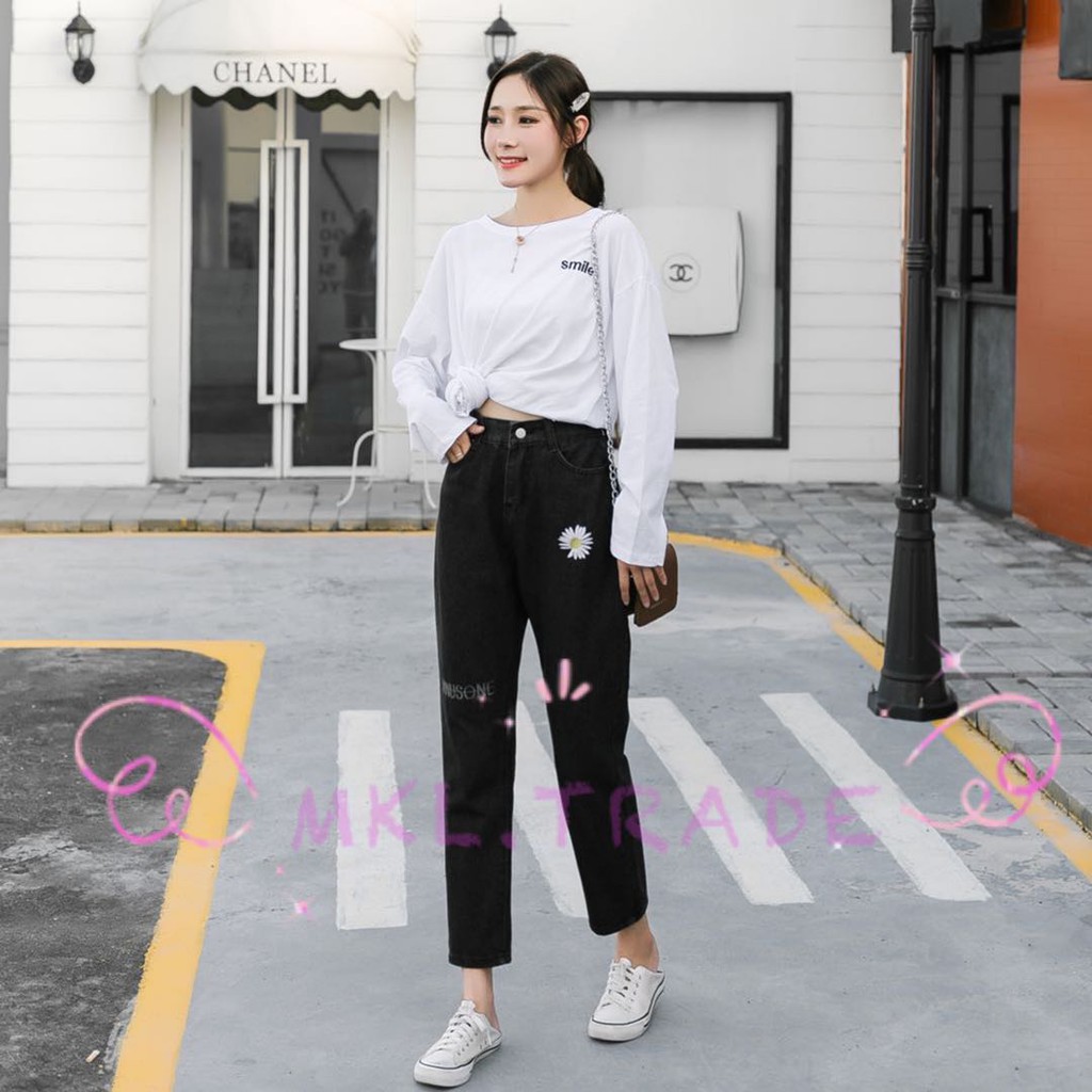 🌼👖MKL👖🌼 กางเกงยีนส์ขายาวทรงบอย ปักลายดอก ลายอักษร เอวสูง 🚚⚡#8025