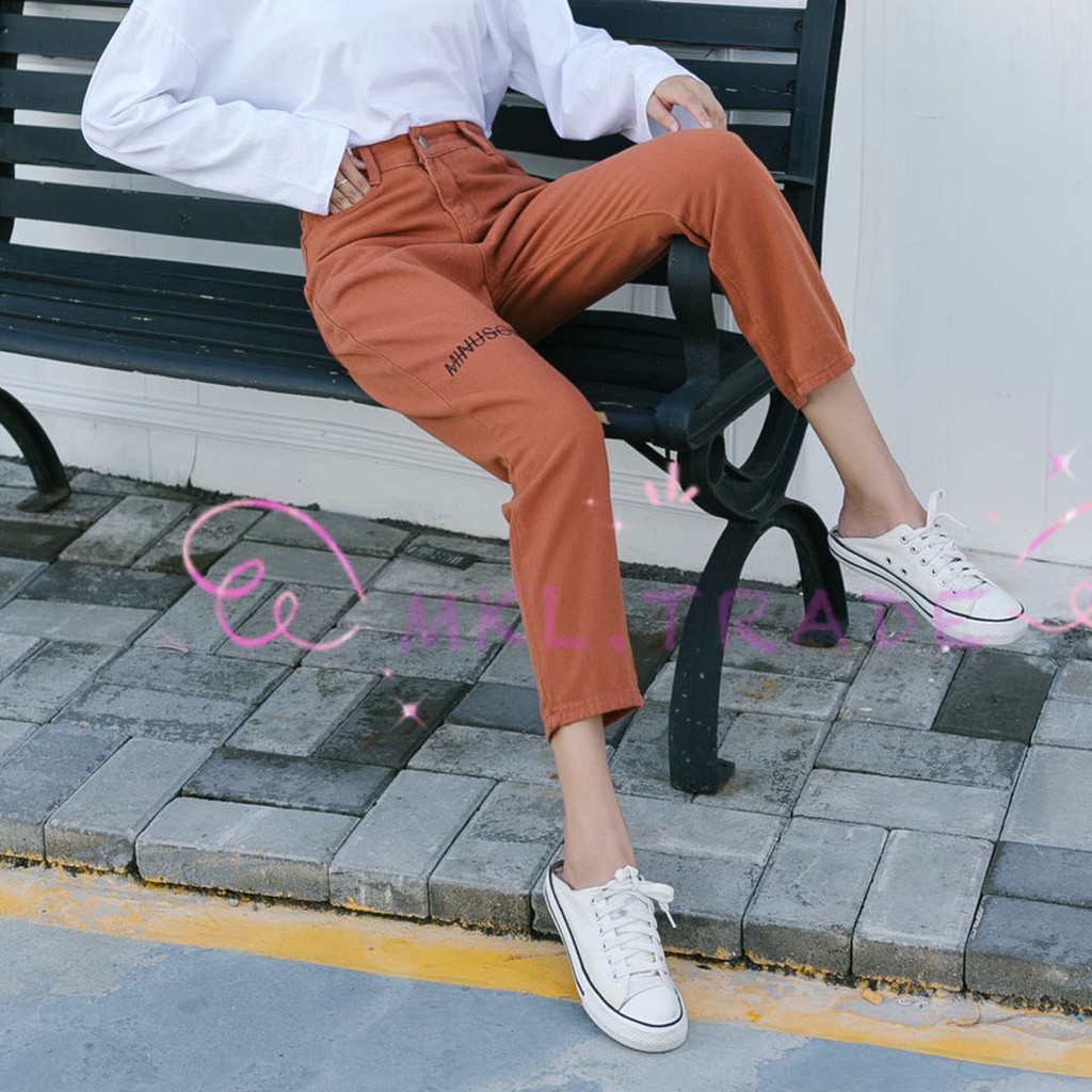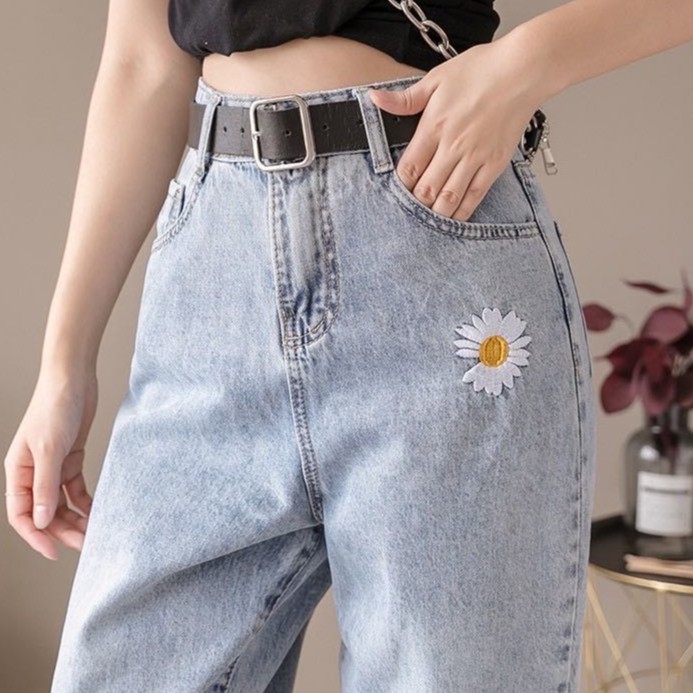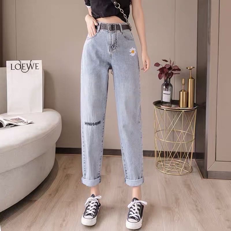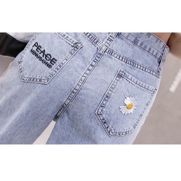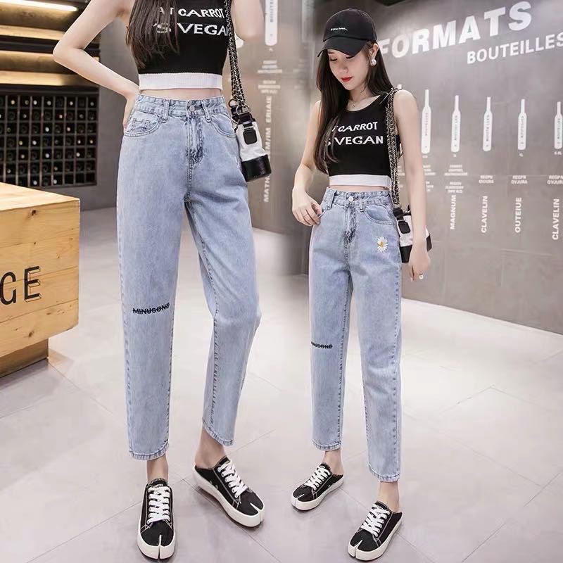 🌼👖MKL👖🌼 กางเกงยีนส์ขายาวทรงบอย ปักลายดอก ลายอักษร เอวสูง 🚚⚡#8025