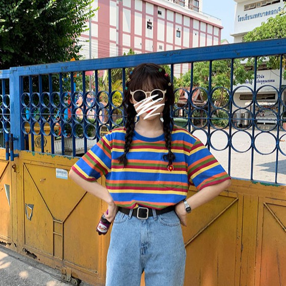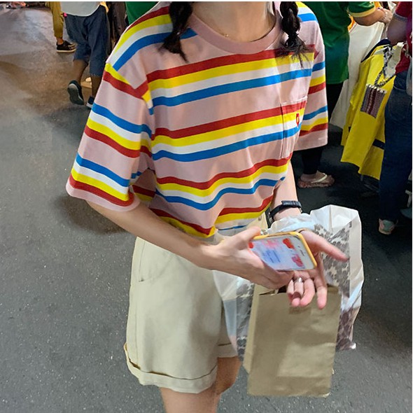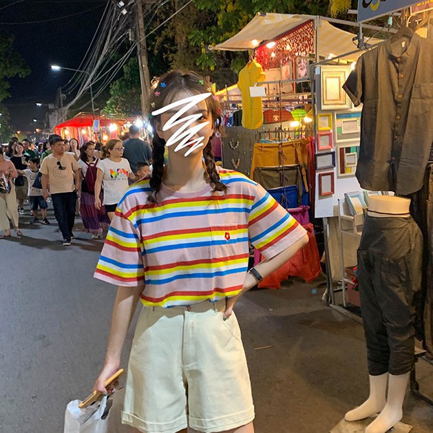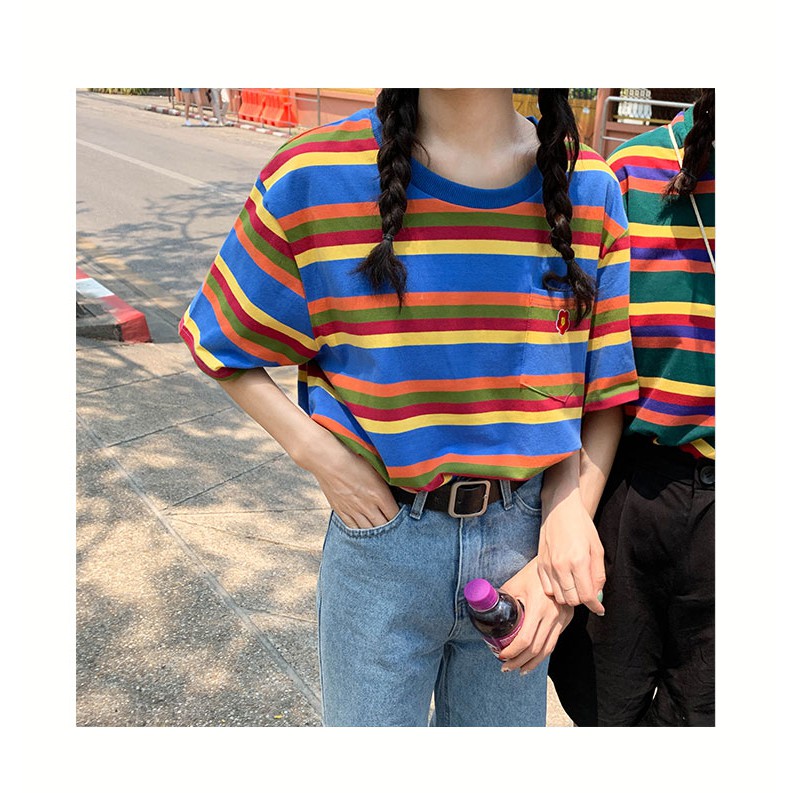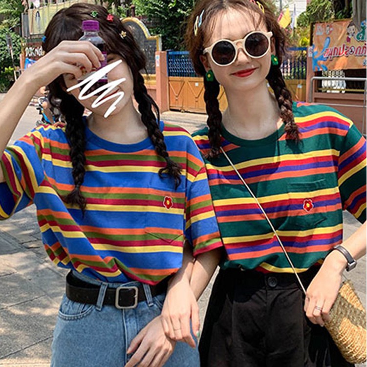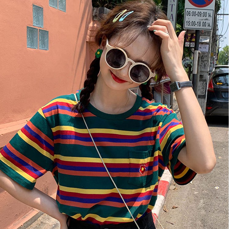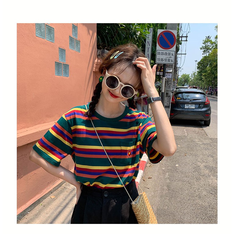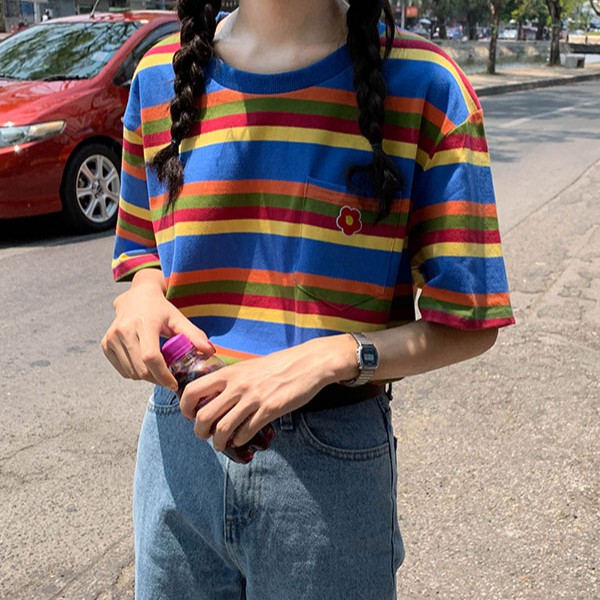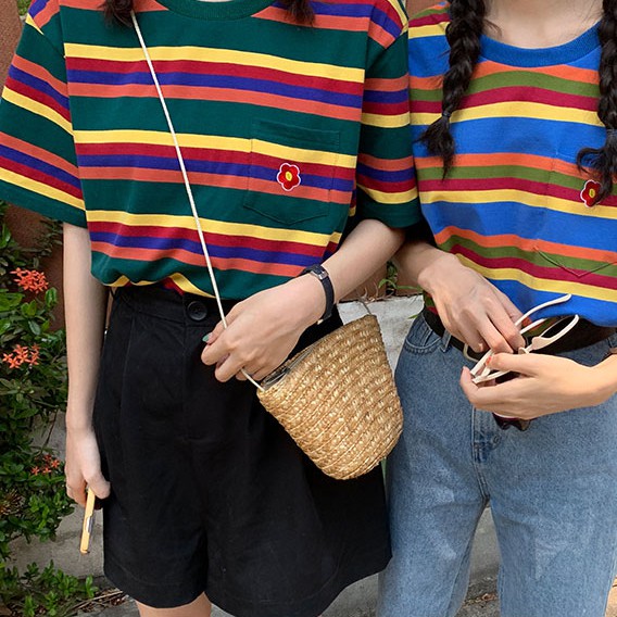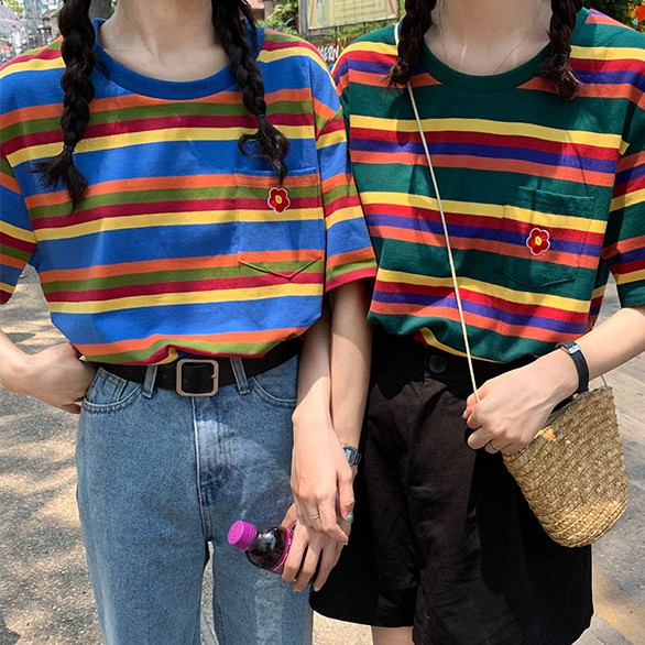 ✨ MKL ✨ เสื้อยืดลายทาง ปักรูปดอกไม้ตรงกระเป๋า T-Shirt #9336