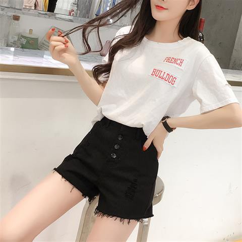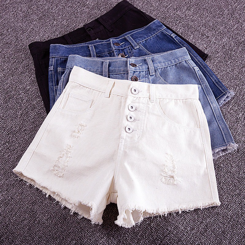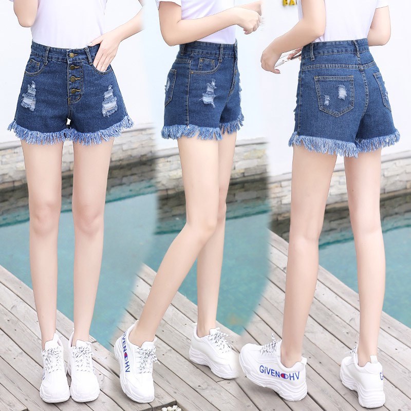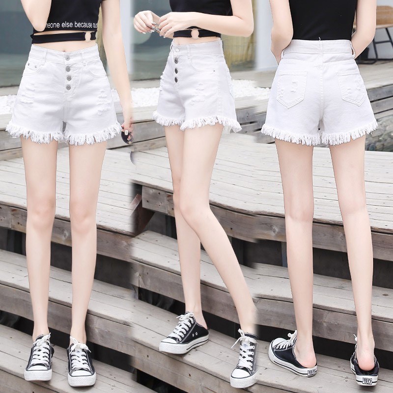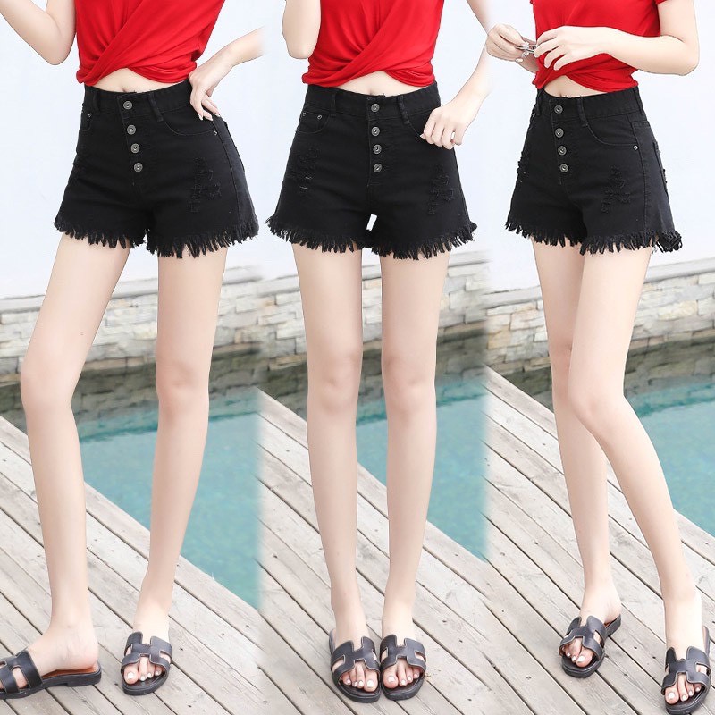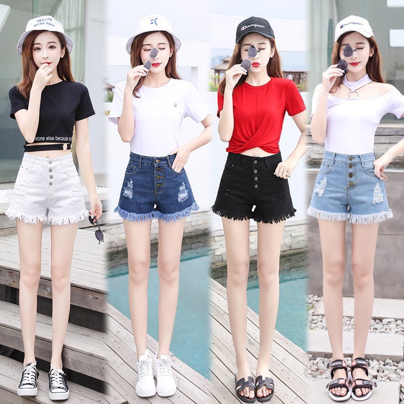 🍑👖MKL👖🍑 กางเกงยีนส์ขาสั้น ตกแต่งกระดุม ปลายรุ่ย แต่งรอยขาดหน้าหลัง น่ารัก 🚚🚚#2046