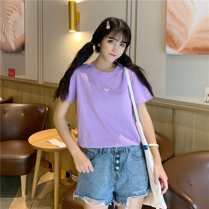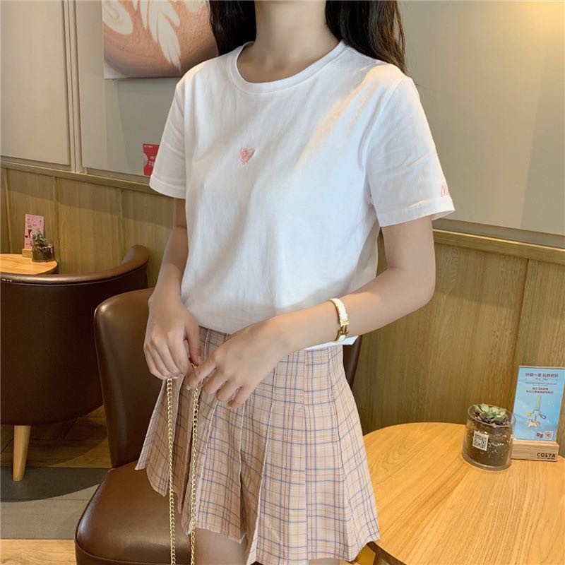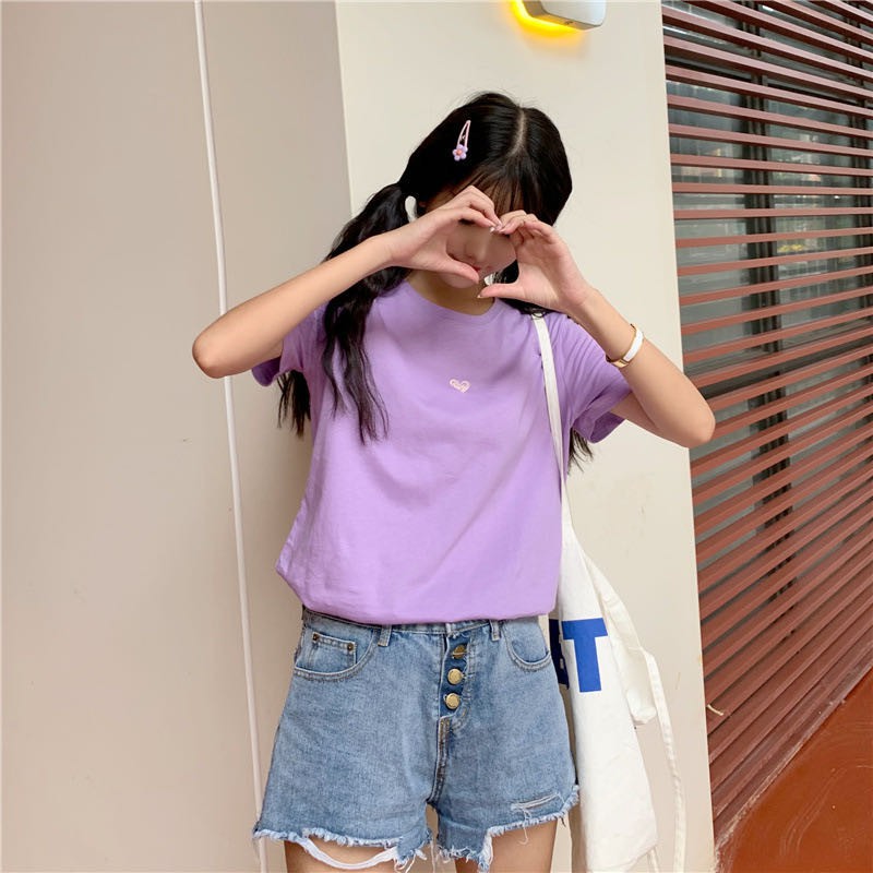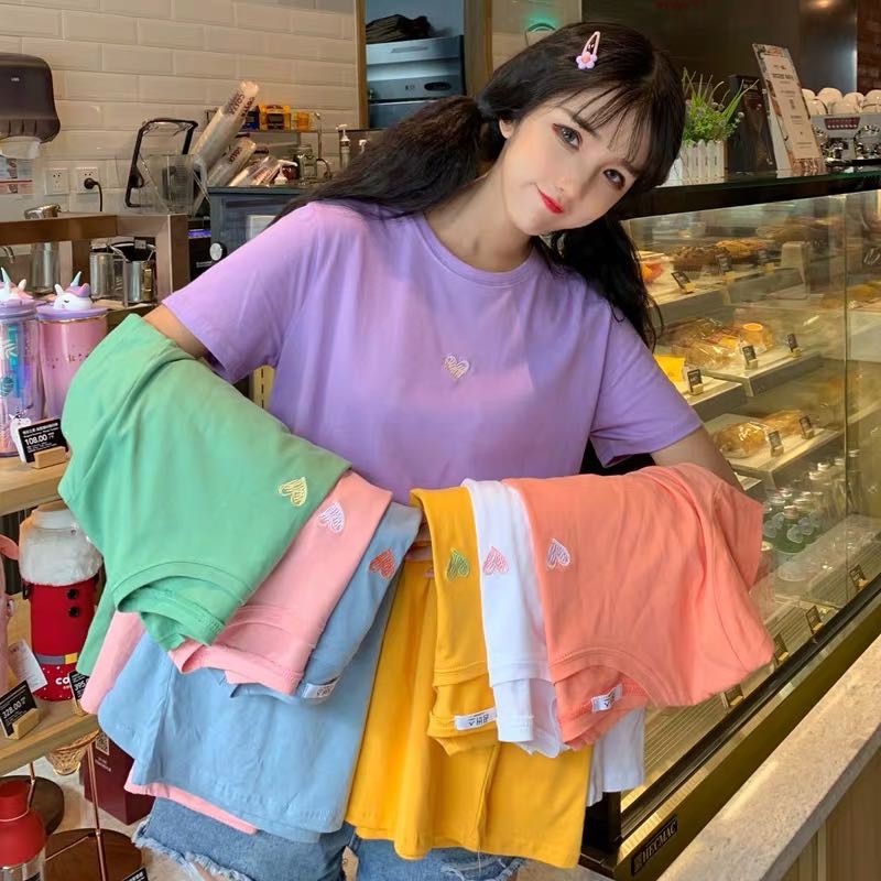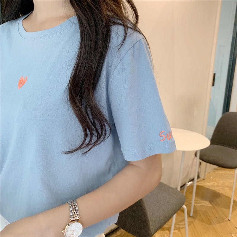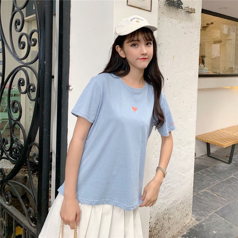 ✨ MKL ✨ เสื้อยืดแฟชั่นสตรีแขนสั้นคอกลมปักลายหัวใจทรงหลวม #9117