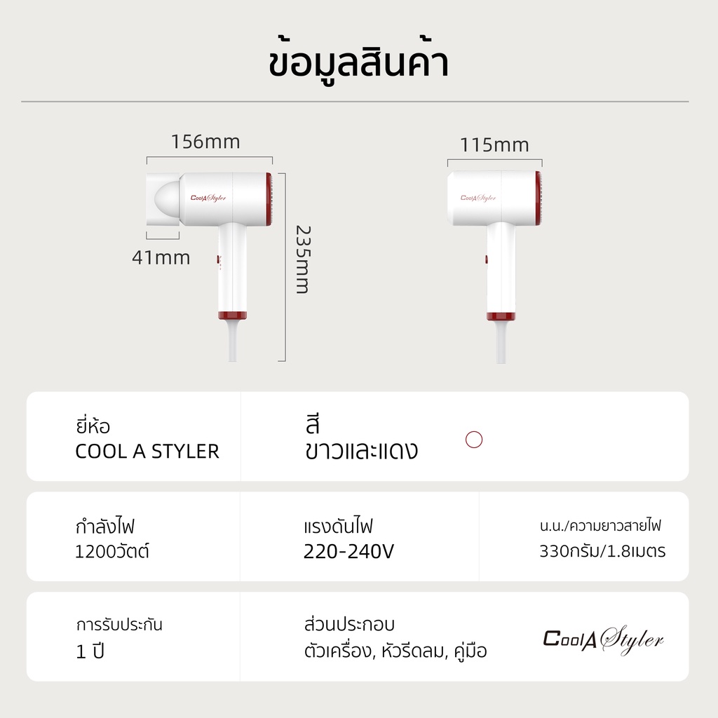 Coolastyler มอก. ไดร์เป่าผม CA-1200W hairdryer ไดเป่าผม ทันสมัย ปรับความร้อน แรงลมได้ เป่าผม รุ่นยอดฮิต ที่เป่าผม ไดร