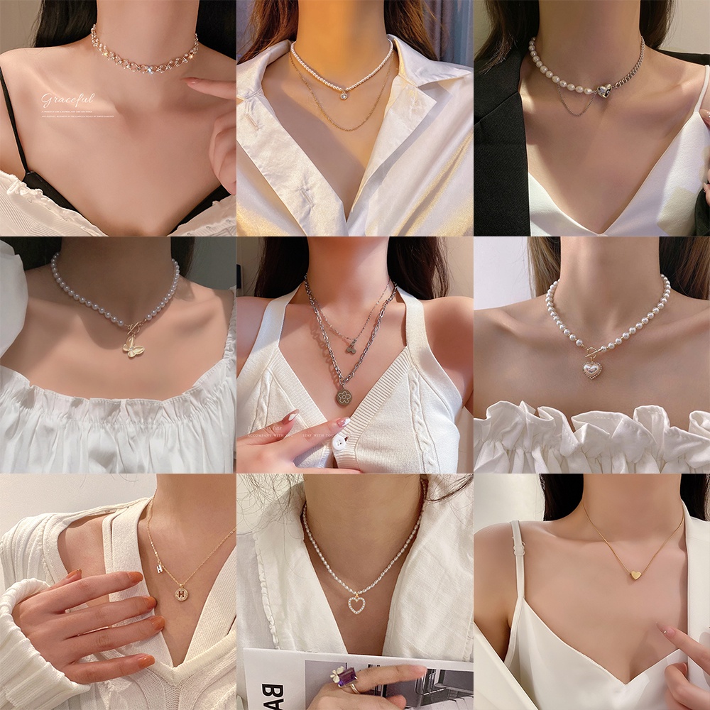 เครื่องประดับ สร้อยคอโชคเกอร์ จี้ไข่มุก และผีเสื้อ แบบครึ่งชั้น แบบสร้างสรรค์ สําหรับผู้หญิง