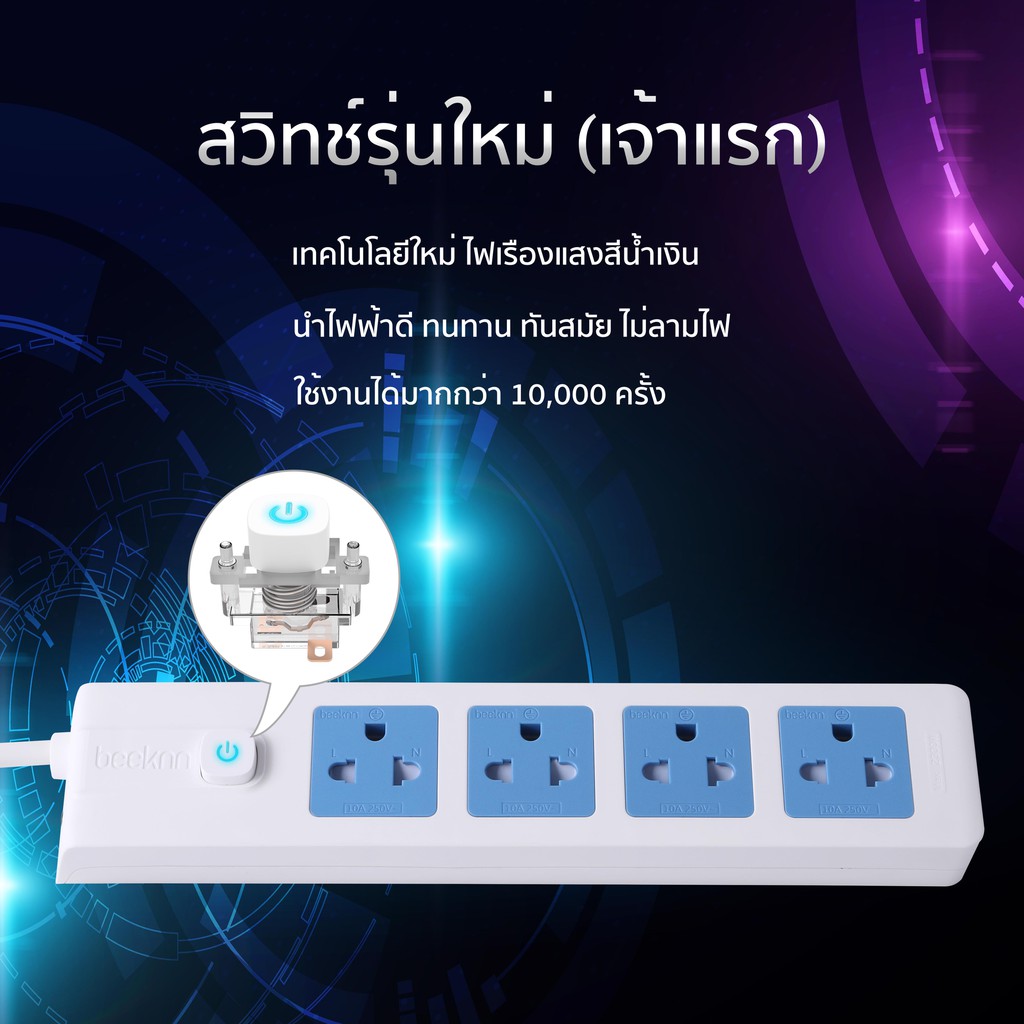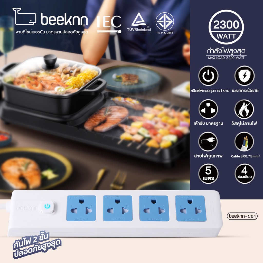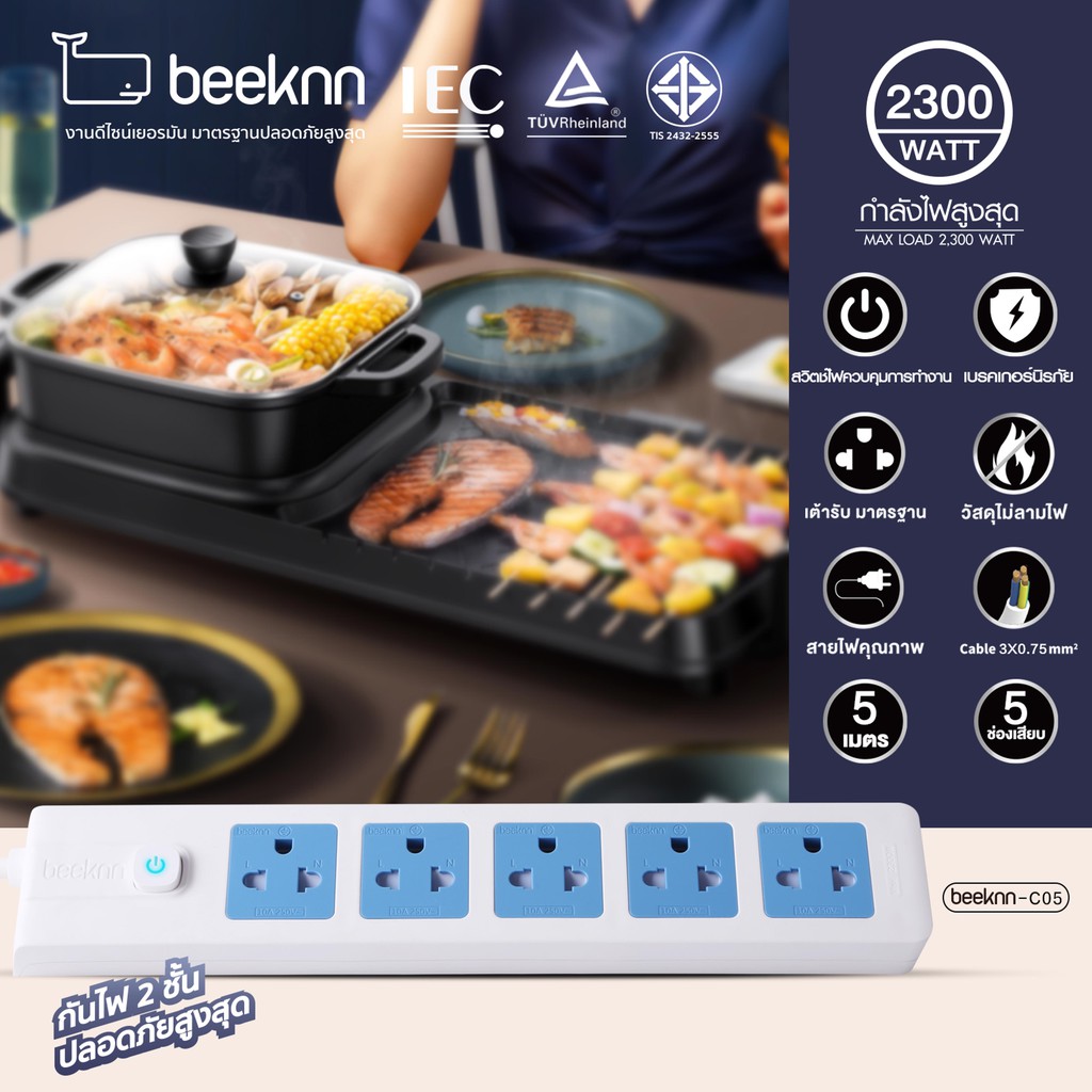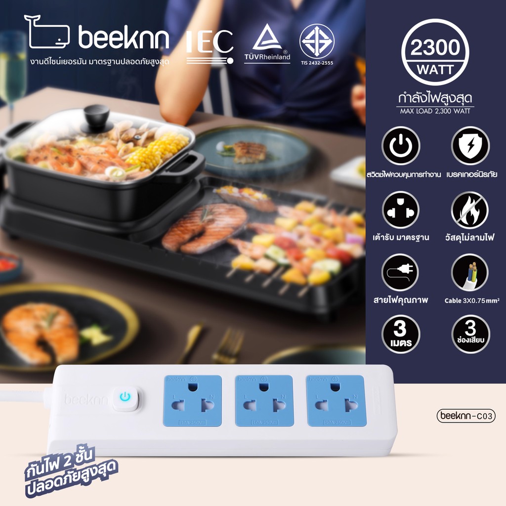 🔌BEEKNN 2-6ช่อง ปลั๊กไฟ🔌 มอก.กันไฟสองชั้น ปลั๊กพ่วง 3เมตร 5เมตร ปลั๊ก 10A2300W รางปลั๊ก ทองแดง100%