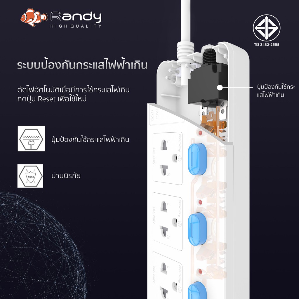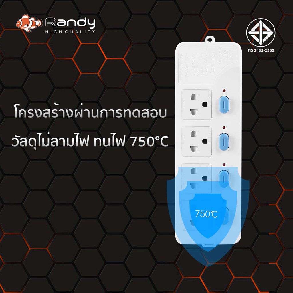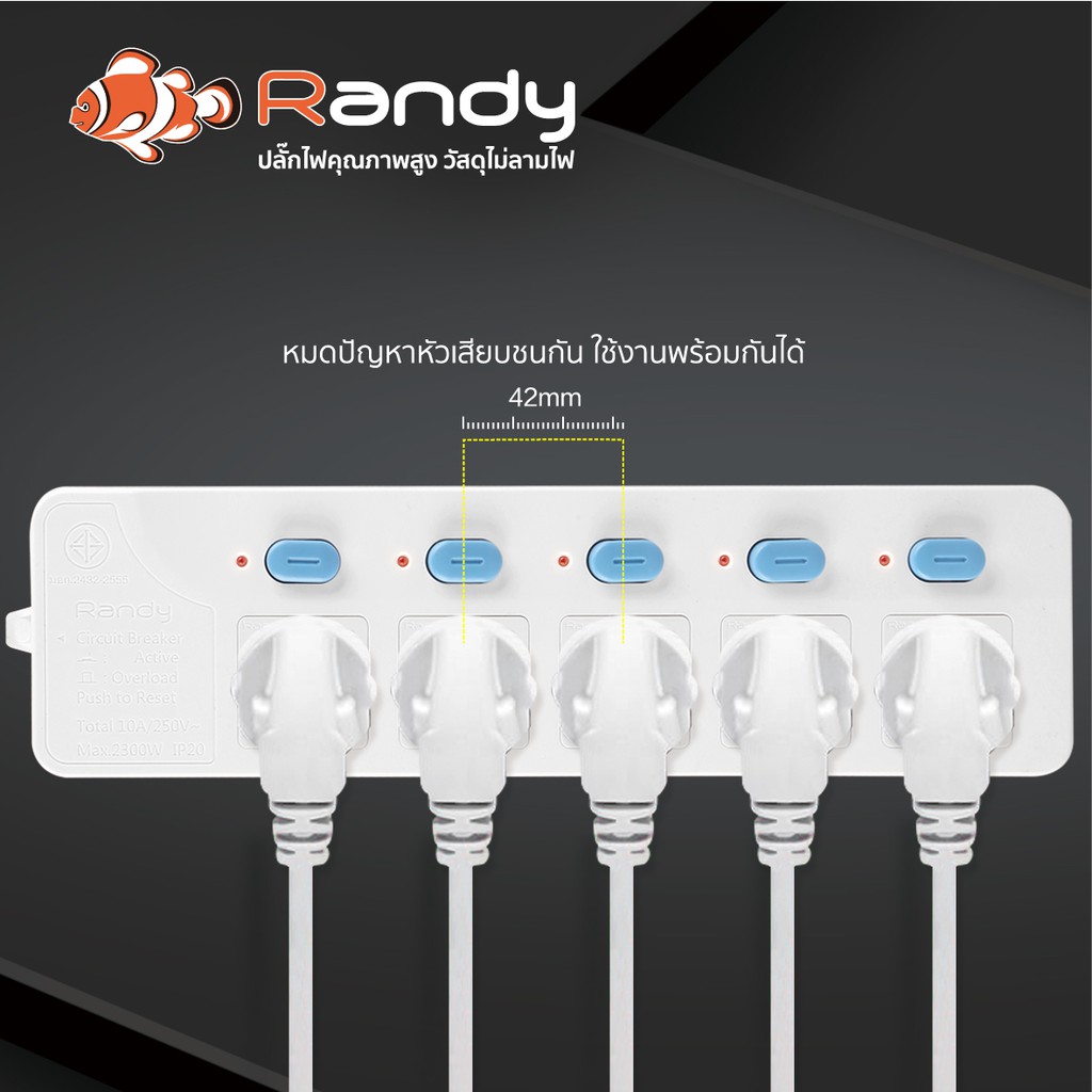 Randy88series ปลั๊กไฟ มอก. กันไฟสองชั้น 3เมตร 5เมตร ปลั๊กพ่วง 10A 2300W USB ประกัน1ปี