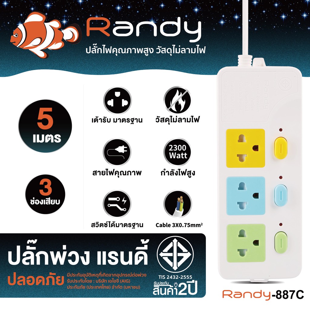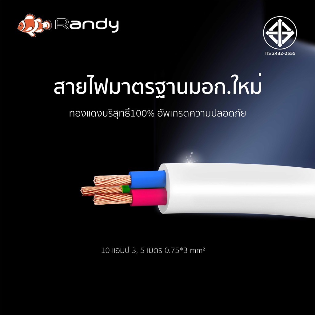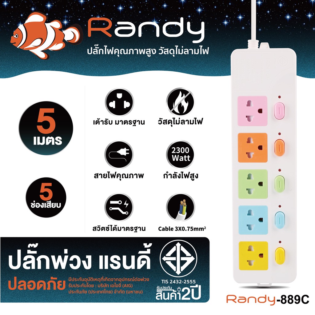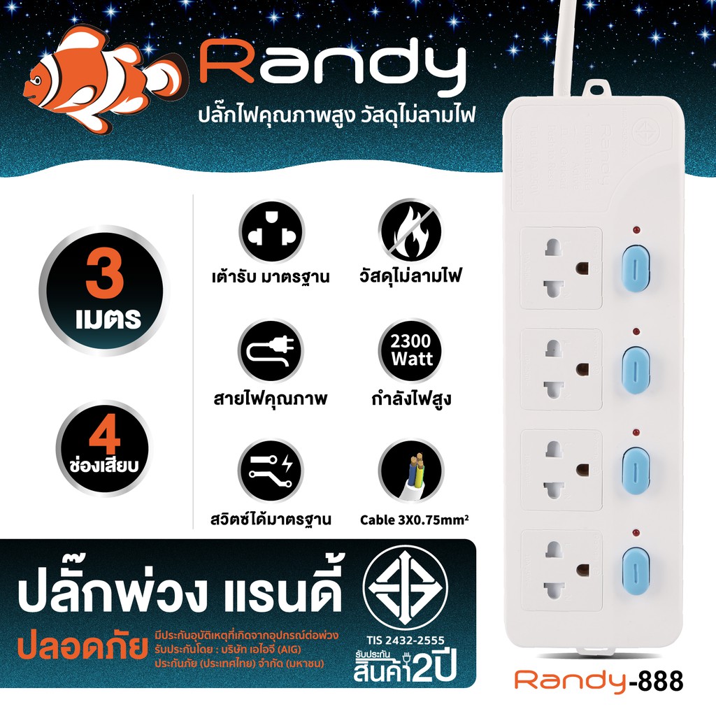 Randy88series ปลั๊กไฟ มอก. กันไฟสองชั้น 3เมตร 5เมตร ปลั๊กพ่วง 10A 2300W USB ประกัน1ปี