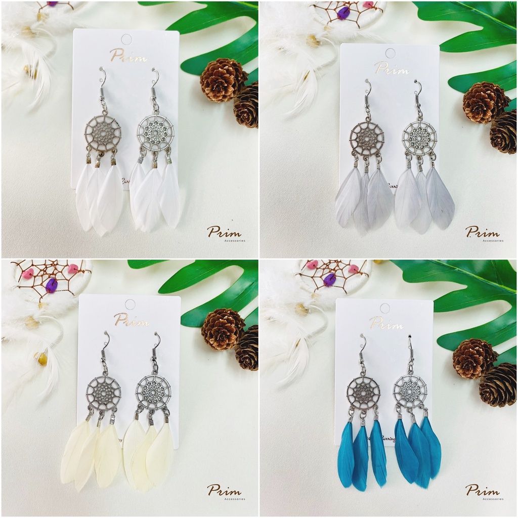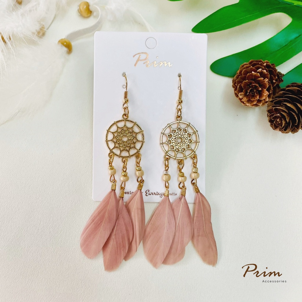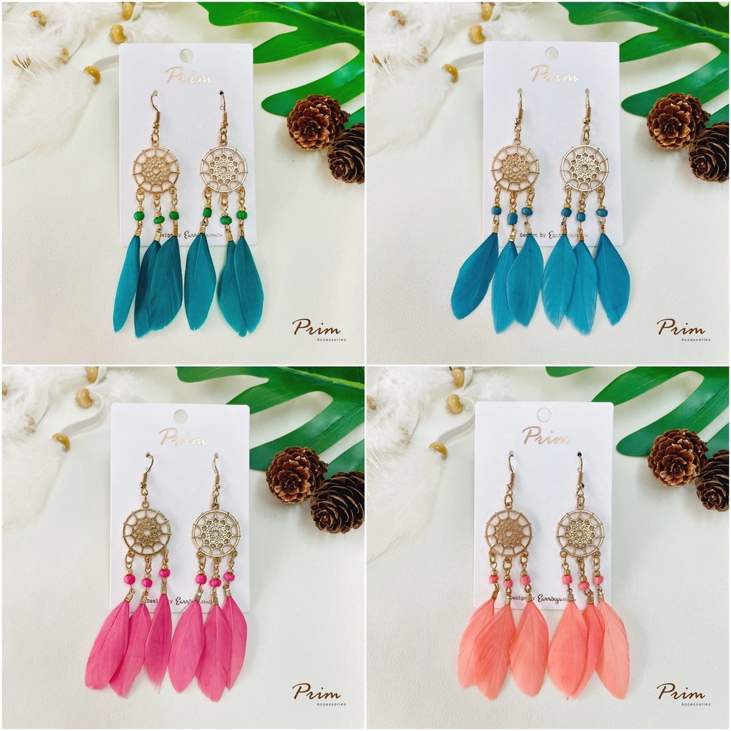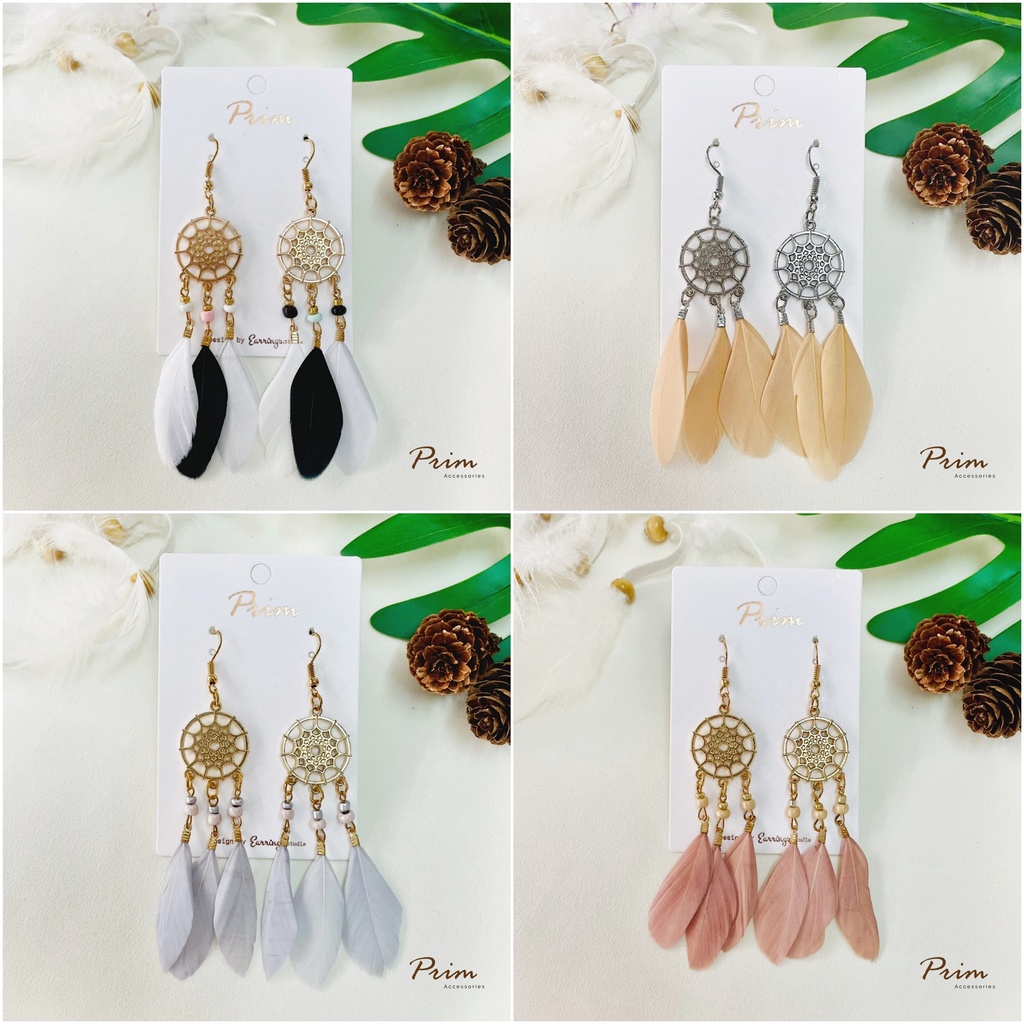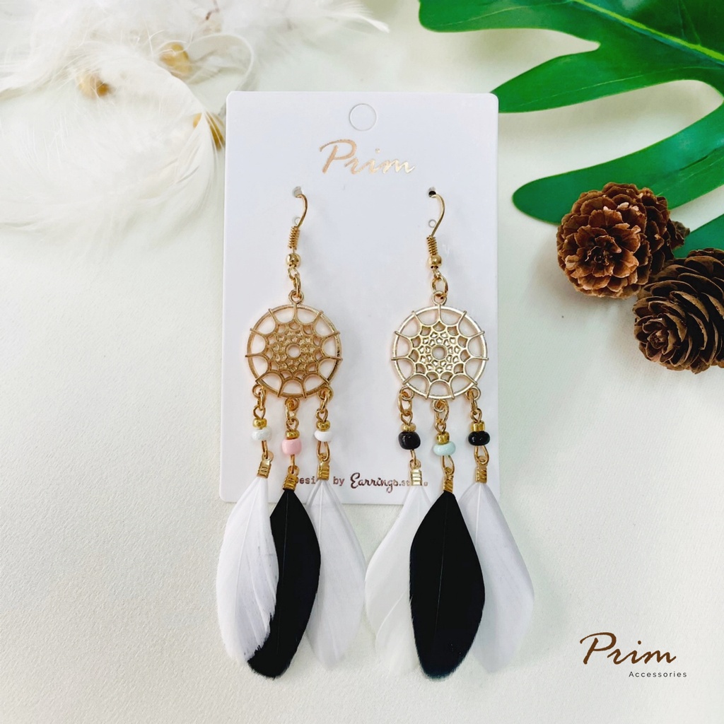 ต่างหูขนนก ลายตาข่ายดักฝัน Dream Catcher สไตล์โบฮีเมียน