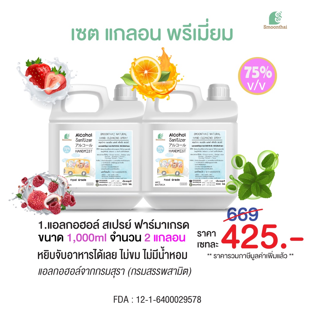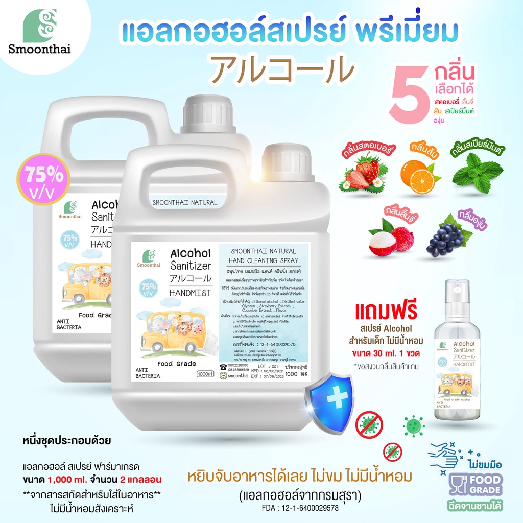 สเปรย์แอลกอฮอล์ Set พรีเมี่ยม เด็กเล็กใช้ได้ปลอดภัย ไม่ขมมือ ขนาด 1,000ml จำนวน 2 แกลอน เลือกกลิ่นได้