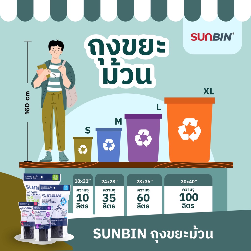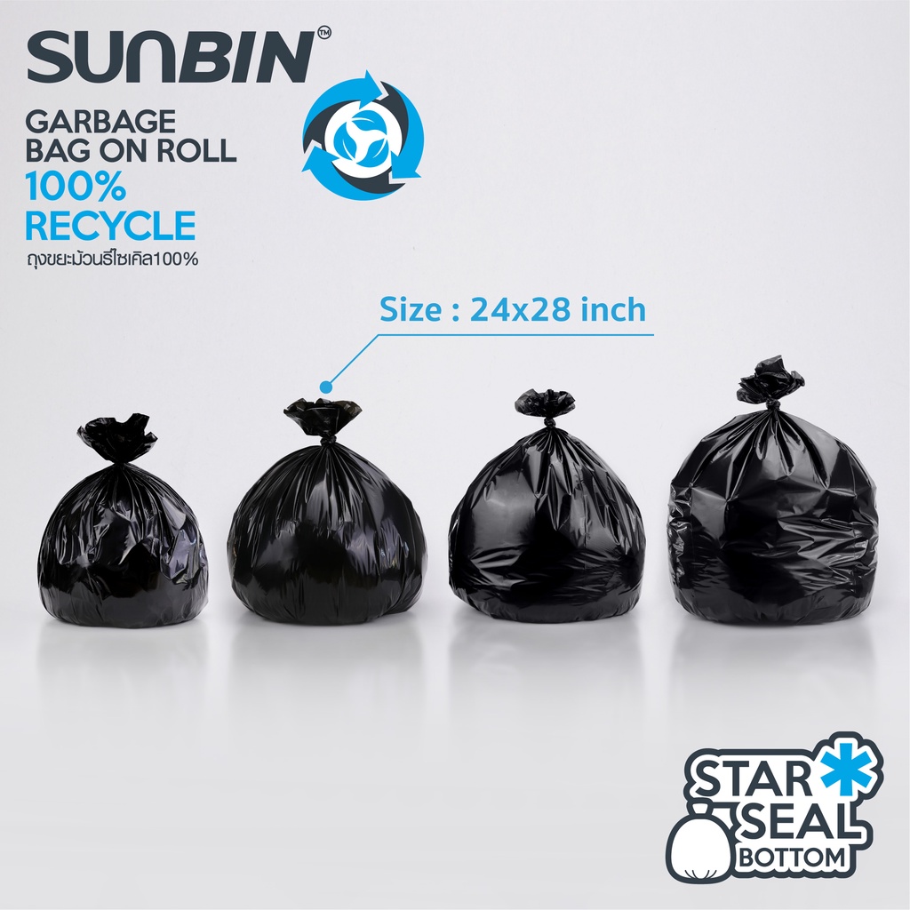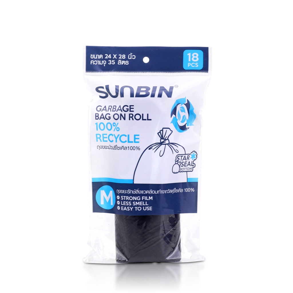 SUNBIN ถุงขยะม้วนรีไซเคิล ไซส์ M ขนาด 24x28 นิ้ว บรรจุม้วนละ 18 ใบ/แพ็ค ถุงขยะรีไซเคิลรักษ์โลก(Recycle) 100% เนื้อเหนียว